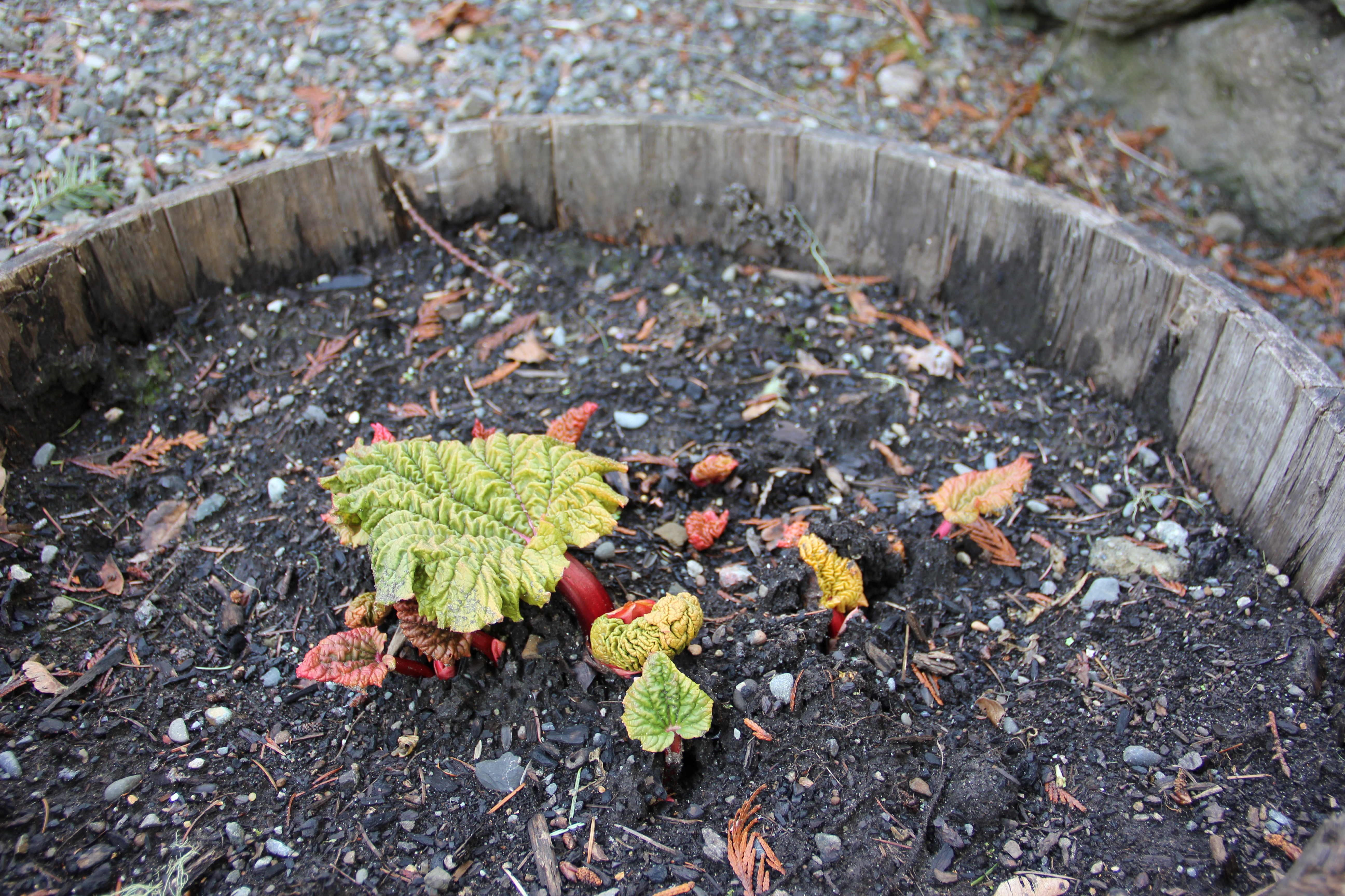 When I saw RHUBARB on the list of plantings provided by Coppertop’s original owners, I had to look up photos of young plants to learn what to look for. I also didn’t realize it’s a perennial. About all I know about rhubarb is it goes great with strawberries in pies, cobblers, and homemade jam. Good thing I have two large raised beds of beautiful strawberries plus the gazillion wild strawberry vines.