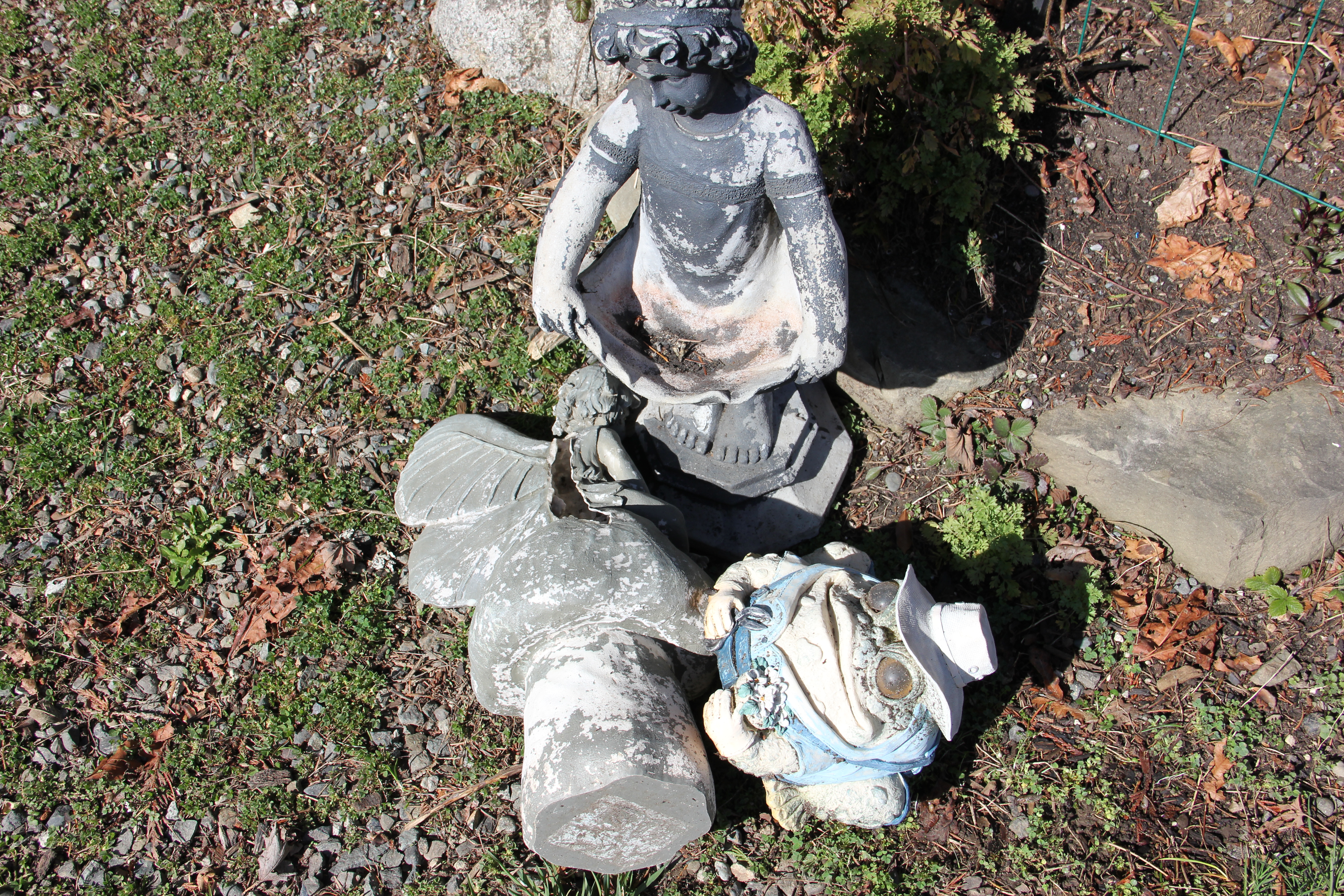 These items are a small portion of some truly unfortunate garden “art” left behind. Although art is a very personal judgement call, these items are just sad plastics to me. Maybe they were gifts from grandchildren and were treasured, so they weren’t sad before. Now they are broken, faded, and begging to be removed to make way for more glorious blooms. The bulgy-eyed frog in a hat takes the cake.