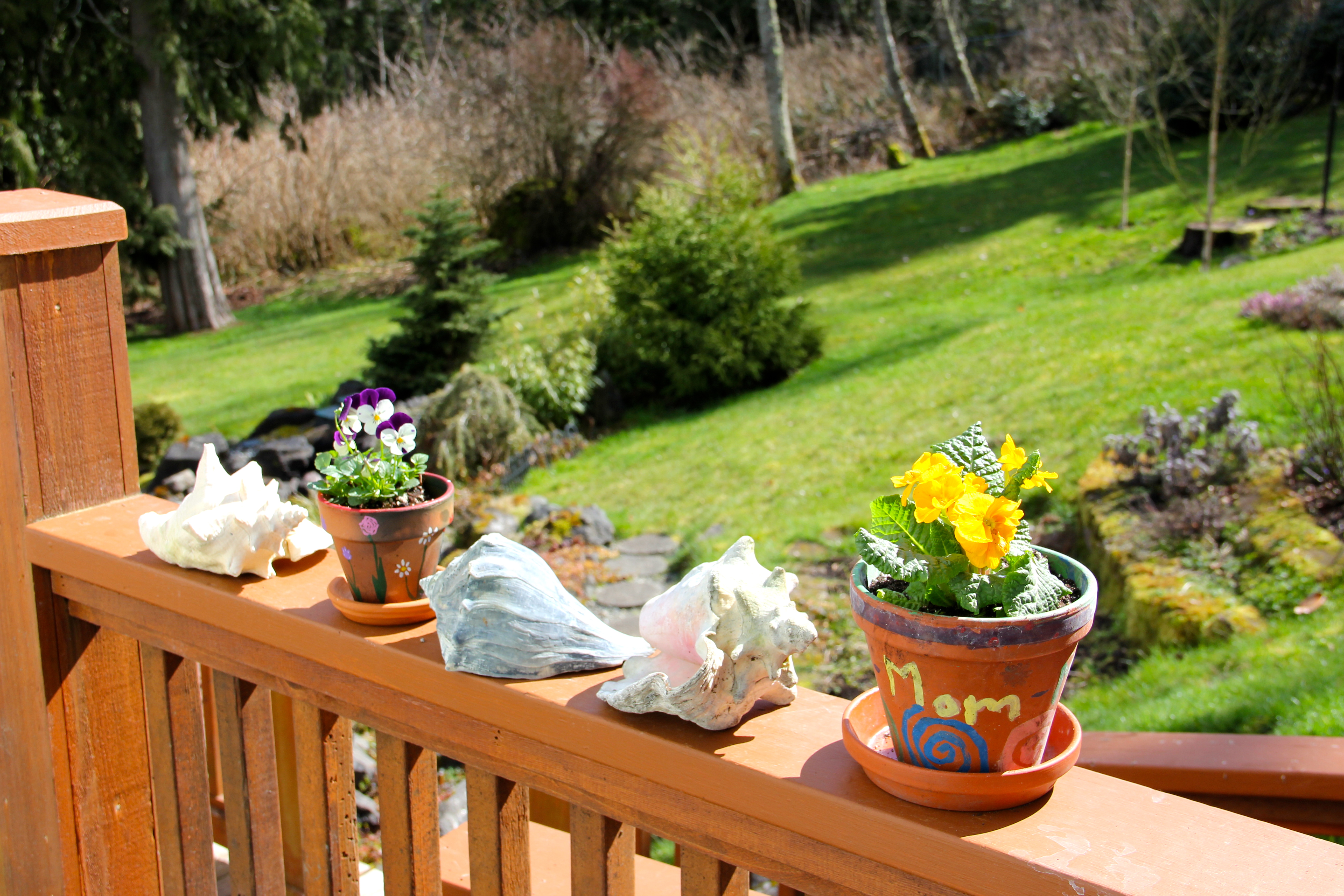 Even though adding color to the decks would be pretty, I don’t plan to fill the large pots yet since we need to refinish the wood this summer and the heaviest pots can be challenging to move. Wheeled platforms may be in our near future!