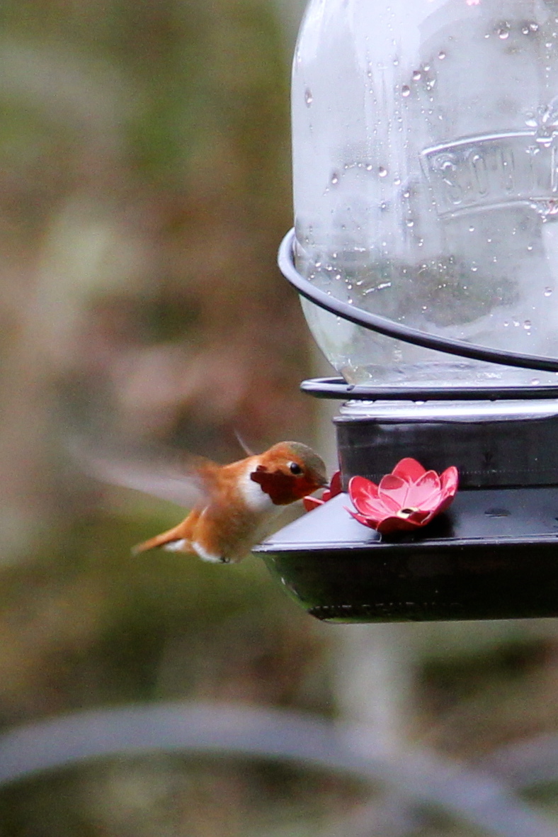 Sipping coffee and birdwatching out the kitchen window early on my birthday morning is a great way to start the day! This little fella is a rufous hummingbird. First task of the day: To cook more hummingbird food with 1 part sugar to 4 parts water, boiled then cooled. No need for red food color; the birds find the feeder regardless of the color of the liquid.