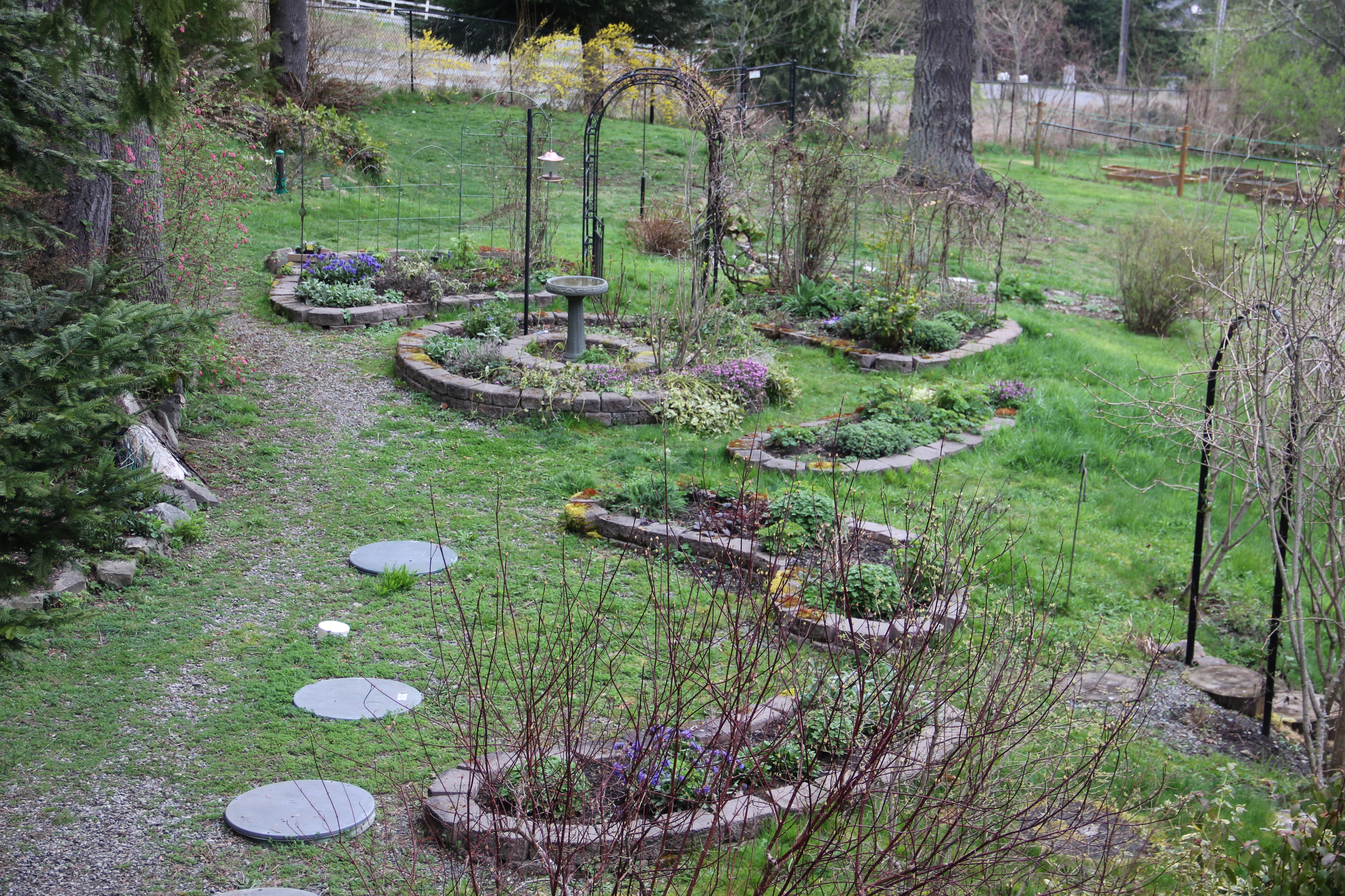 Our perennial beds are thriving in the sunshine with their mounded green foliage and just the beginning of first flowers. I’m pleased that we can view the changes in this garden through the living room window and from the deck.