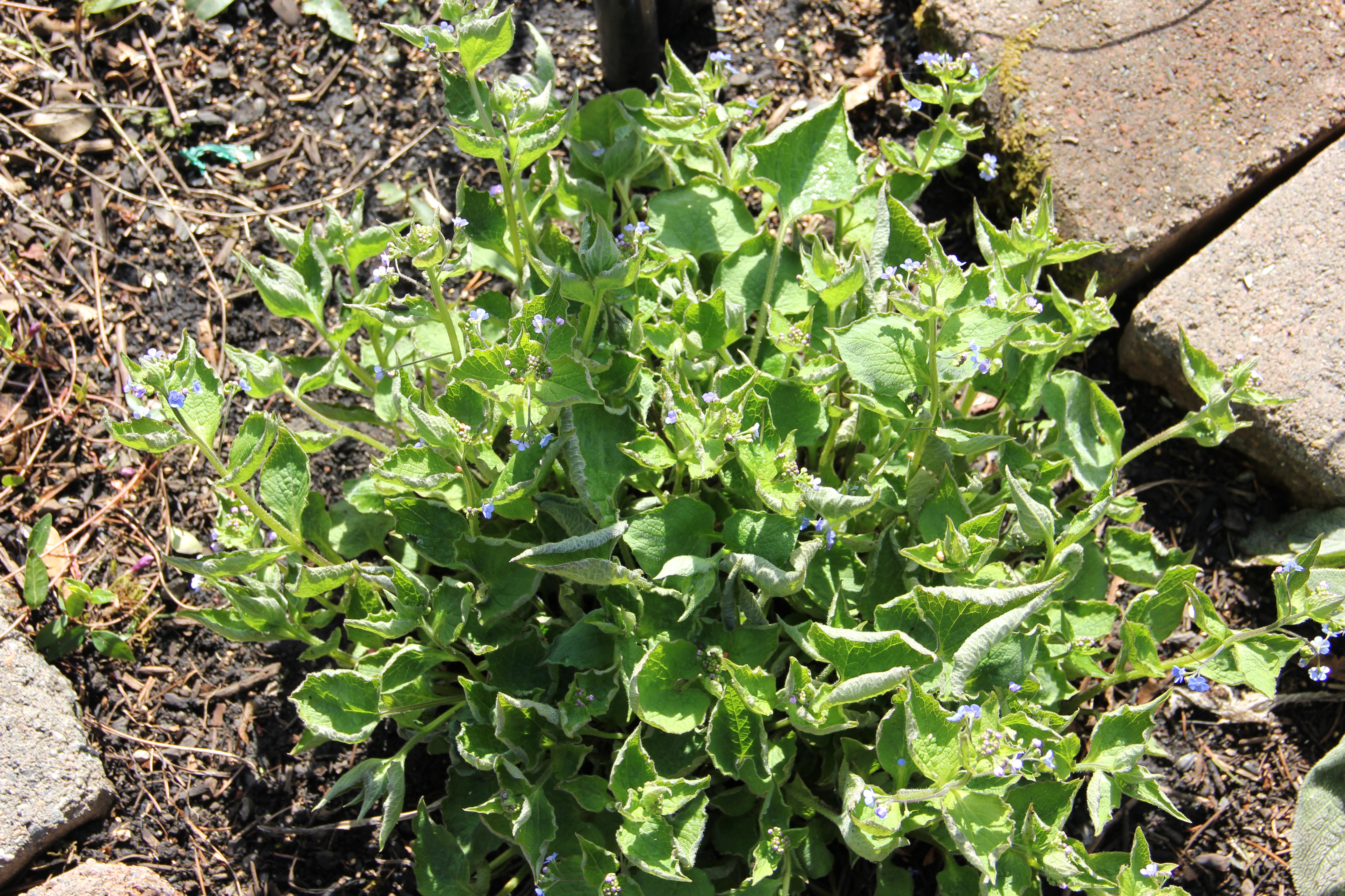 I was unfamiliar with the below tiny blue-flowered plant, but have learned it is Brunnera Macrophylla or Siberian bugloss — not a very pretty name for this sweet specimen! It is also called false forget-me-not. The leaves, which grow more heart-shaped later in the season, have a tendency to curl, and the delicate sprays of flowers are long lasting.