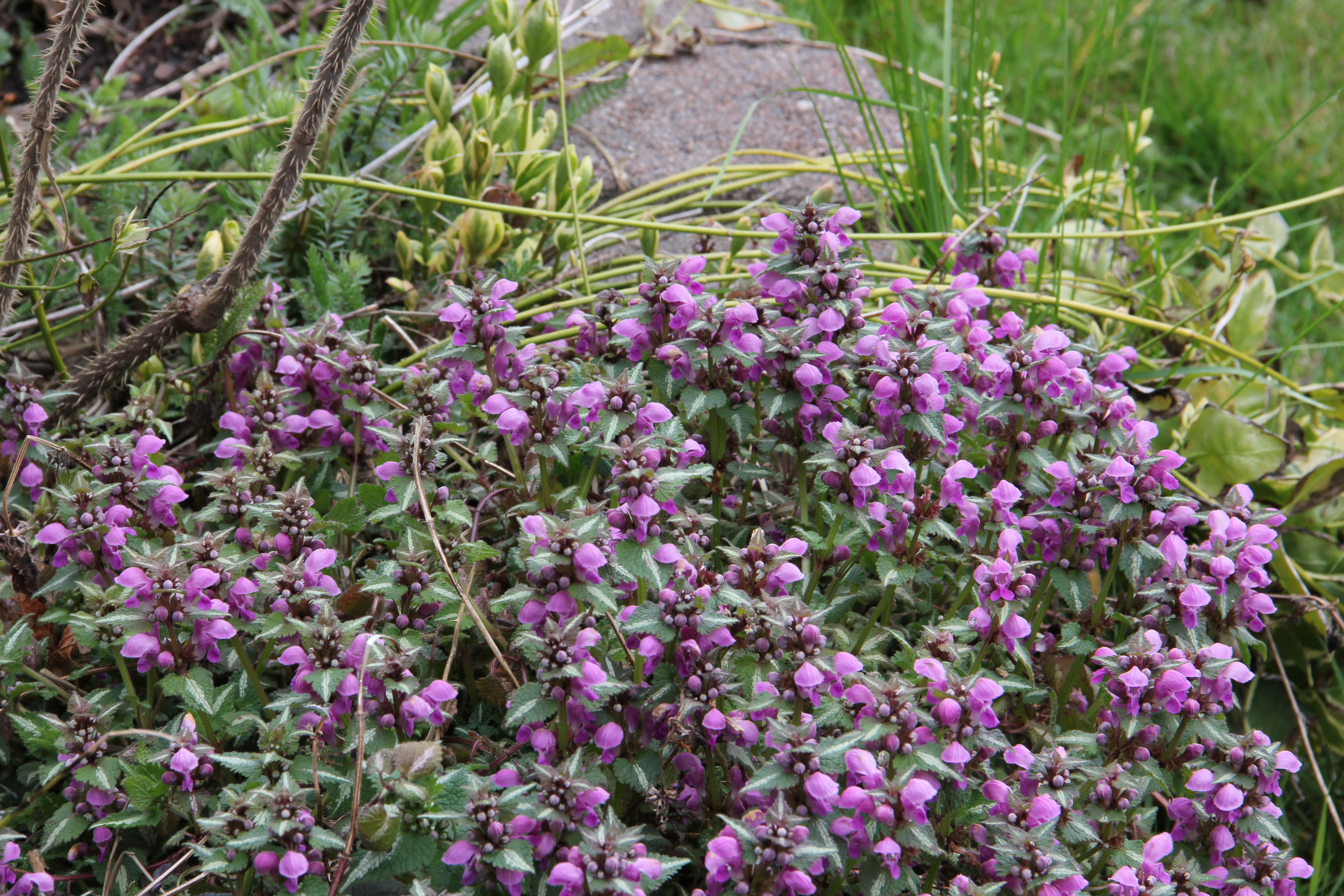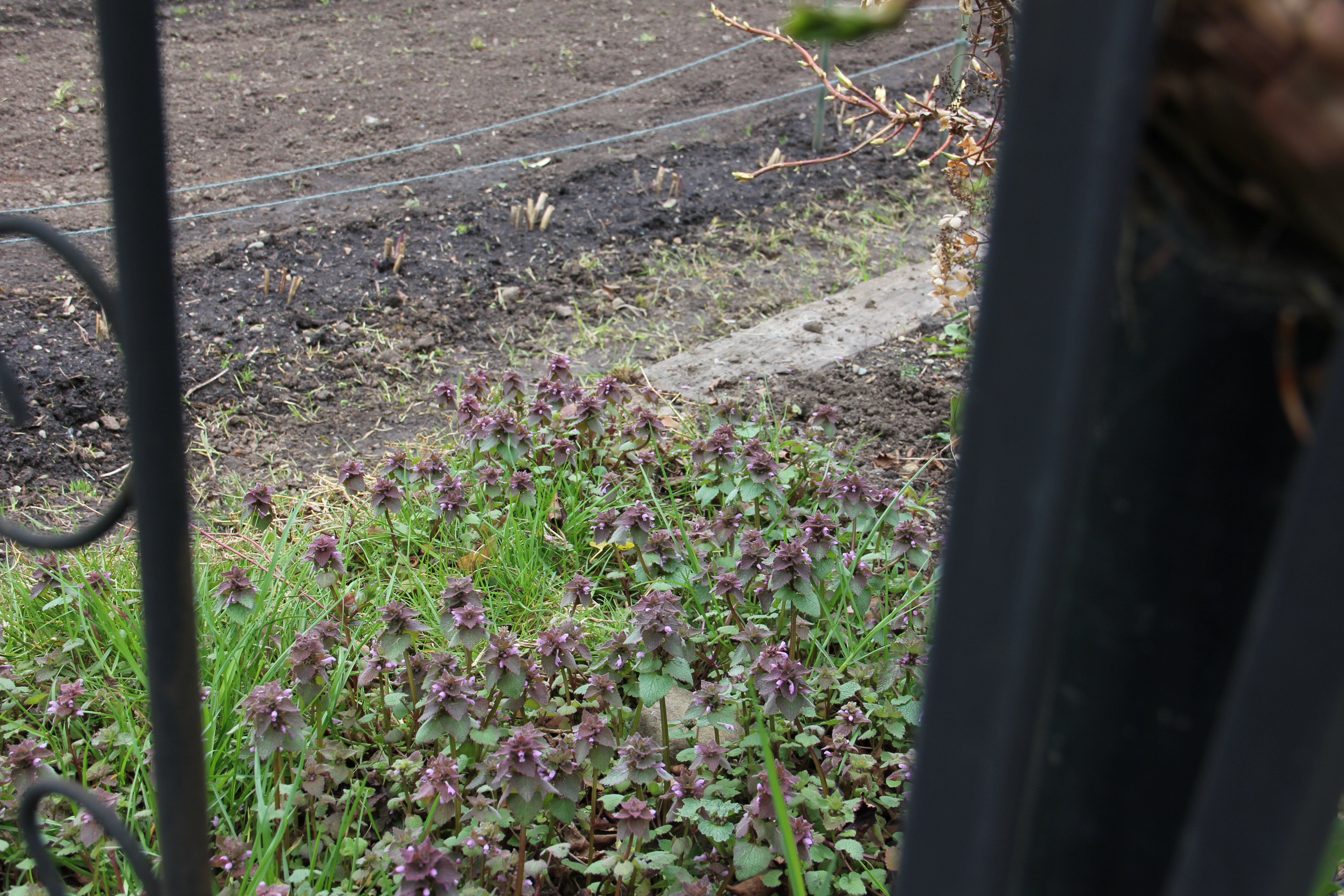 From a website about turf weeds: “Deadnettle is one of the first plants to flower after snow melt in the spring. Appearance in lawns will be linked to thin or bare areas that experienced some disturbance in the previous fall.” This makes sense as our veggie garden has bare soil edges which require repeated tilling or hoeing and weeding. The fact that this deanettle is growing very close to the asparagus row means I should probably keep it in check and not allow it to spread, as pretty as it is. We know weeds grow like, well… weeds. Most weeds are annuals. The lamium (which is confusingly the plural of “lamium”) in our flower beds are perennial.