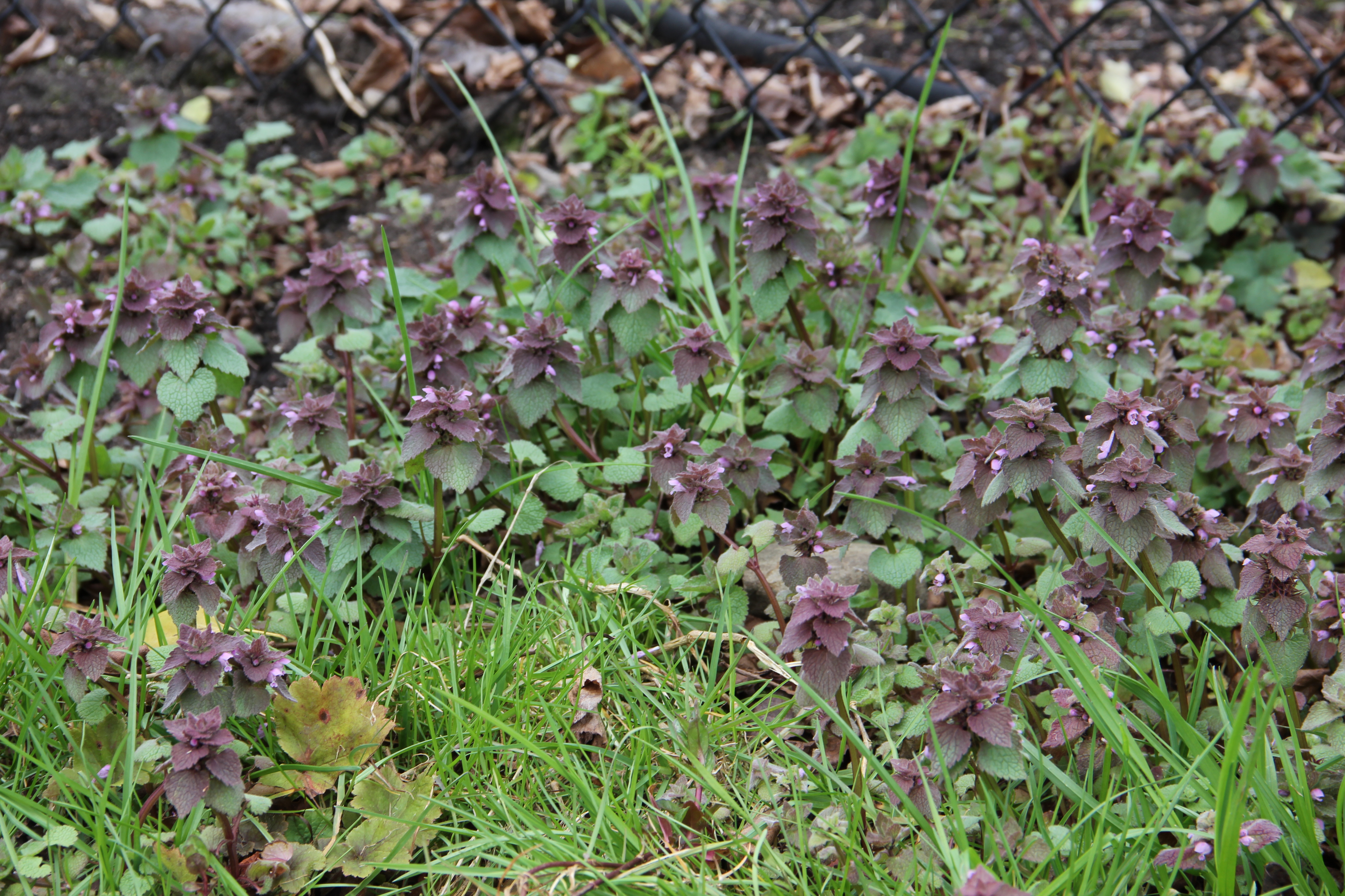 Update on 4/23: The battle against the weedy deadnettle has evolved into a massive effort all over Coppertop. Meanwhile a lovely pale pink variety of the Lamium maculatum is blooming in the perennial beds: