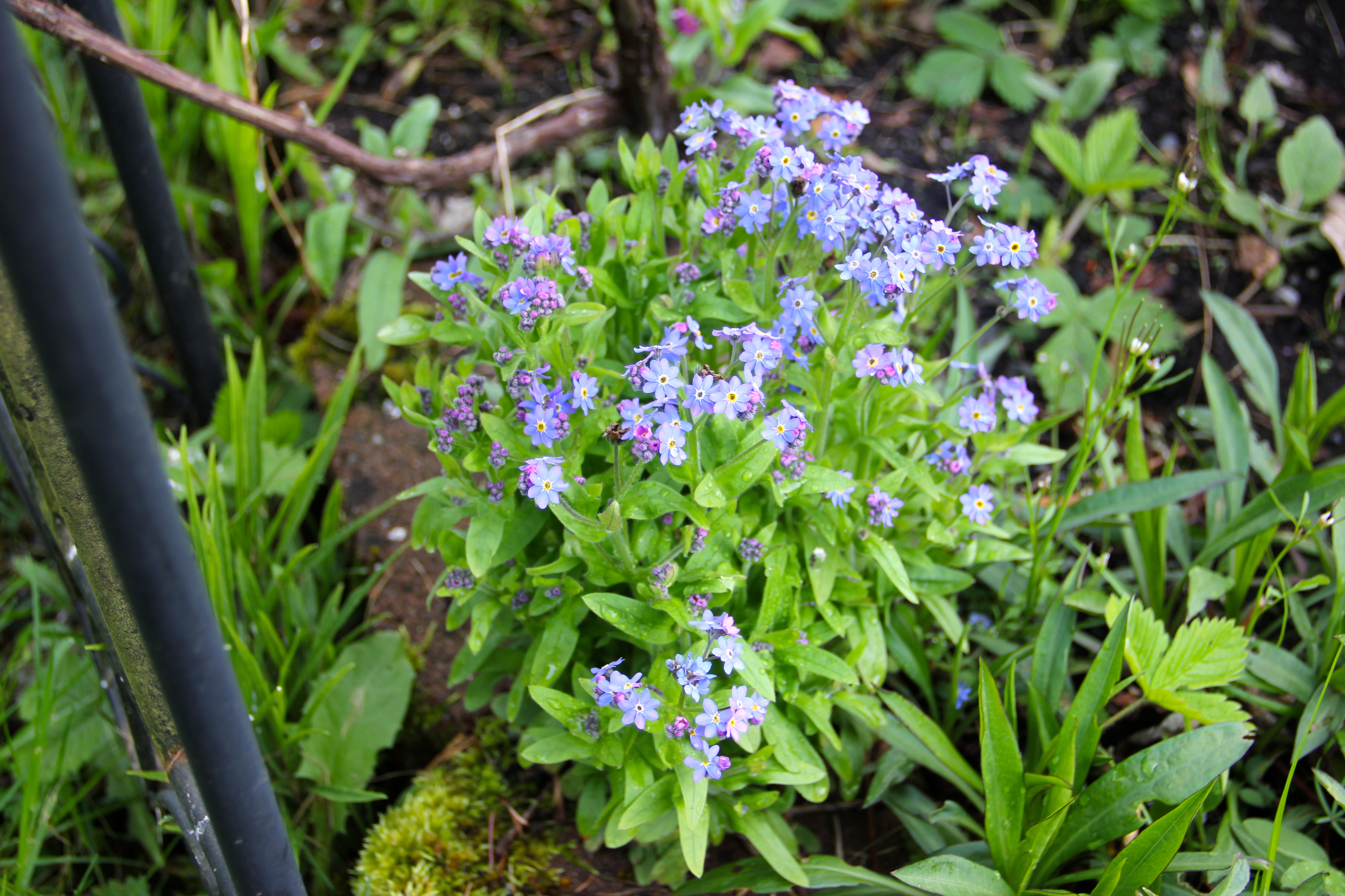 Forget-Me-Nots are scattered throughout the perennial beds and in front of the house, and probably due to birds and breezes spreading them, they randomly appear in odd locations around Coppertop.