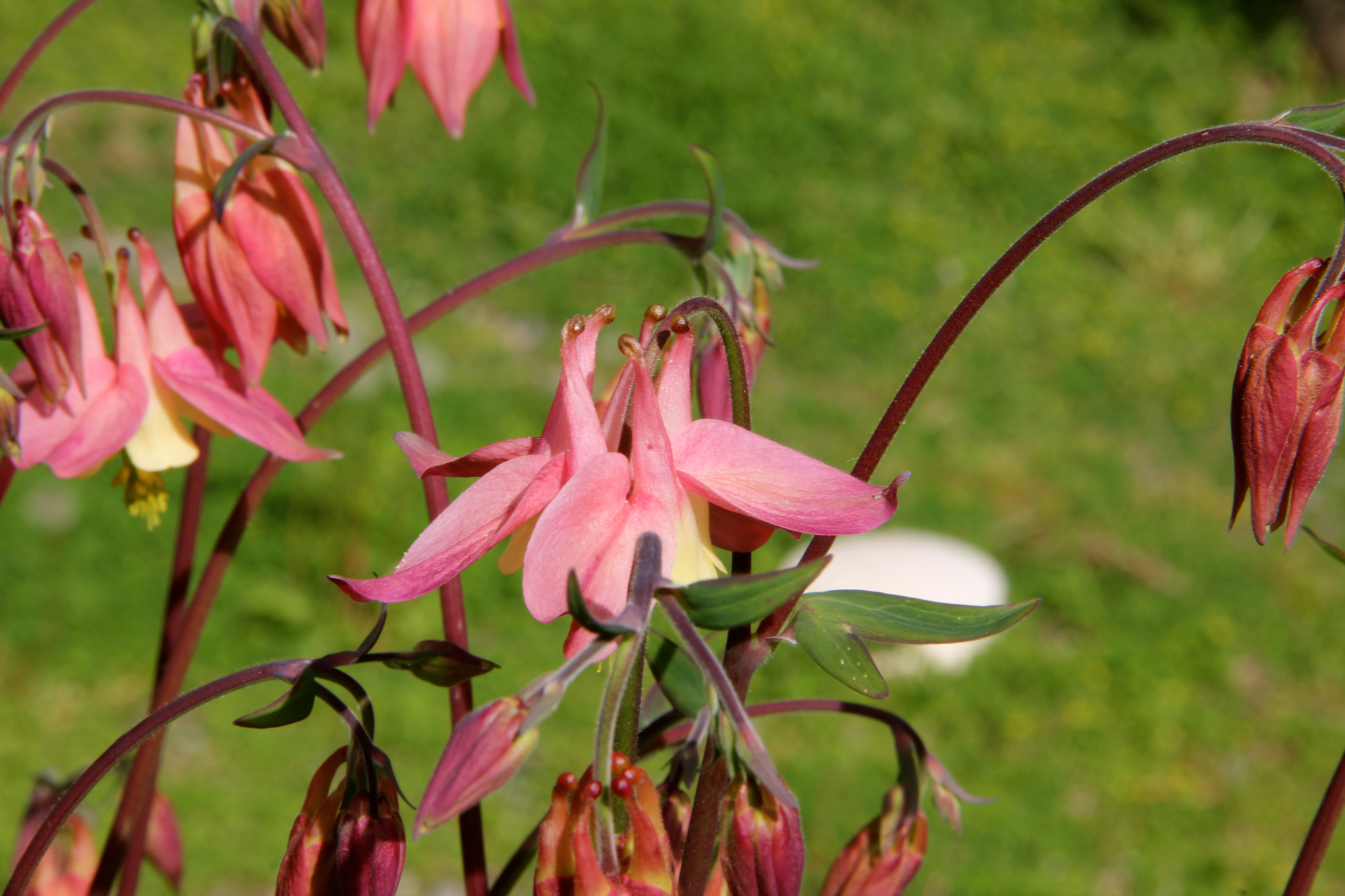 Columbines belong to the species Aquilegia, from the Latin word for eagle; the flower’s five long spurs form a shape similar to an eagle’s claw. The common name “columbine” comes from the Latin for dove; there is a resemblance of the underside of the flower (near the stem) to a cluster of doves. 🙂 I see doves clearly in this pink specimen: