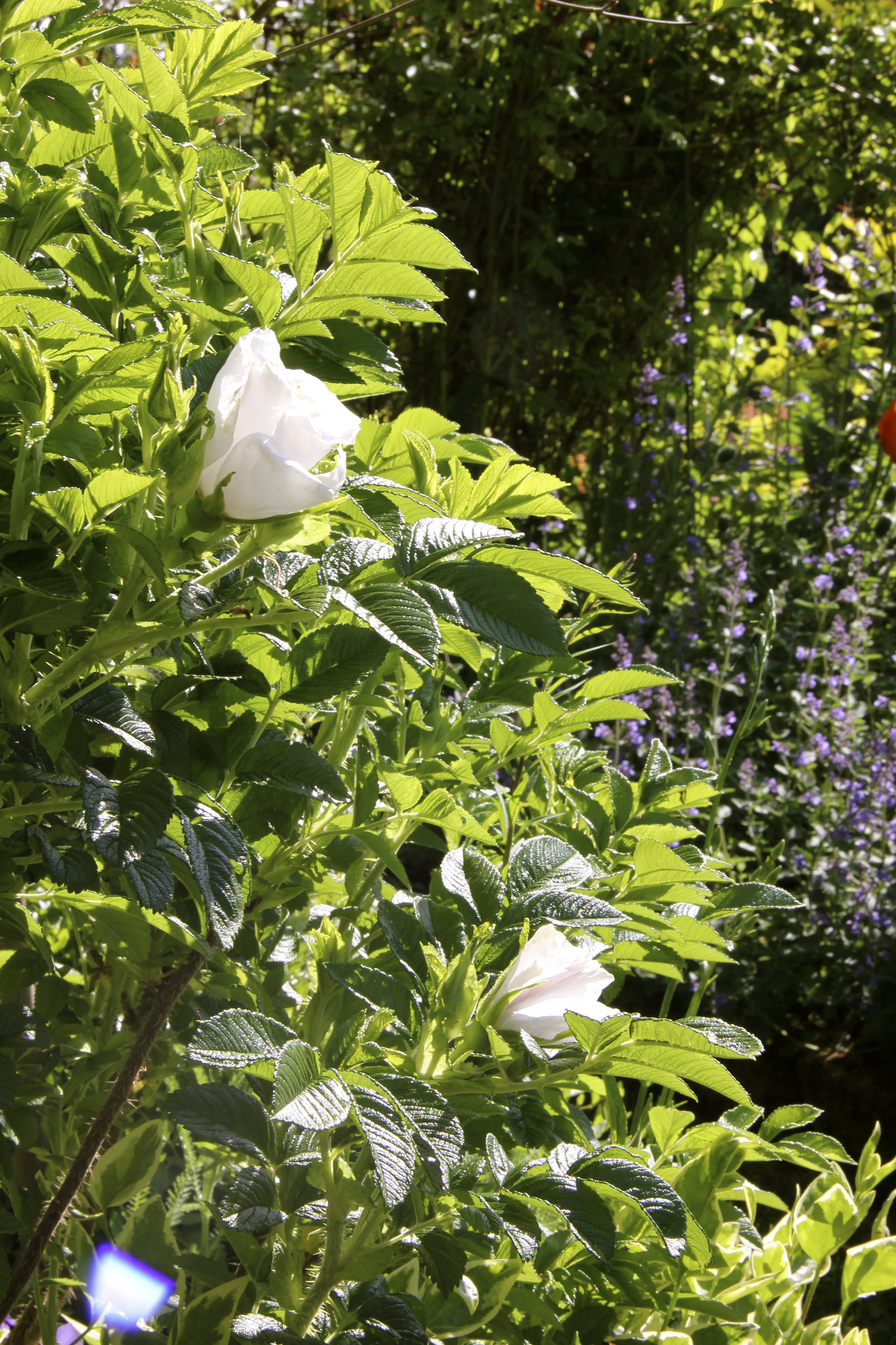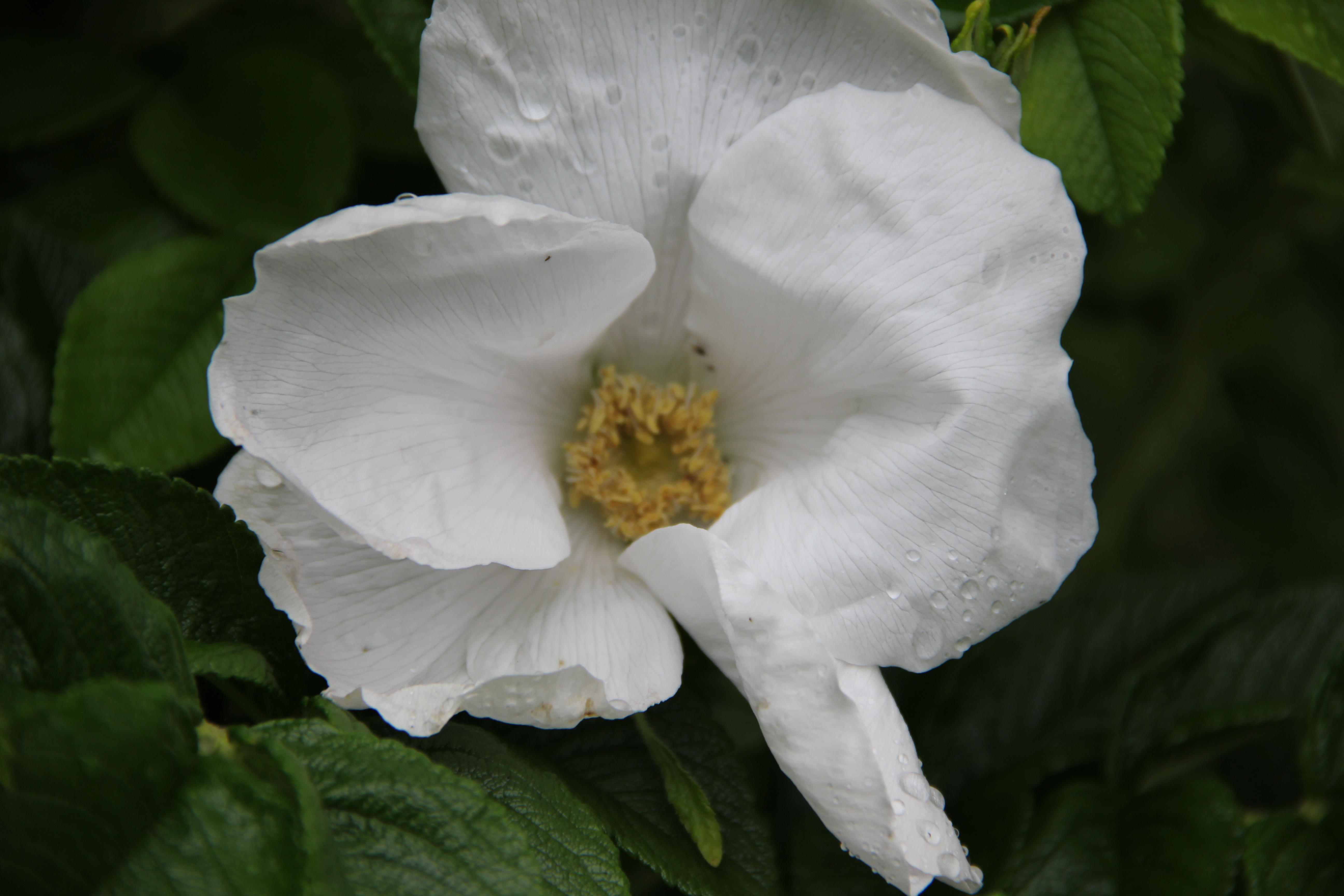 I am no rose expert and have only grown a few. While trying to identify this white rose from the thousands of varieties, one outstanding feature is the deeply wrinkled leaves. I believe this is a Rosa rugosa, an heirloom shrub. Gardened for centuries in Korea, China, and Japan, and also in Europe since at least 1870, it is extremely cold-hardy and can thrive even in USDA zone 2. Its ideal is temperate coastal maritime conditions, like right here on the Olympic Peninsula. I’ve learned that virtually the opposite of hybrid roses, rugosas are practically immune to diseases, fungal or other — excellent news.