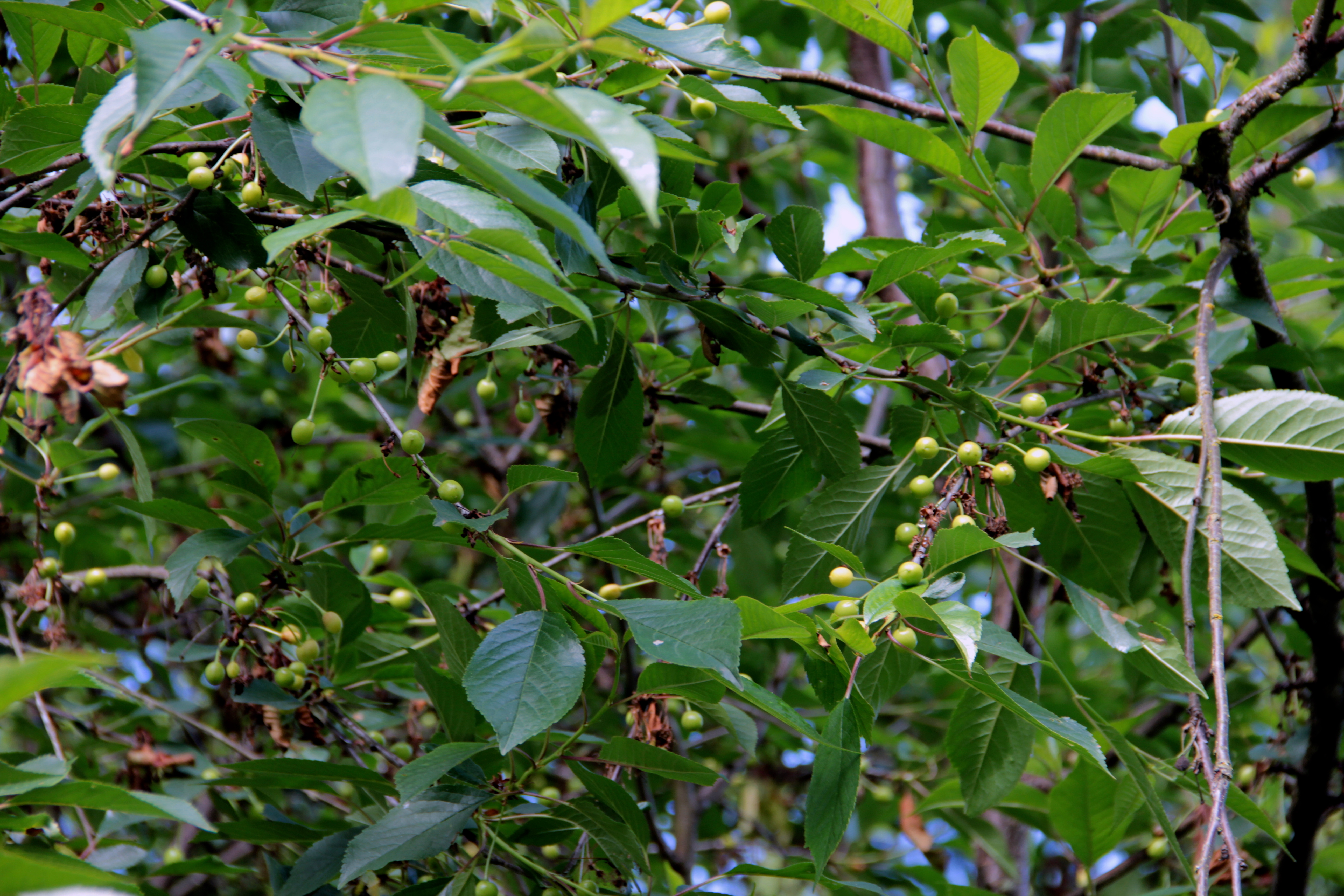 At certain times of day the still-green cherries pop vibrantly against the leafy branches.
