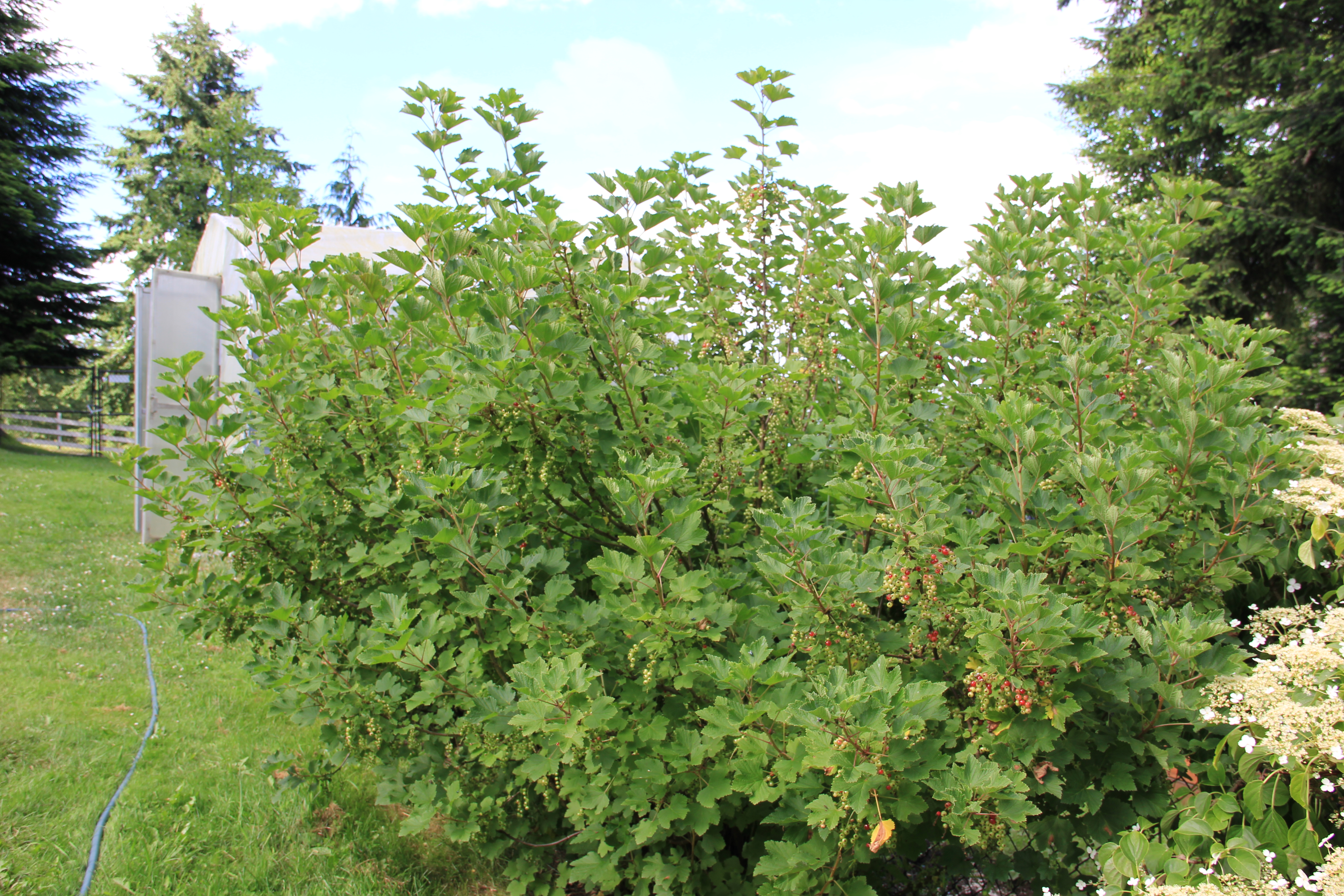 We have six very large currant bushes, Ribes rubrum, at Coppertop that reach six to eight feet in height, and we’ve been picking the tart, mildly sweet currants as they turn deep red. They are loaded with vitamin C and too many seeds — good fiber, but not so fun to cook with. I love the way the bright fruits glow in the sun.