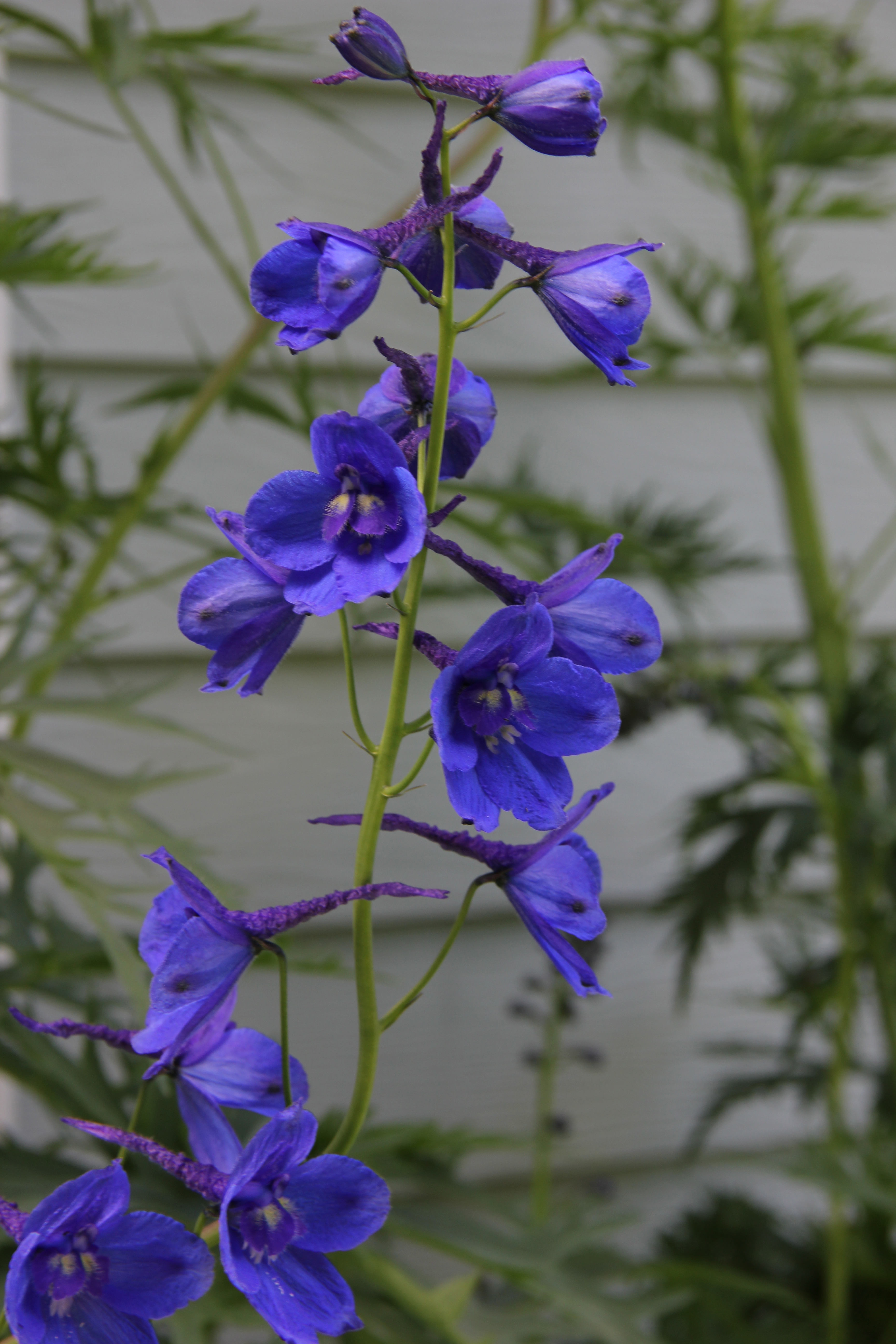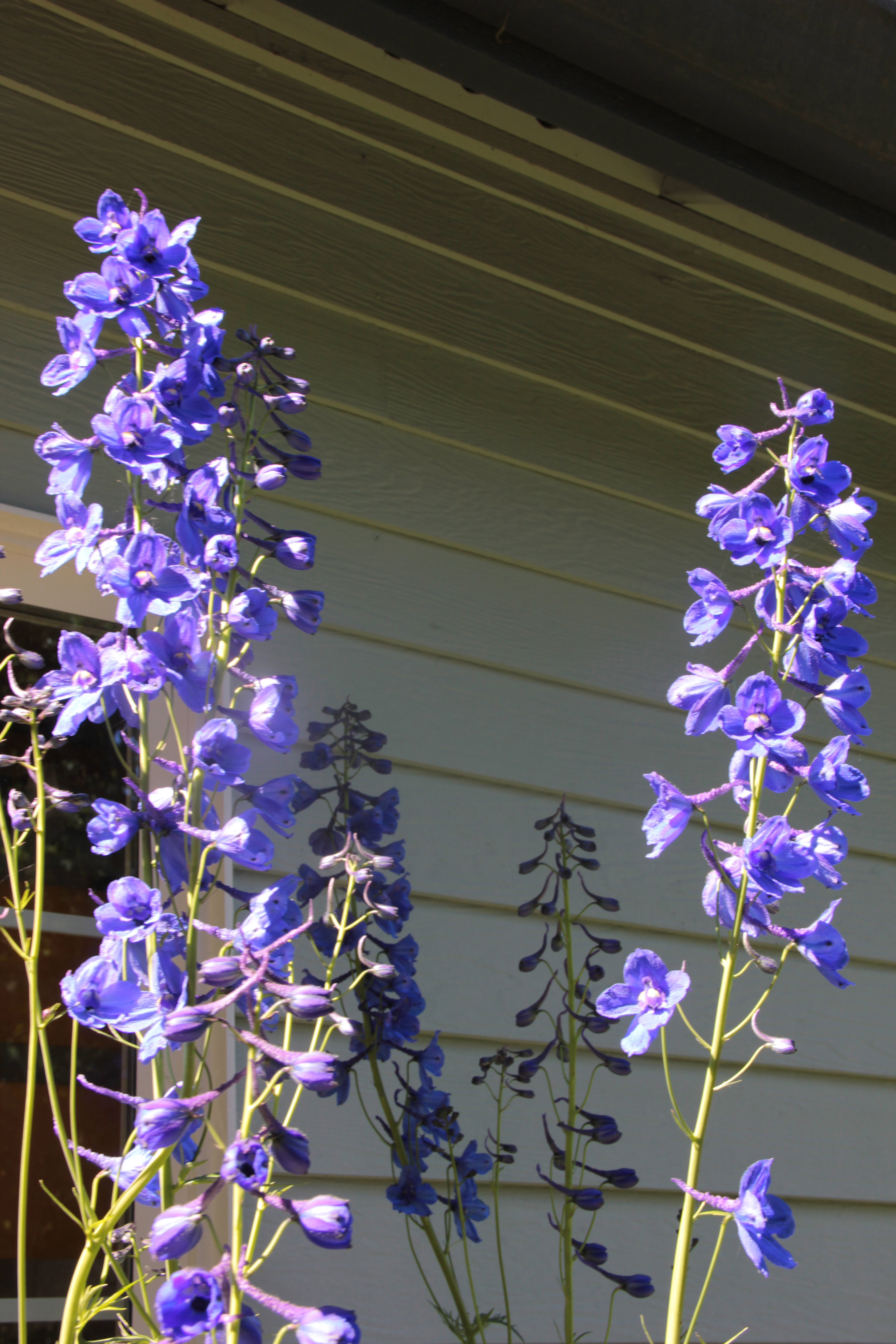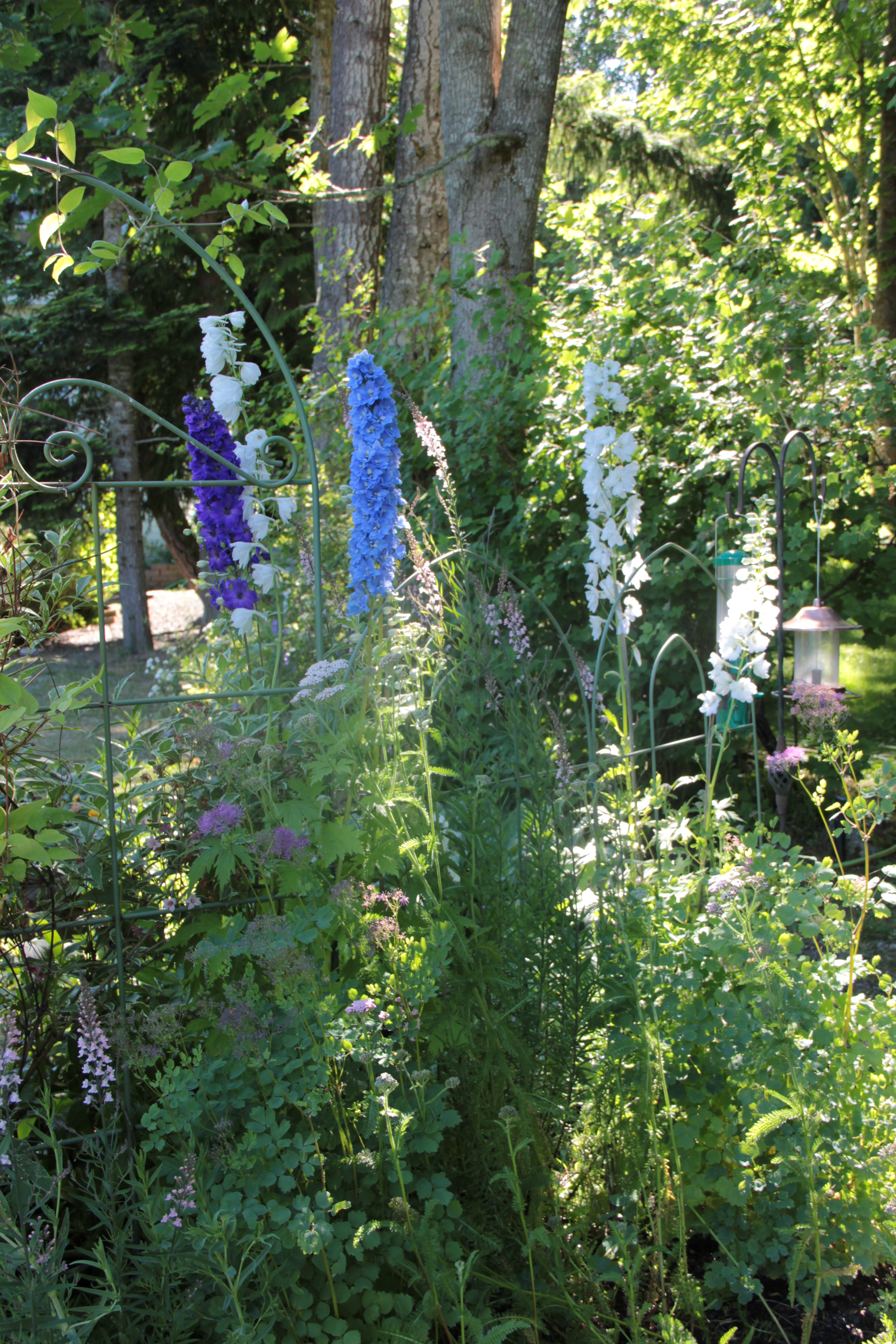 As we celebrate July 4th with family and friends and light our long sparklers (legal in WA) , I think it’s appropriate to also celebrate a long-stemmed flower that rivals the dazzle of sparklers this holiday! Perennial delphiniums, sometimes called larkspurs, grow well in the cool, moist climate of the Pacific Northwest. Ours in one perennial bed and in the small garage garden began blooming a couple of weeks ago and now some of them have reached a fully open stage. The colors of these flower towers are stunning.