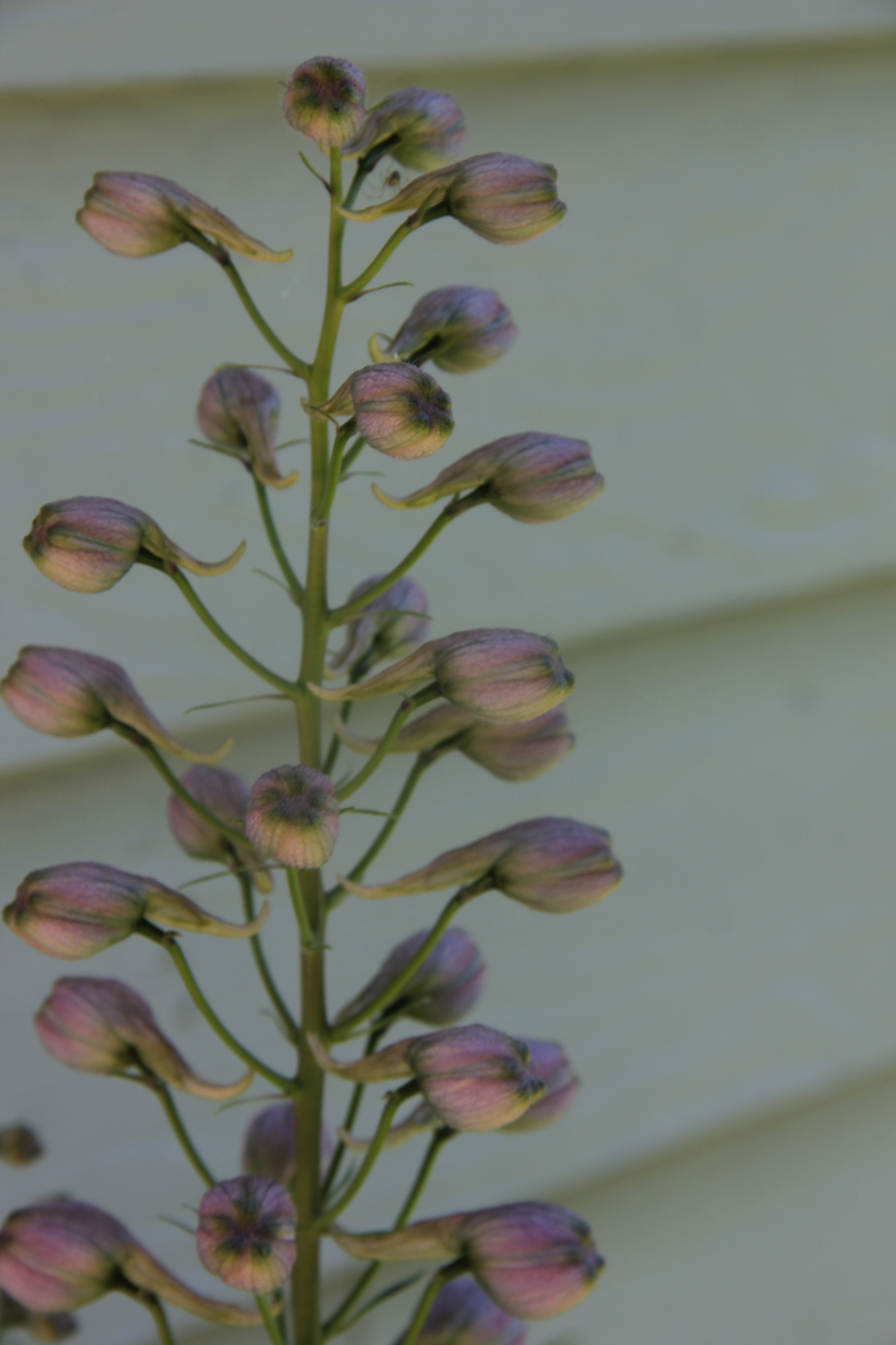 The name delphinium comes from the Greek word for “little dolphin” because of the shape of a gland in the blossoms that produces nectar. You can see the shape of a dolphin – actually more like a tadpole — in this photo of a young flower still in bud in my garden.