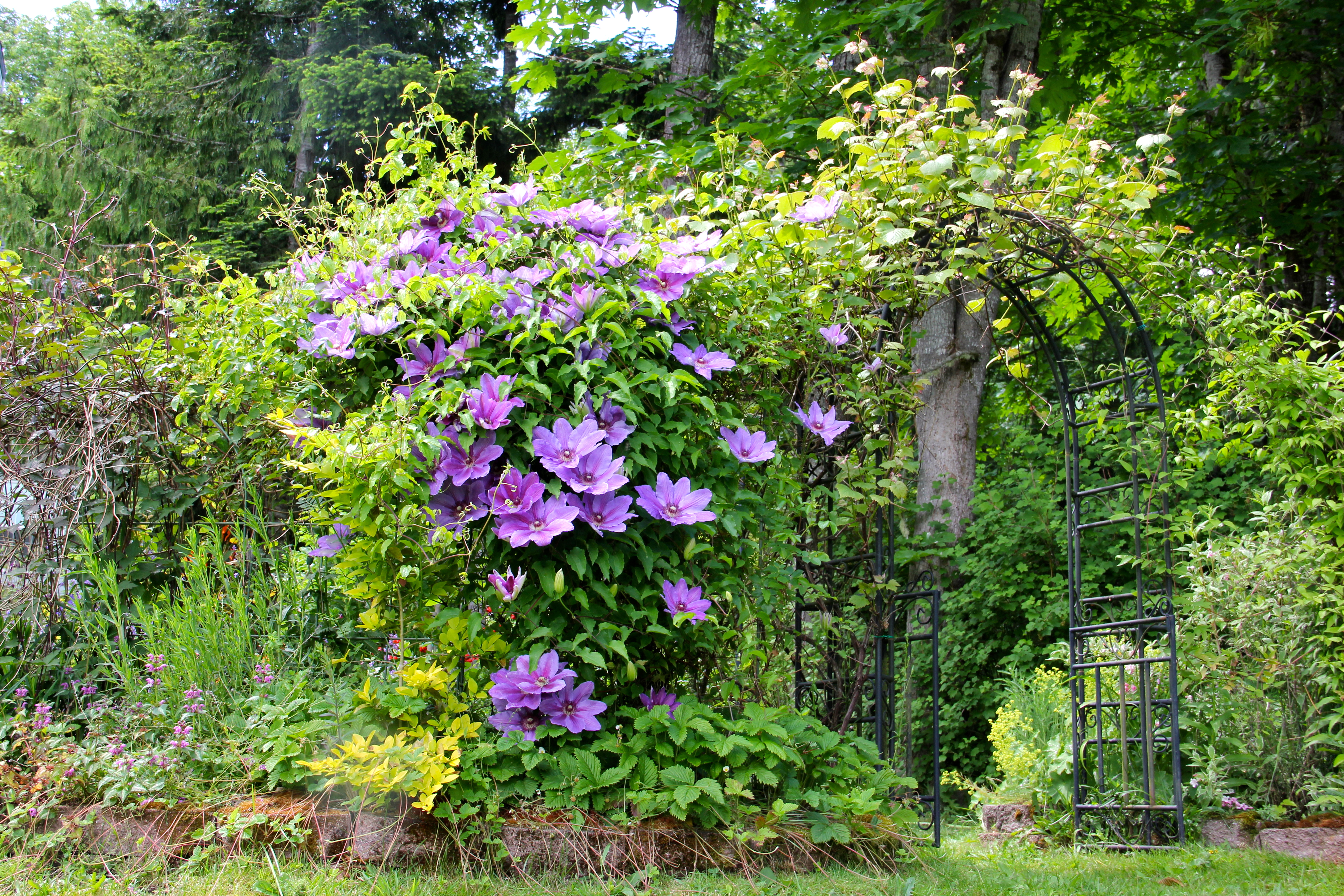 I get shear happy at times and want to clean things up, cut things back, clear plants out that aren’t doing well, and just make space. It’s an impatience that isn’t admirable, as I sometimes shear before thinking, not always giving plants an opportunity to reveal their potential. A few months ago, I had my eye on a dead looking vine in the perennial garden and even told my son that it had to go. The previous owners of Coppertop hadn’t listed any specific vines to expect in that vicinity other than clematis. My son can be patient, and he encouraged me to wait and see. This brown vine was entwined with one of the featured arches and gates in the perennial beds, so I was dreading removing it and starting fresh. While all other plants including vines in these gardens budded and showed their green side, this vine continued its dry, scraggly state all through April and into May. I was oiling my shears. Then, in mid-May it sprang to life.