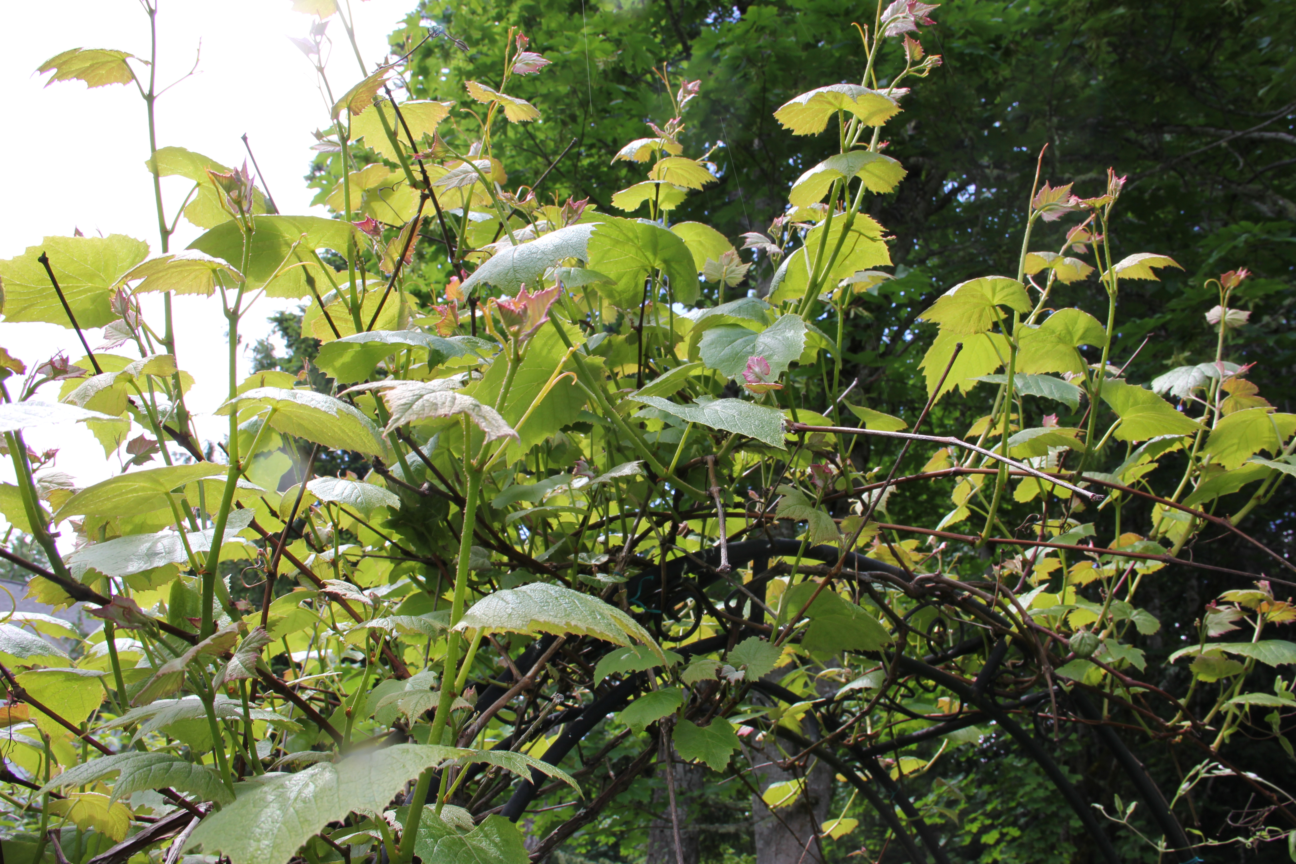 The grapevine grows in an area with a number of other vines, including a few clematis and climbing roses. This area is packed full, each vine lending support to another. The grapevine grows over the arch.