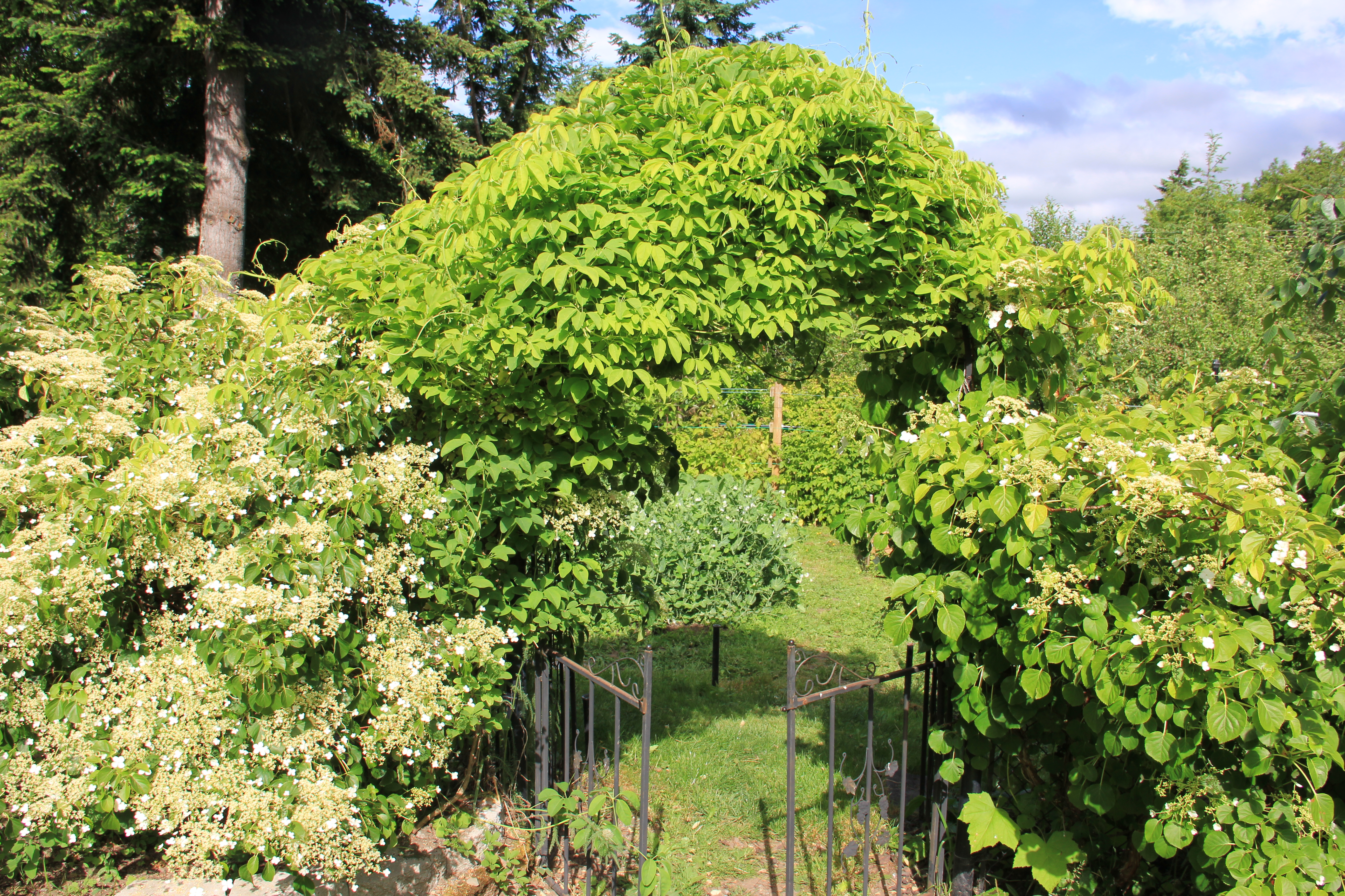 I’ve yet to see blooms on most of the Coppertop hydrangeas scattered throughout these gardens, but that time is coming soon. Right now, the climbing hydrangeas, anomala petiolaris, are in full bloom. Here is the entryway to our vegetable garden and orchard two months ago: