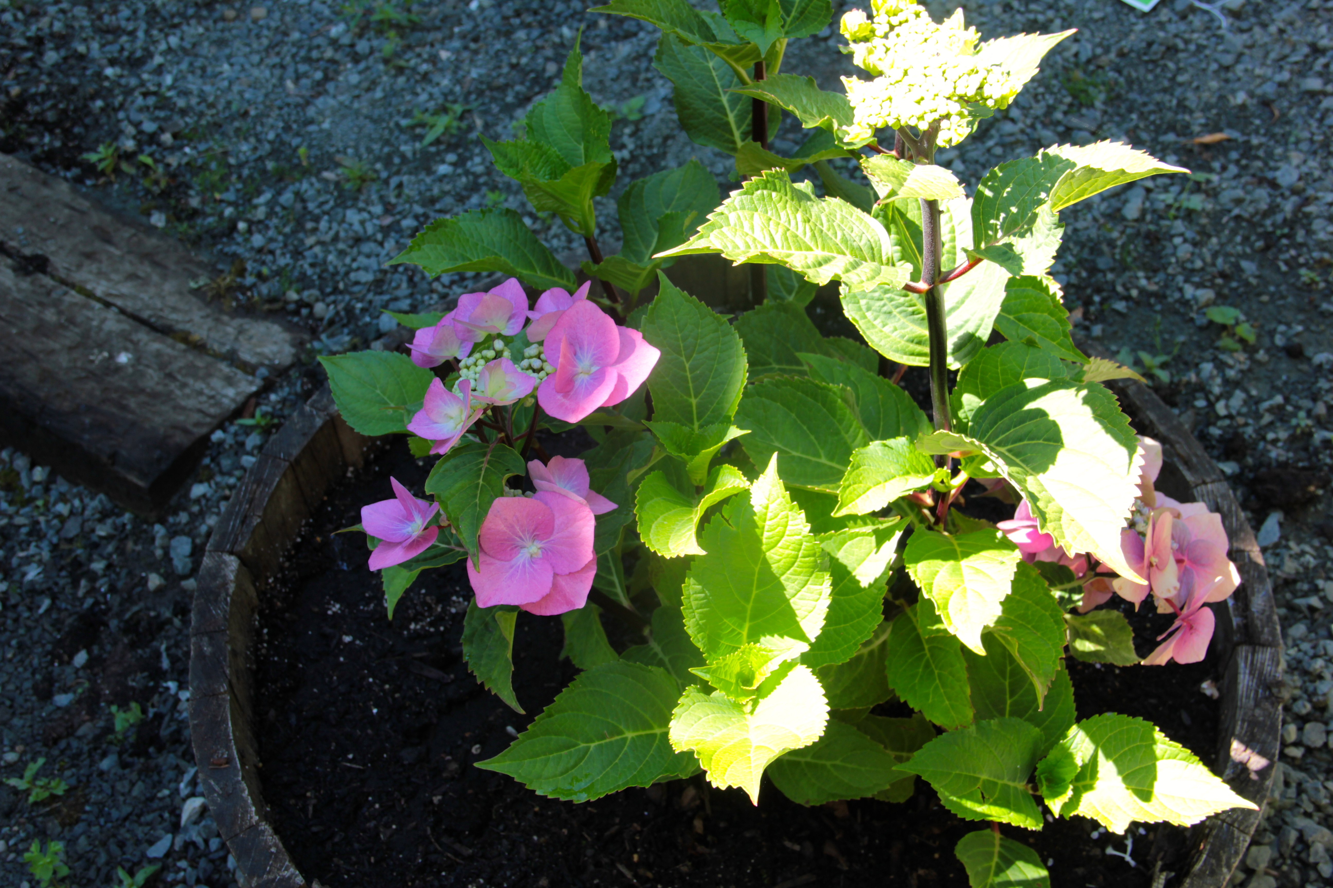 This weekend we replaced a dead tree mallow with a young lacecap hydrangea — H. macrophylla normalis — in one of the barrels along the gravel stairway. These will make lovely dried blooms as well.