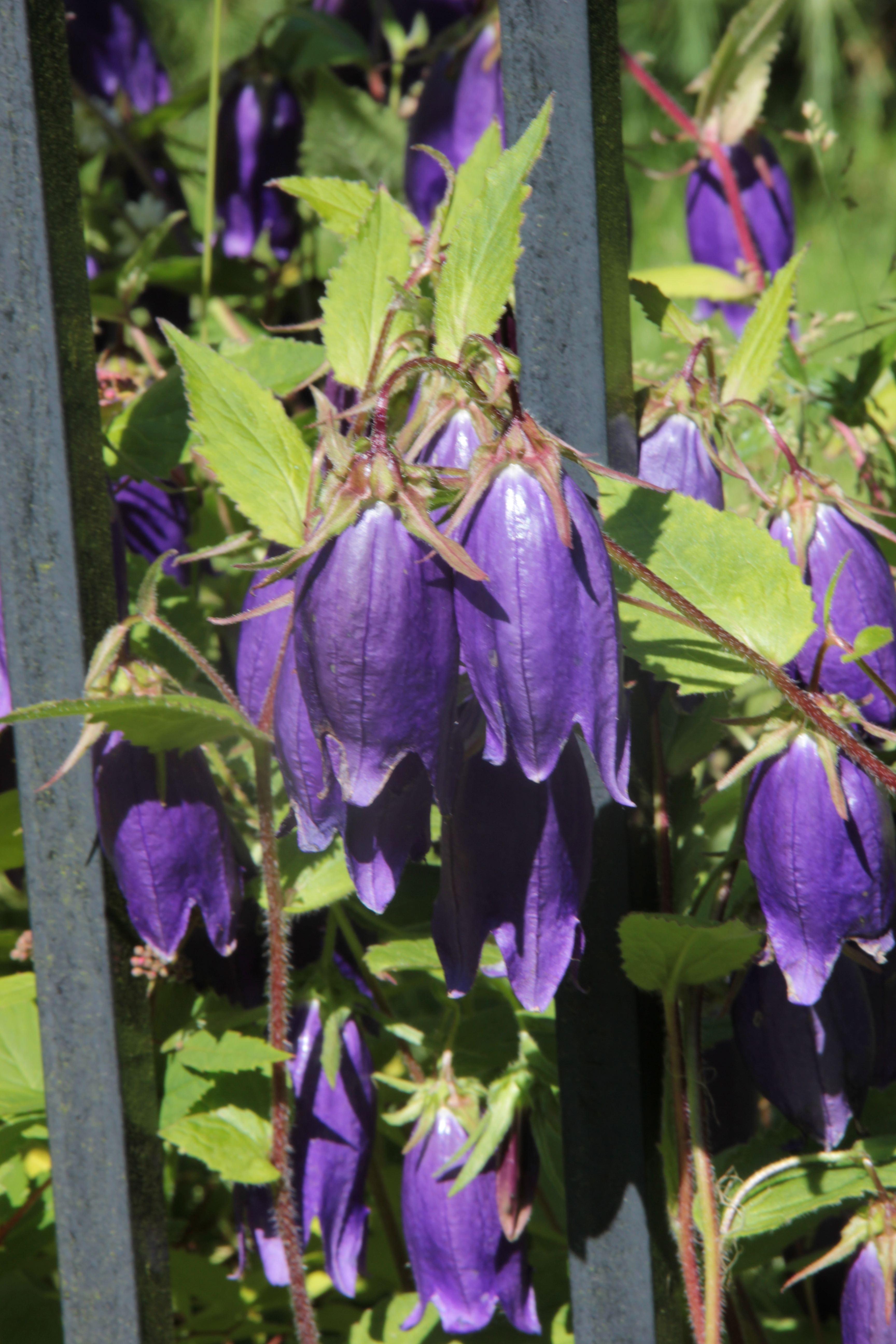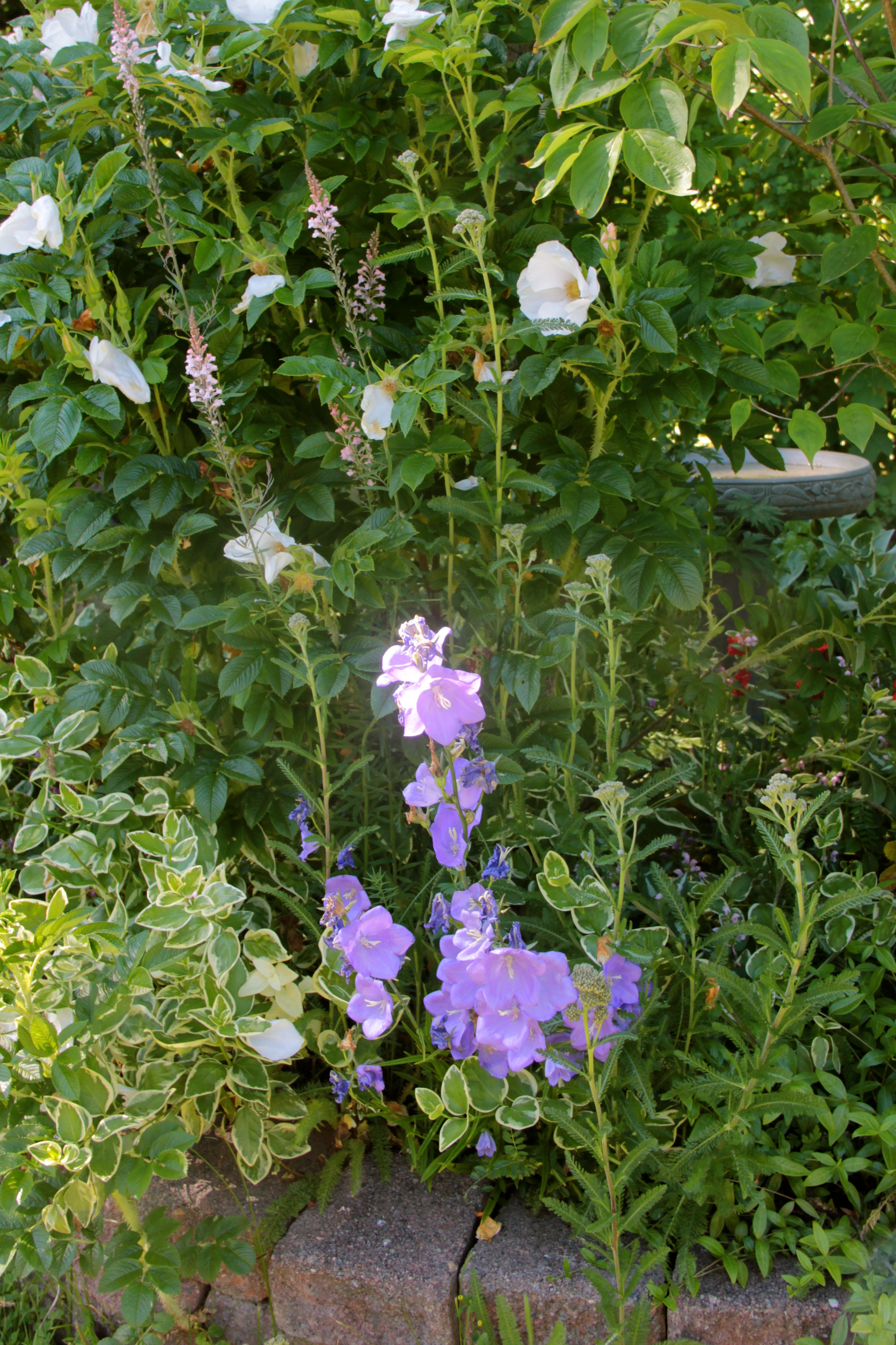 Little bells are blooming all over Coppertop in shades of purple, white, and pink. Campanula, which means “little bells” in Latin, are commonly known as bellflowers. These delicate flowers are supported by other plants and by garden structures. I love the way these bells nod and sway on their stems in today’s breeze. These in front of the Rosa rugosa are cheery.