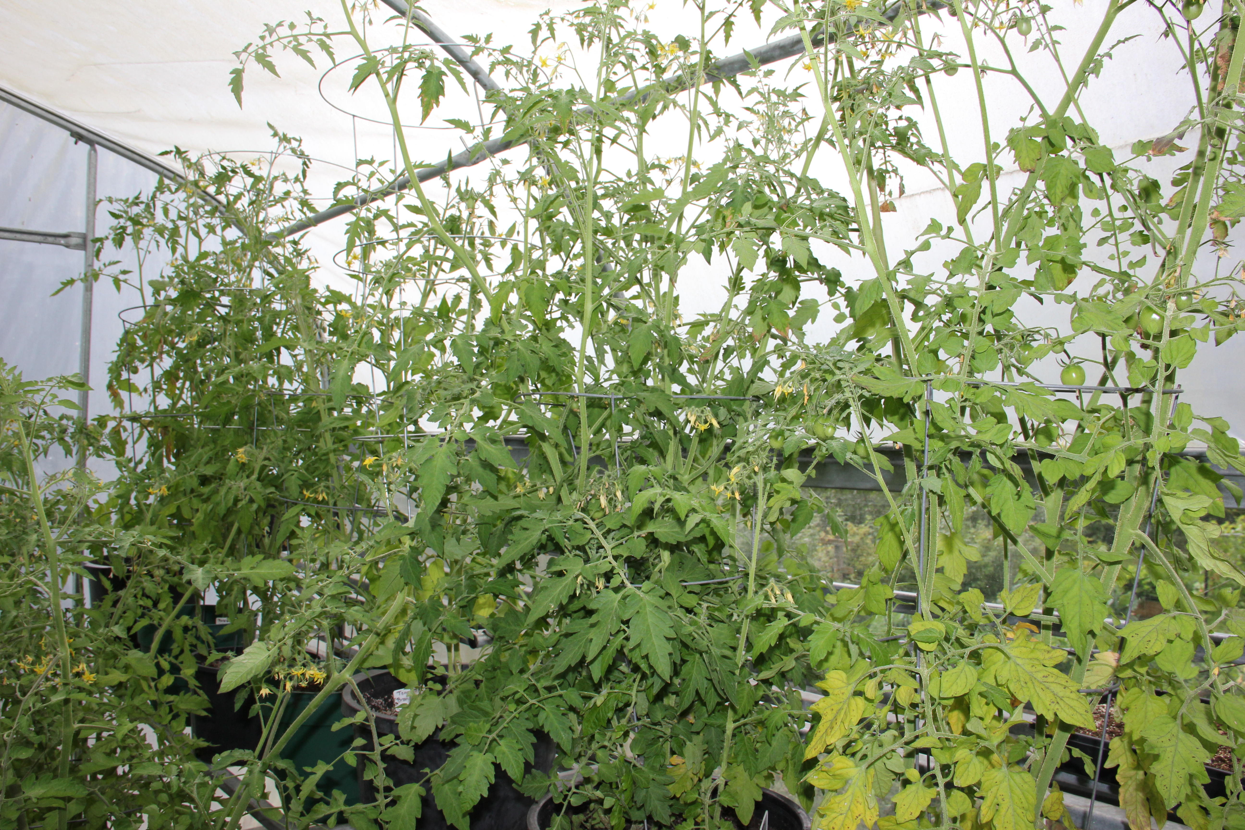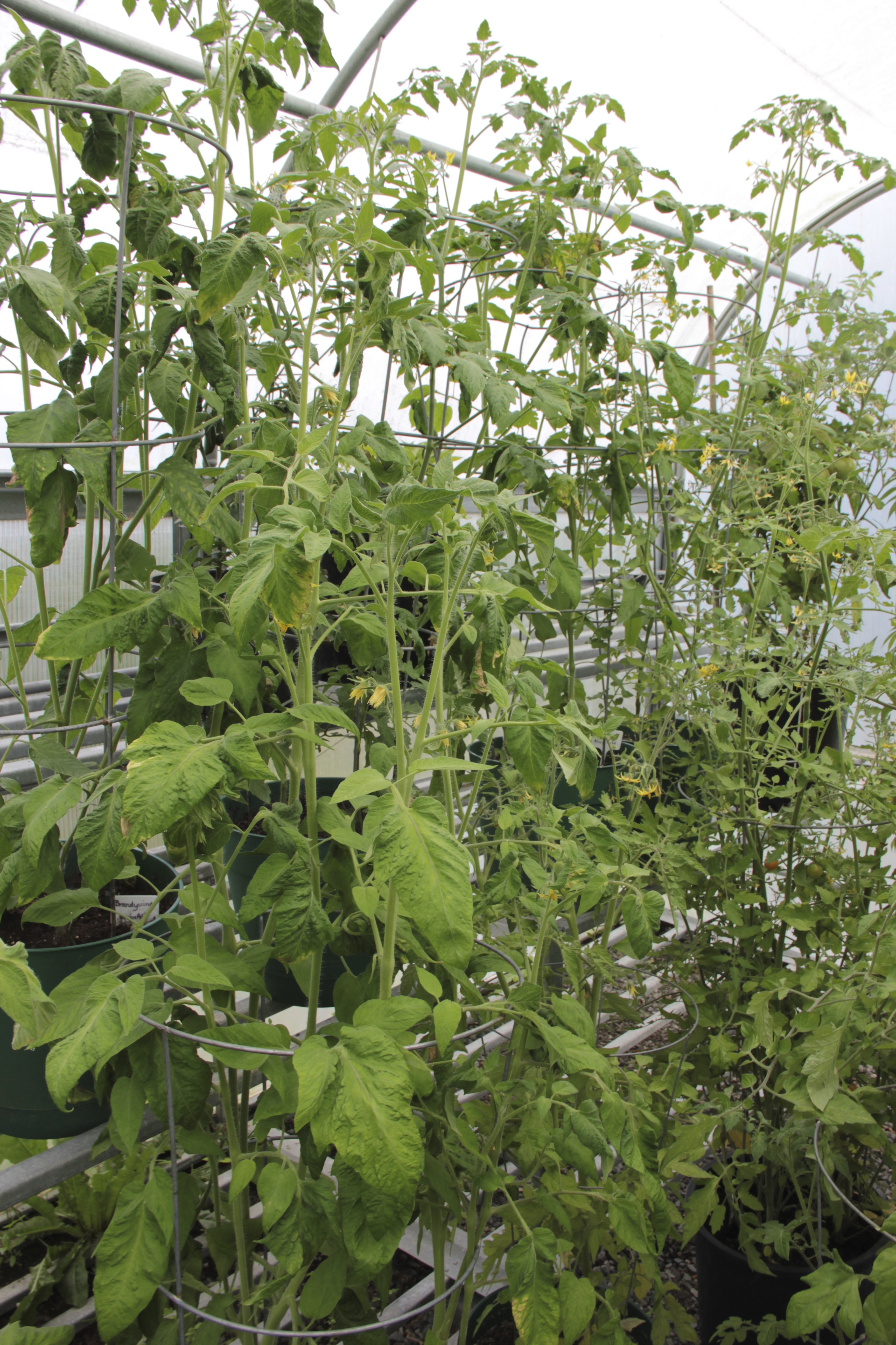 We have 19 enormous pots of tomatoes growing in there, and most of those pots contain more than one plant. All are caged, and some reach the plastic ceiling. I started almost all of these from seed. I’ve kept them in the greenhouse, except for the week our temps reached the 80s, when I dragged these beasts out into the sunlight. Our garden is higher than 1200 ft. elevation, and our summer nights occasionally drop into the 40s. The plants have thrived in the greenhouse, to say the least. It has helped that they are planted in a rich blend of compost and organic potting mix.
