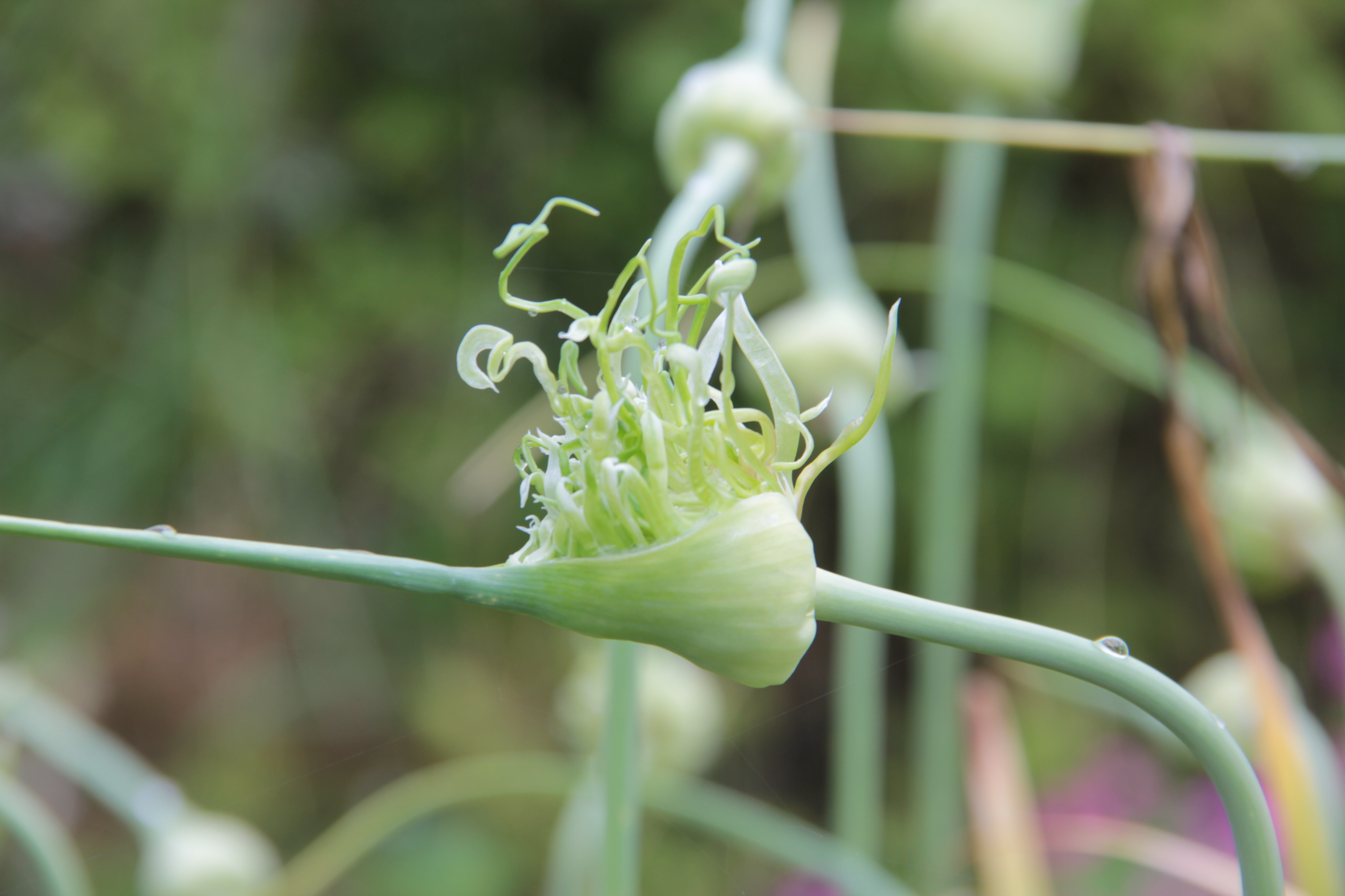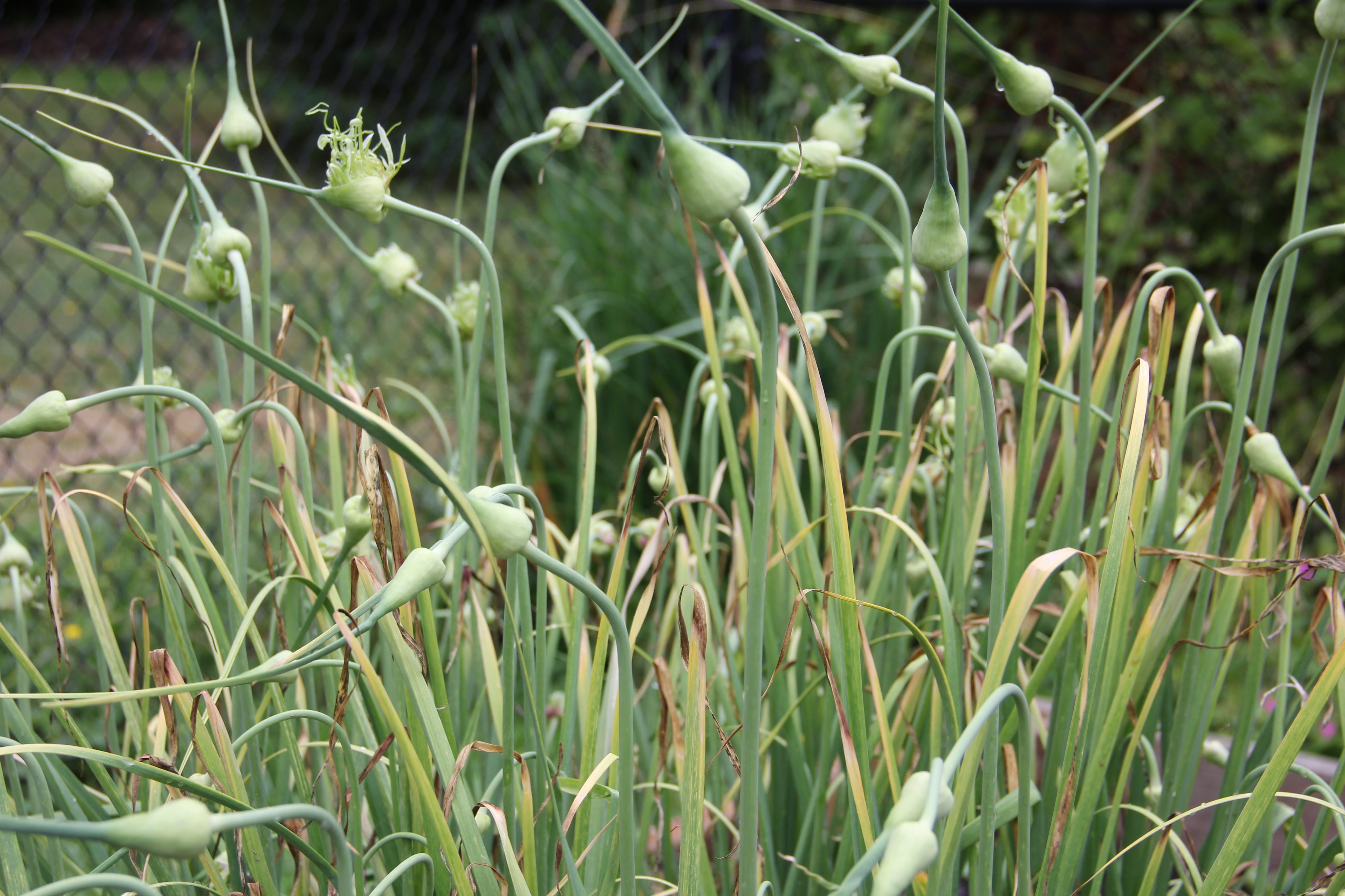 Coppertop’s previous owners left behind a large plot of garlic, Allium sativum, planted in one of the raised beds. Garlic is known as the “stinking rose”; in our house we love the stink and add it to a wide range of dishes. All spring and summer I’ve watched the green shoots mature, and now we have garlic scapes.