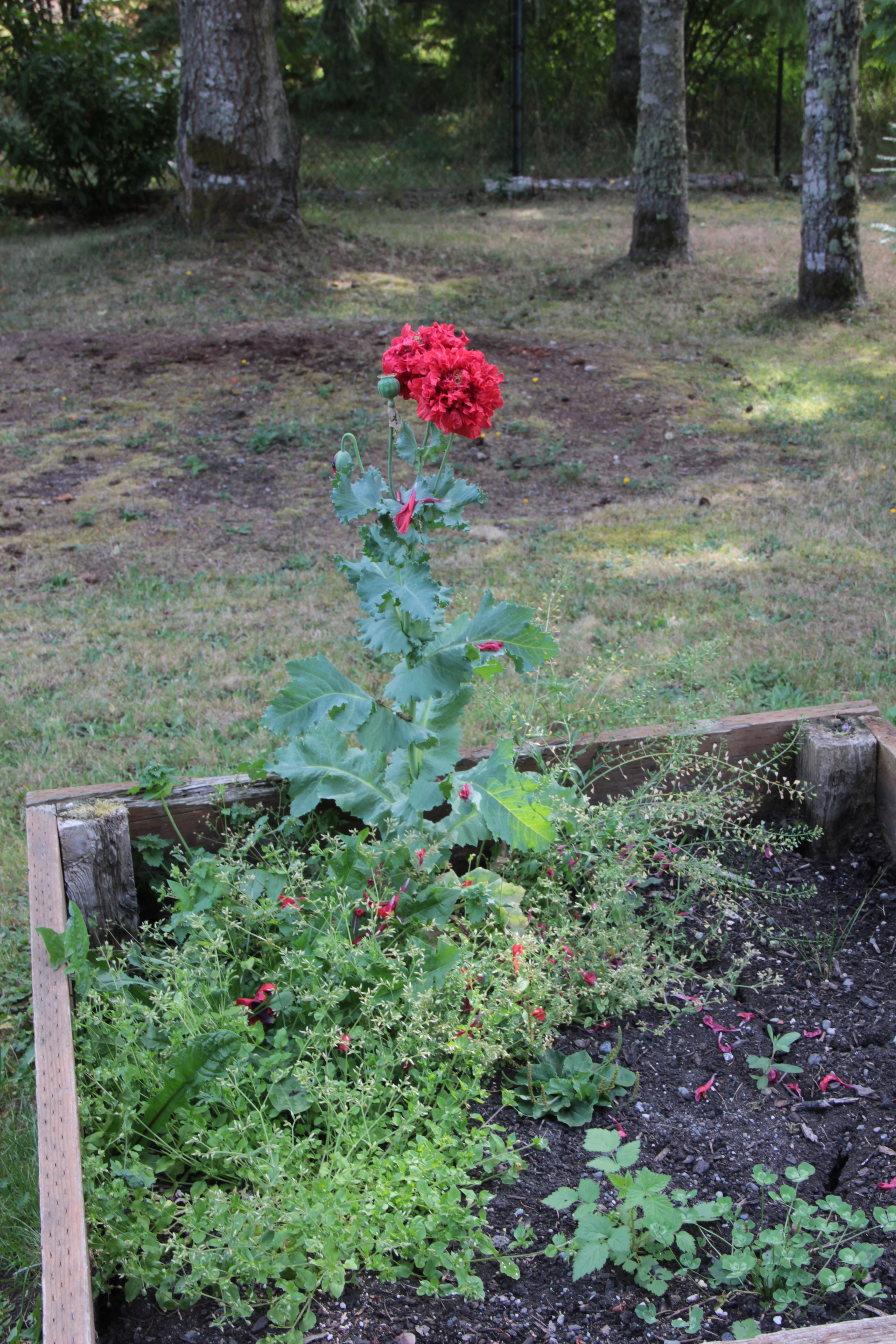 - Volunteer pink peony poppies continue to surprise us in odd locations. Just one ruffled red peony poppy plant in fallow bed. late August