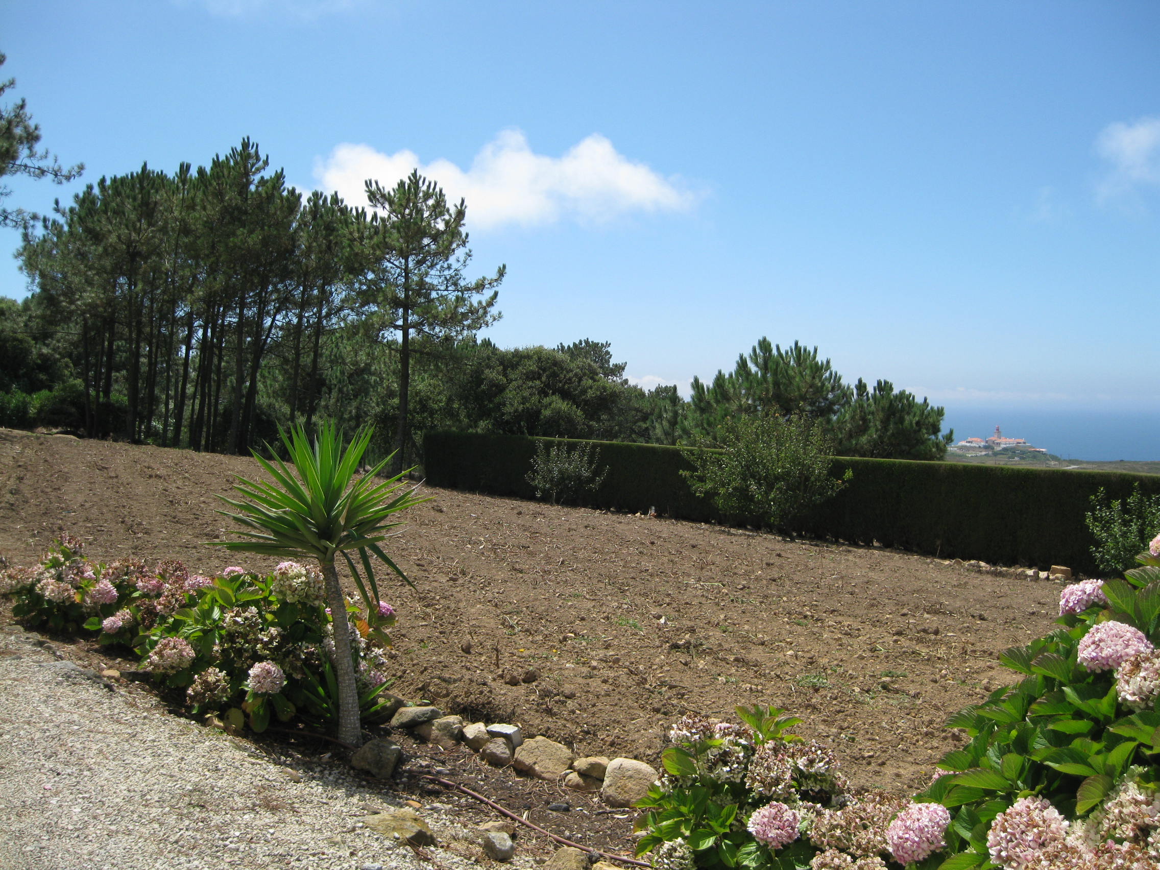 In Portugal, a large field at our farm had been planted with potatoes before we moved into our rental, and the terrific gardeners tended it, harvested it, and left us an enormous bag of yummy, waxy red potatoes that lasted us for many months. They carted other giant bags to the local market to make a few euros. The tiny pieces of potatoes left behind after machine harvesting continued to send up green vines, and we dealt with these while growing and tending many other veggies in the field the following year. Here’s the Portuguese potato field with its million-dollar view just after we moved into our quinta: