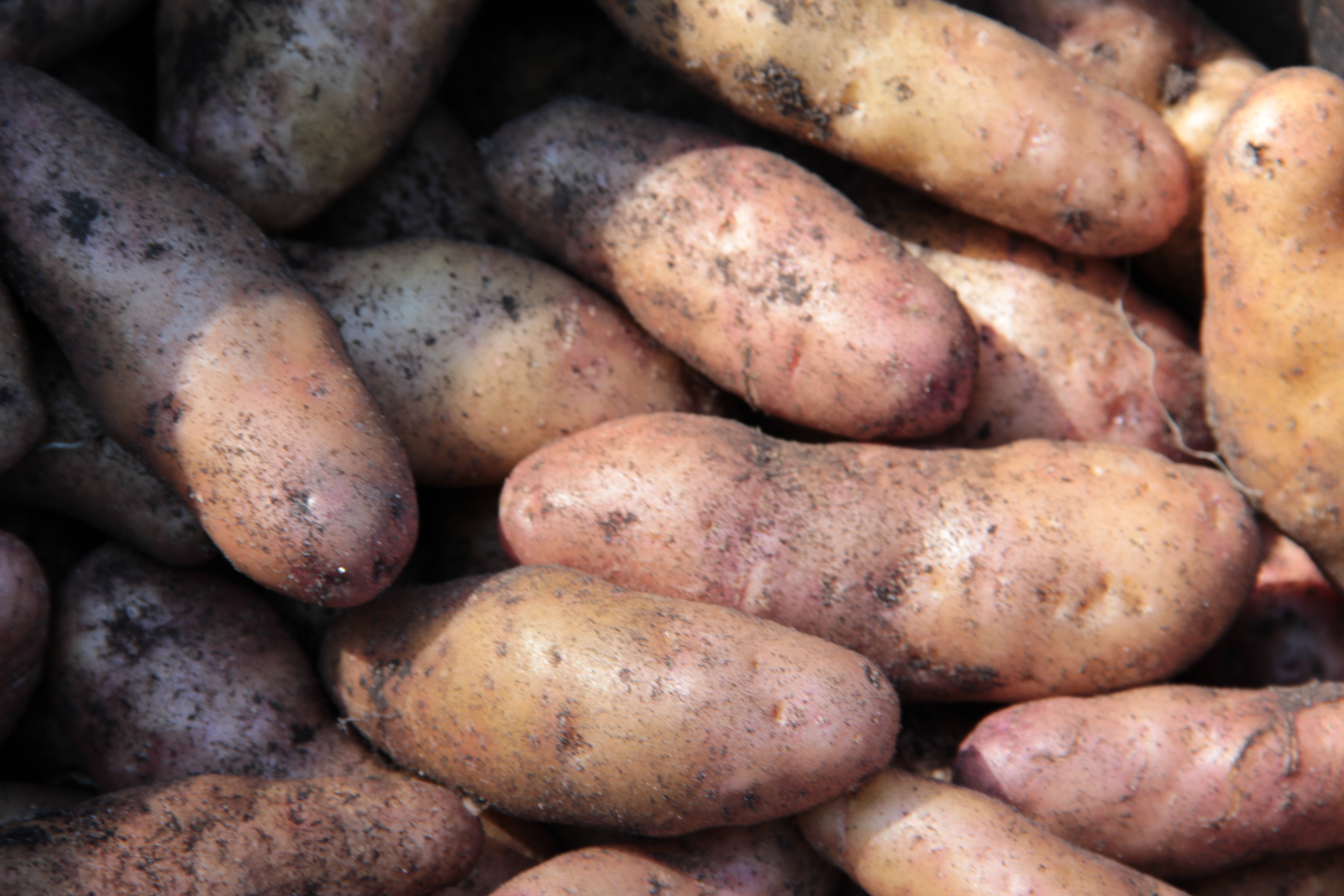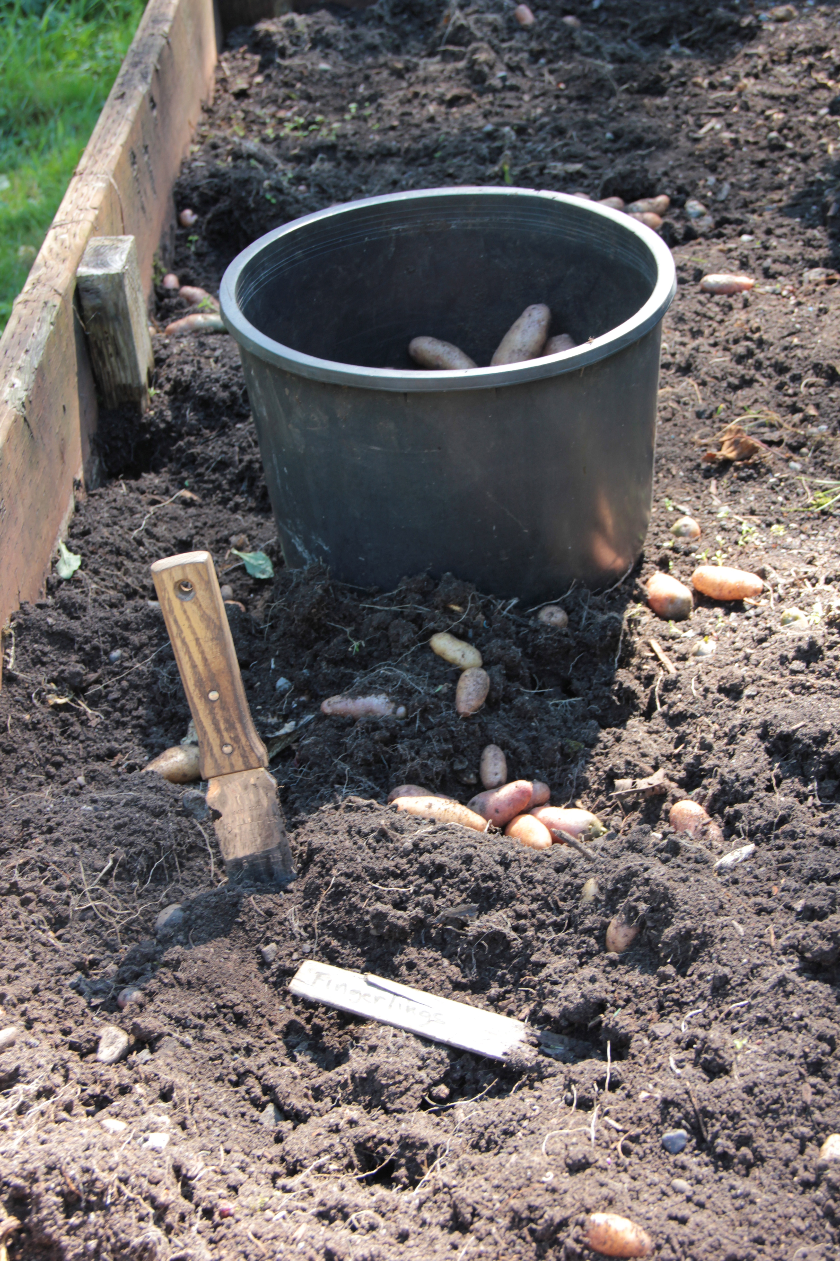 Fingerling potatoes were in the soil of one raised bed when we moved into Coppertop back in January. I only recognized them by their green vines which grew from early spring onward, and just browned in the last couple of weeks. In April I dug up one potato — a tiny specimen — to be sure the vines were actually from potatoes.