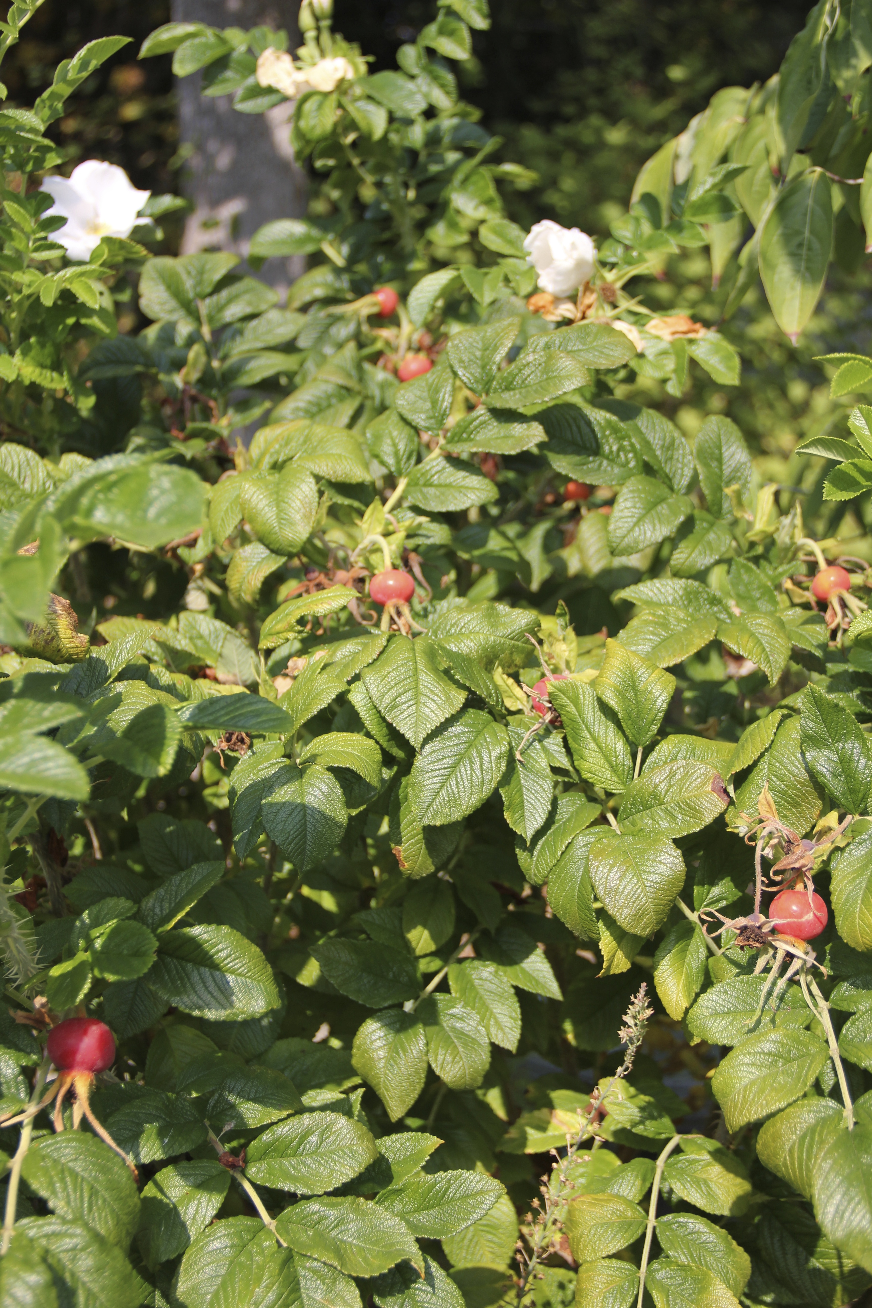 In March and again in June, I wrote of our large, thorny, white Rosa rugosa. Its fragrance has been a stand-out feature of the perennial beds this summer. I can’t walk by without burrowing my nose into the blooms — after checking for bees, of course. Since pruning in March, the bush has grown to reach about 6 feet tall again. It has bloomed throughout September, but its current appeal for me is these beautiful, large seed pods or rose hips.