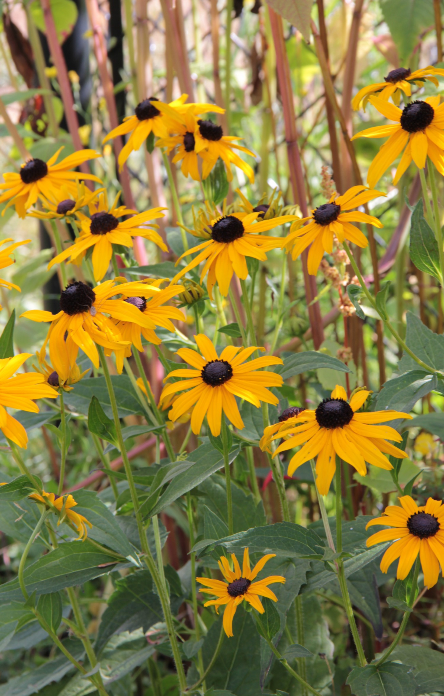 At Coppertop this large clump of cheerful, perennial daisies shown above grow near the veggie garden and are scattered in the perennial beds. I added a couple of young plants for fall color, tagged Rudbeckia hirta and “annual”, shown below, but we’ll see if they return.