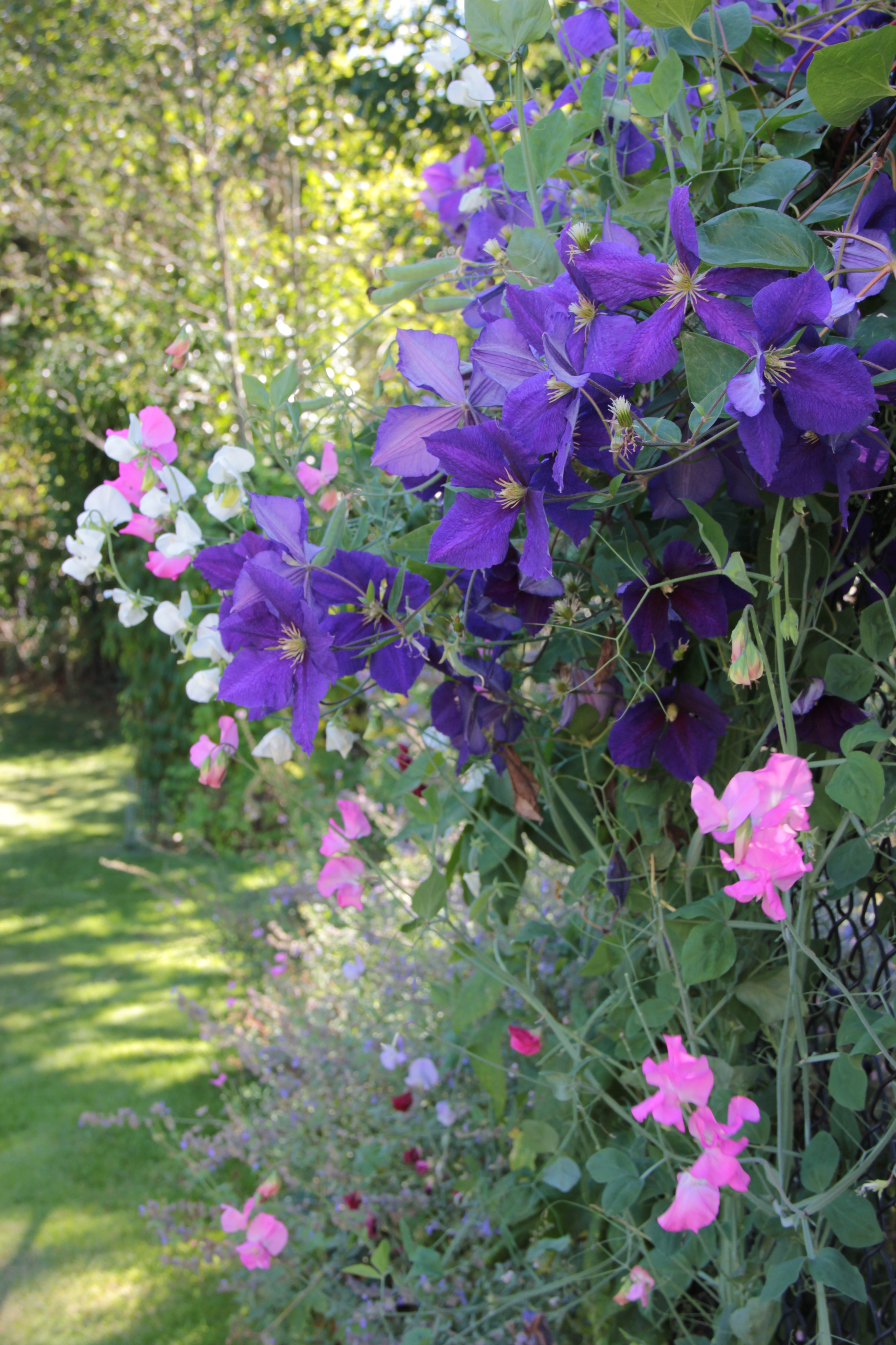 - The sweet peas near the kitchen are glorious! Vines have branched out and intertwined with clematis, and blossoms are wonderfully fragrant, attracting hummingbirds nonstop. I will definitely harvest seeds from their pods — a nice mix of colors. mid September