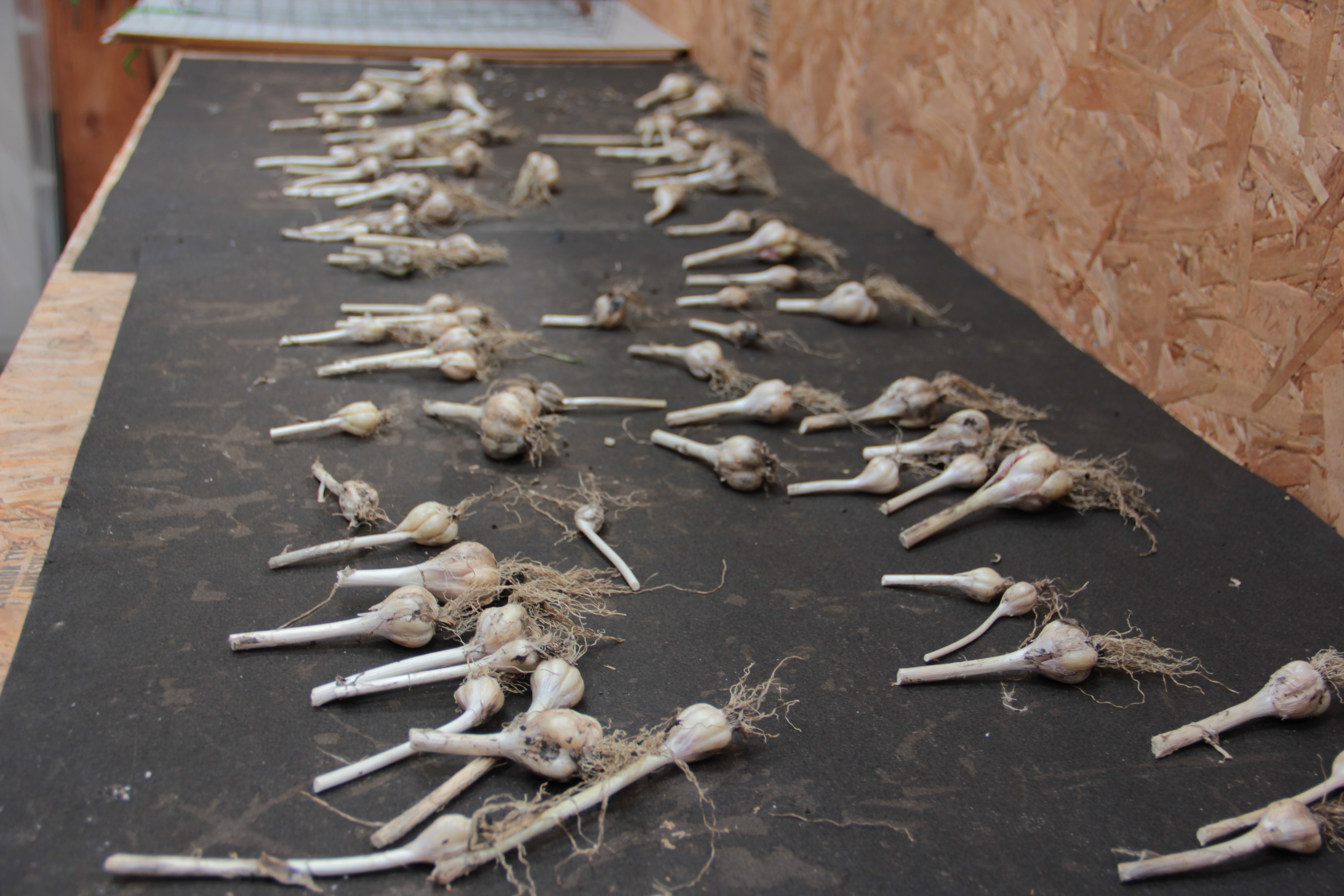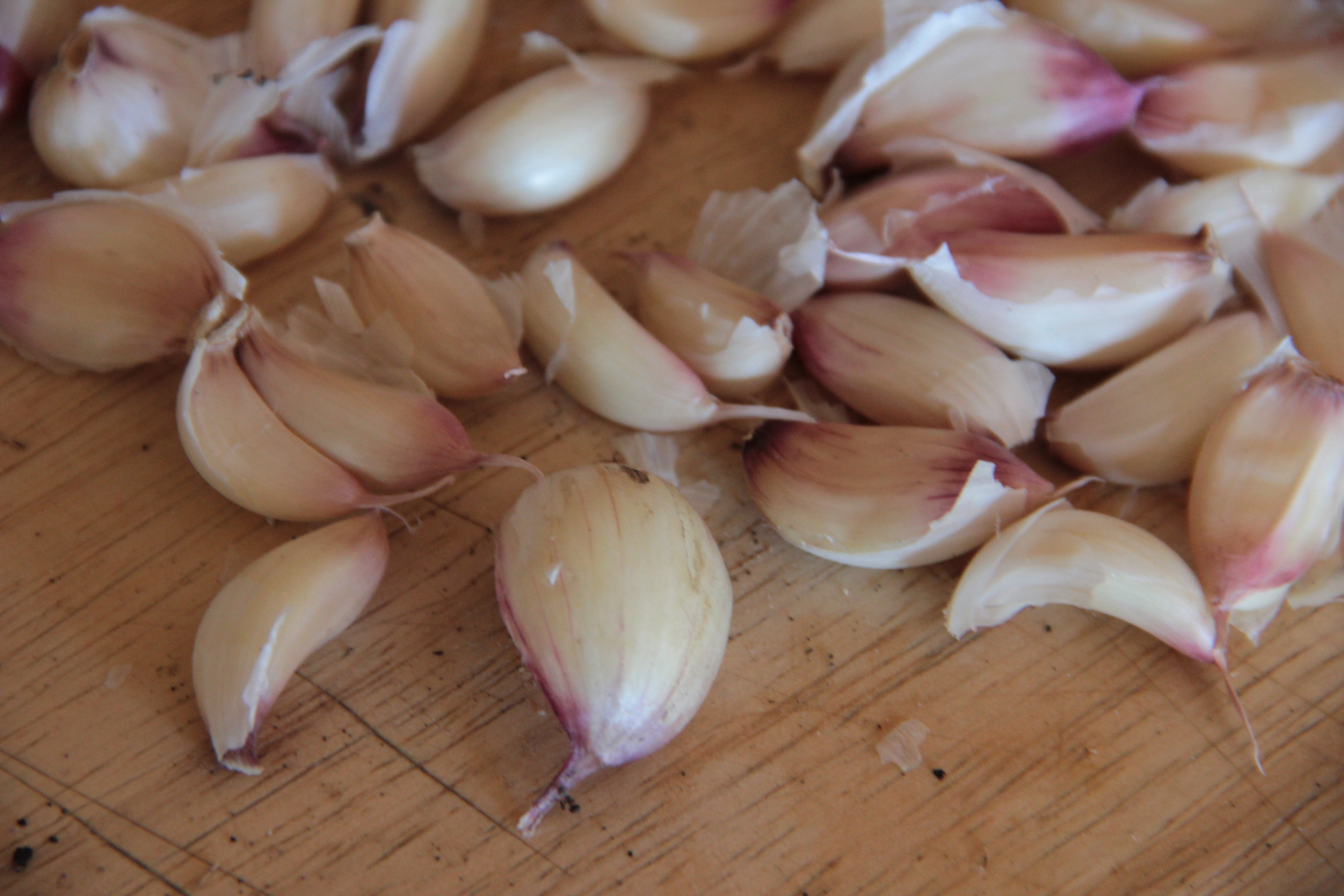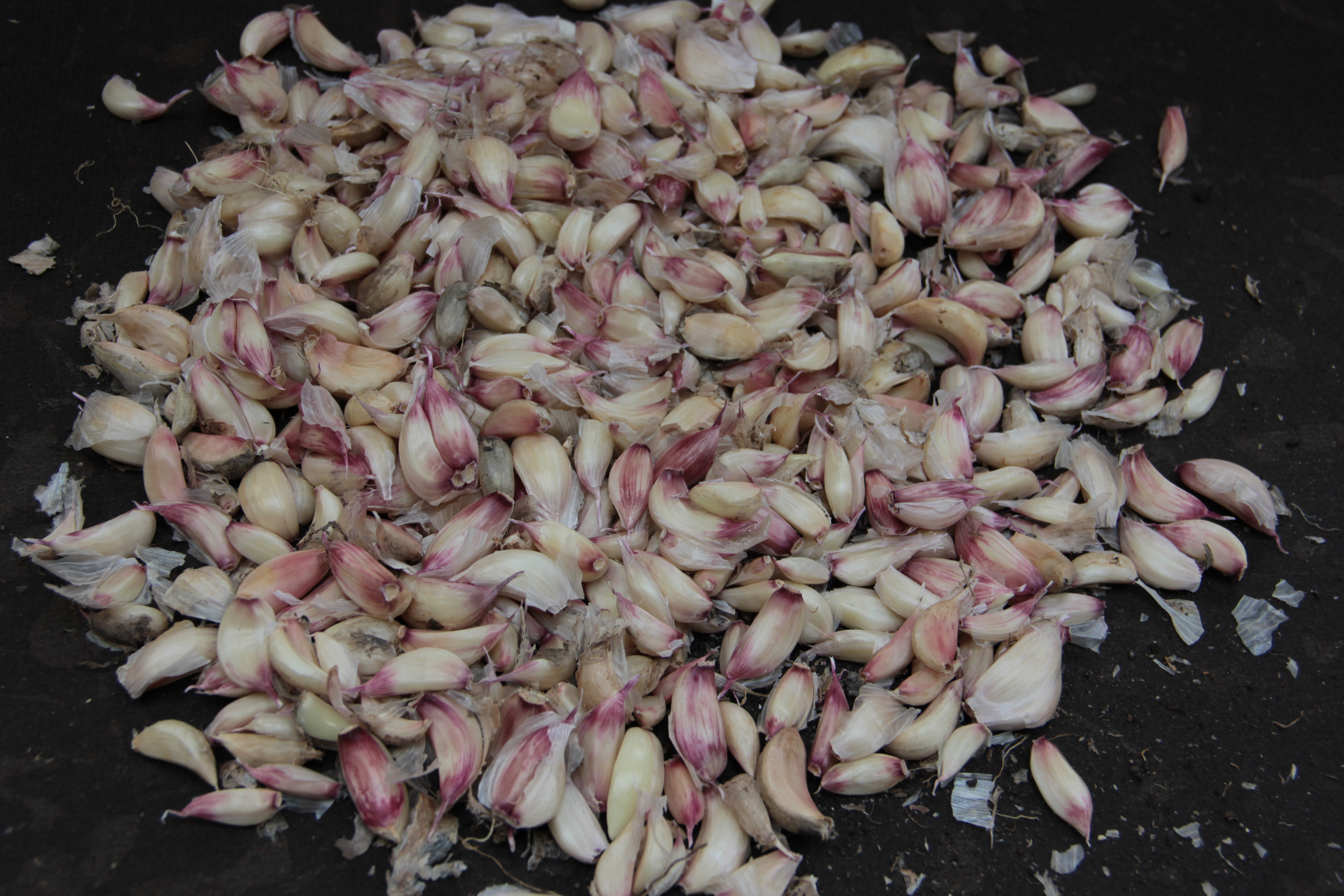 After digging up the dozens of heads of hardneck garlic which were planted and left for us by Coppertop’s previous owners, I allowed them to dry on a counter in the garden shed for close to two weeks, then separated the cloves.