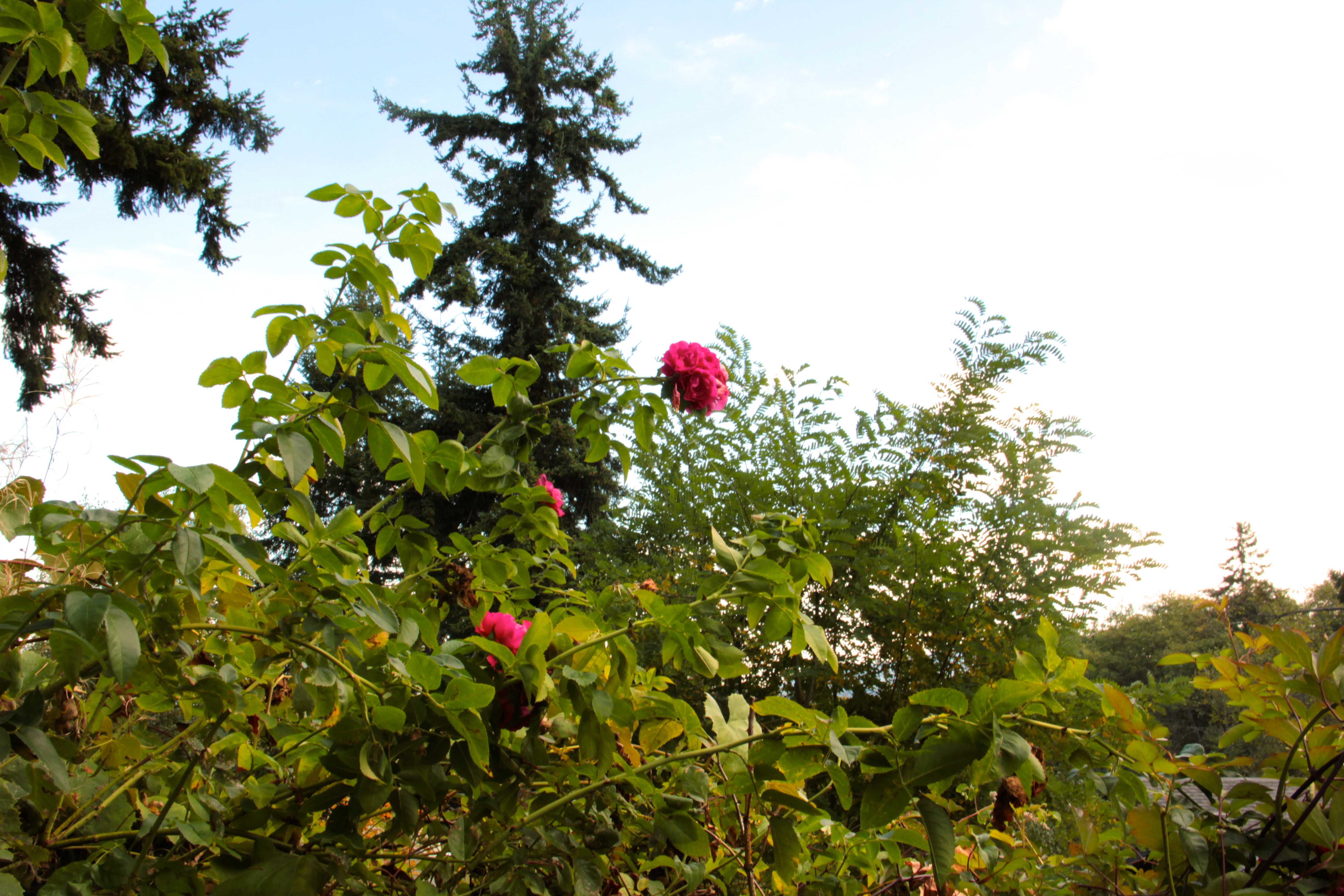 Because all of the roses were planted before we moved in, I’m not able to identify any of the varieties other than our white Rosa Rugosa. Throughout October, the large bush blooms occasionally, and its rose hips are beautiful as well.