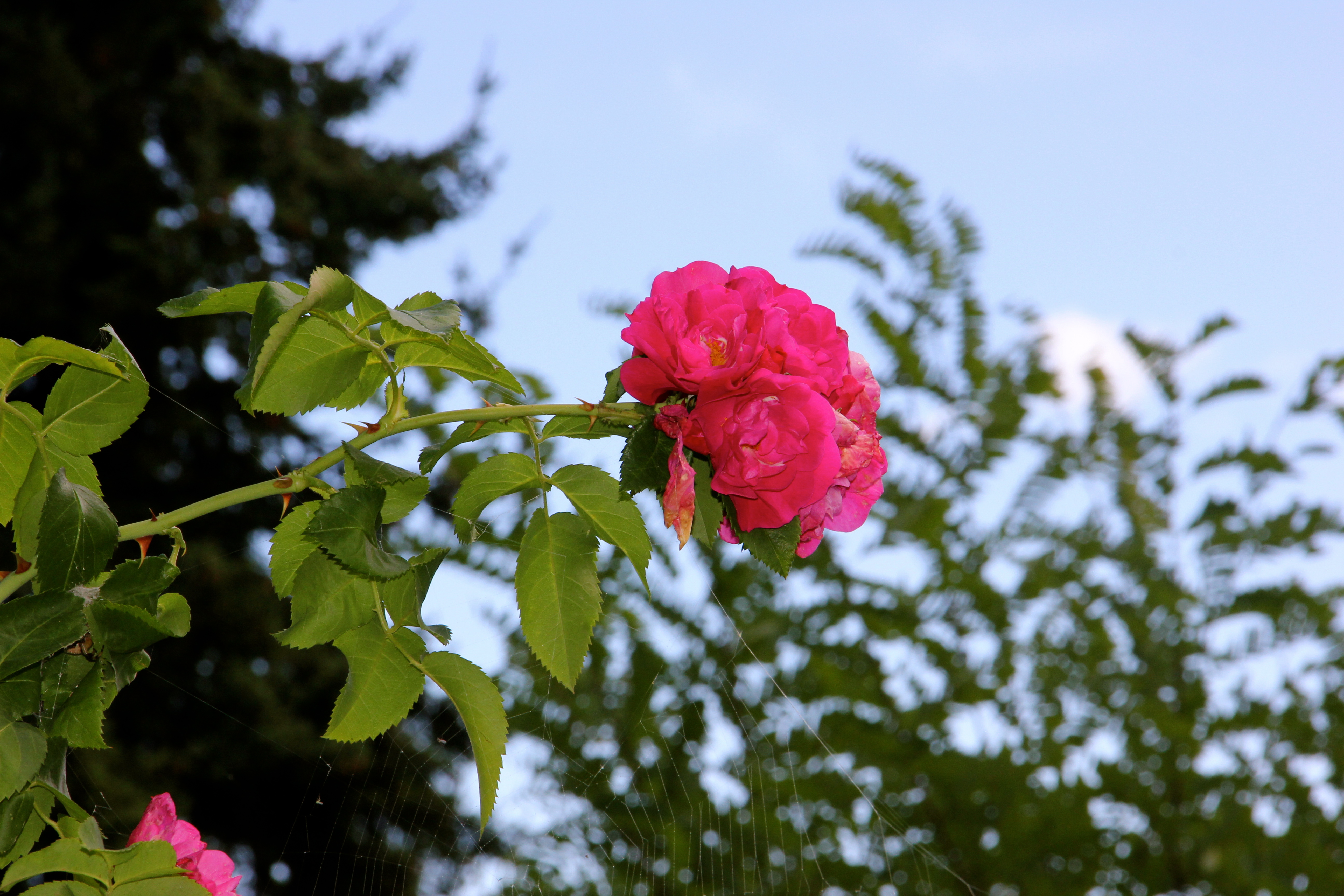 Our four climbing roses are deep pink. These roses arch along trellises and fences at Coppertop. Their last buds are opening this week.