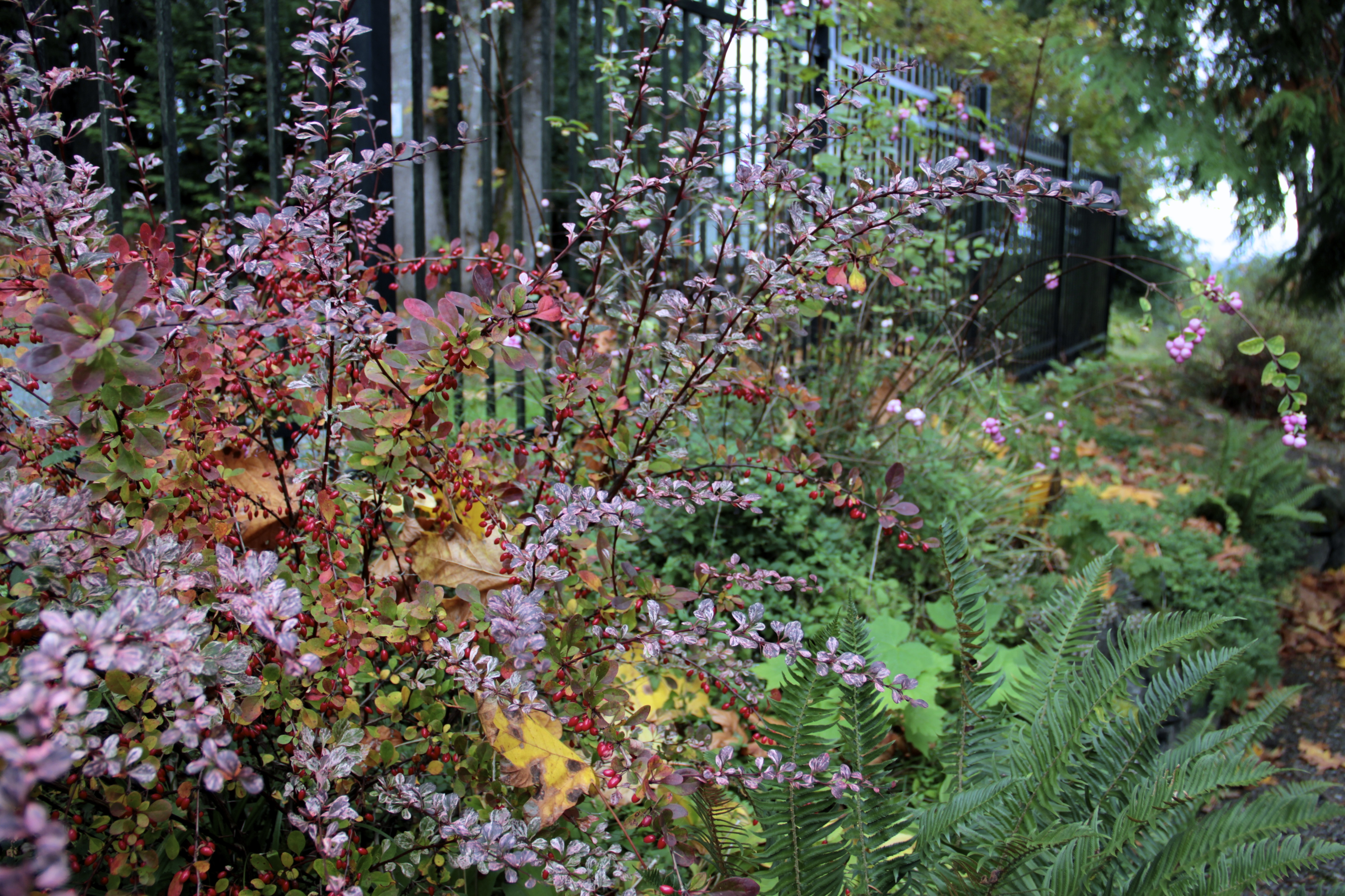 Alongside the pink snowberries, this variegated barberry arches in fall splendor. Its bright red teardrop-shaped berries are a cheerful addition to bouquets — once the branches’ thorns are clipped. We have a couple of healthy Japanese barberry or Berberis thunbergii specimens, and they’re placed well to deter dogs or intruders along the fence line. These are considered invasive in certain states, but here they serve a purpose while adding color.