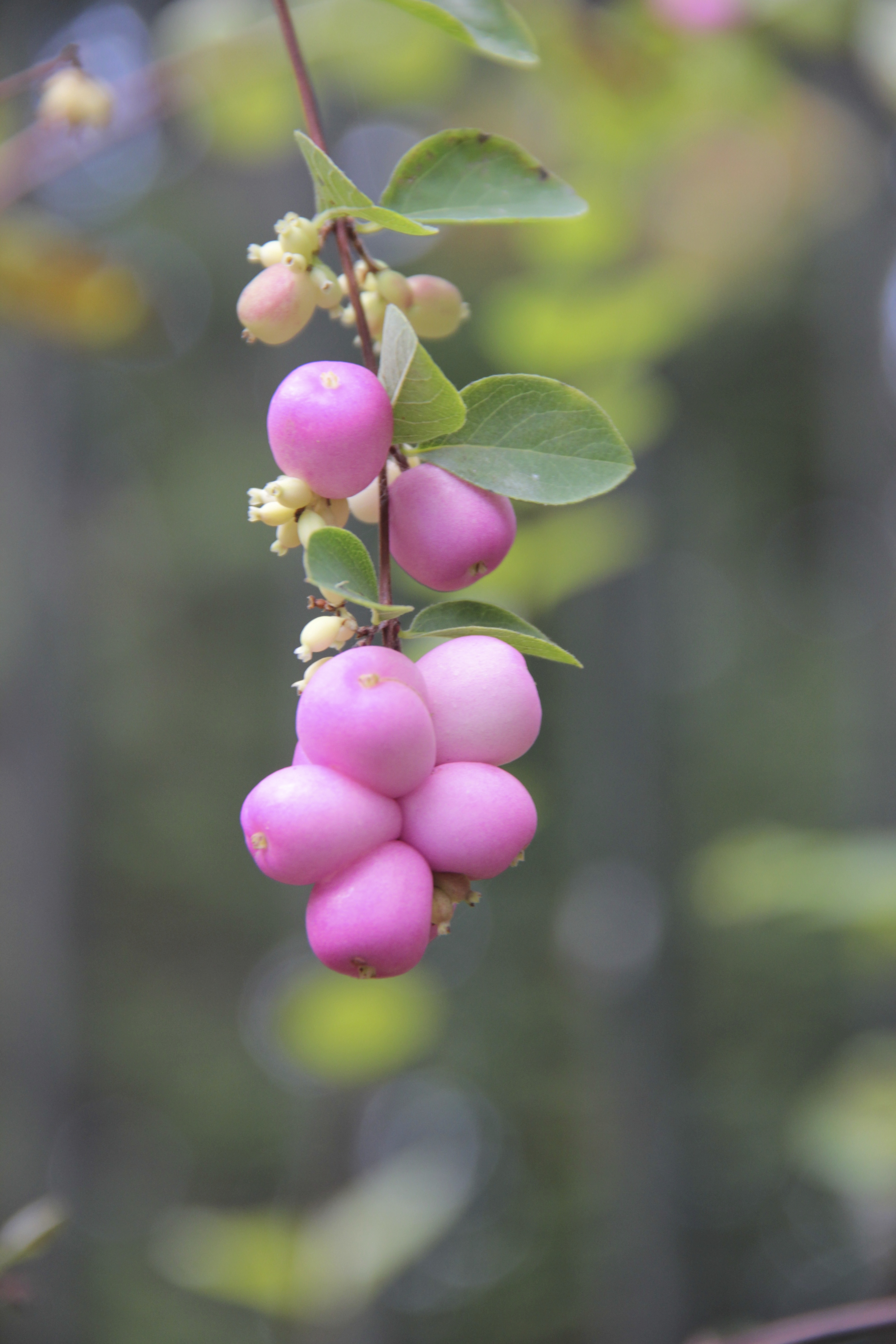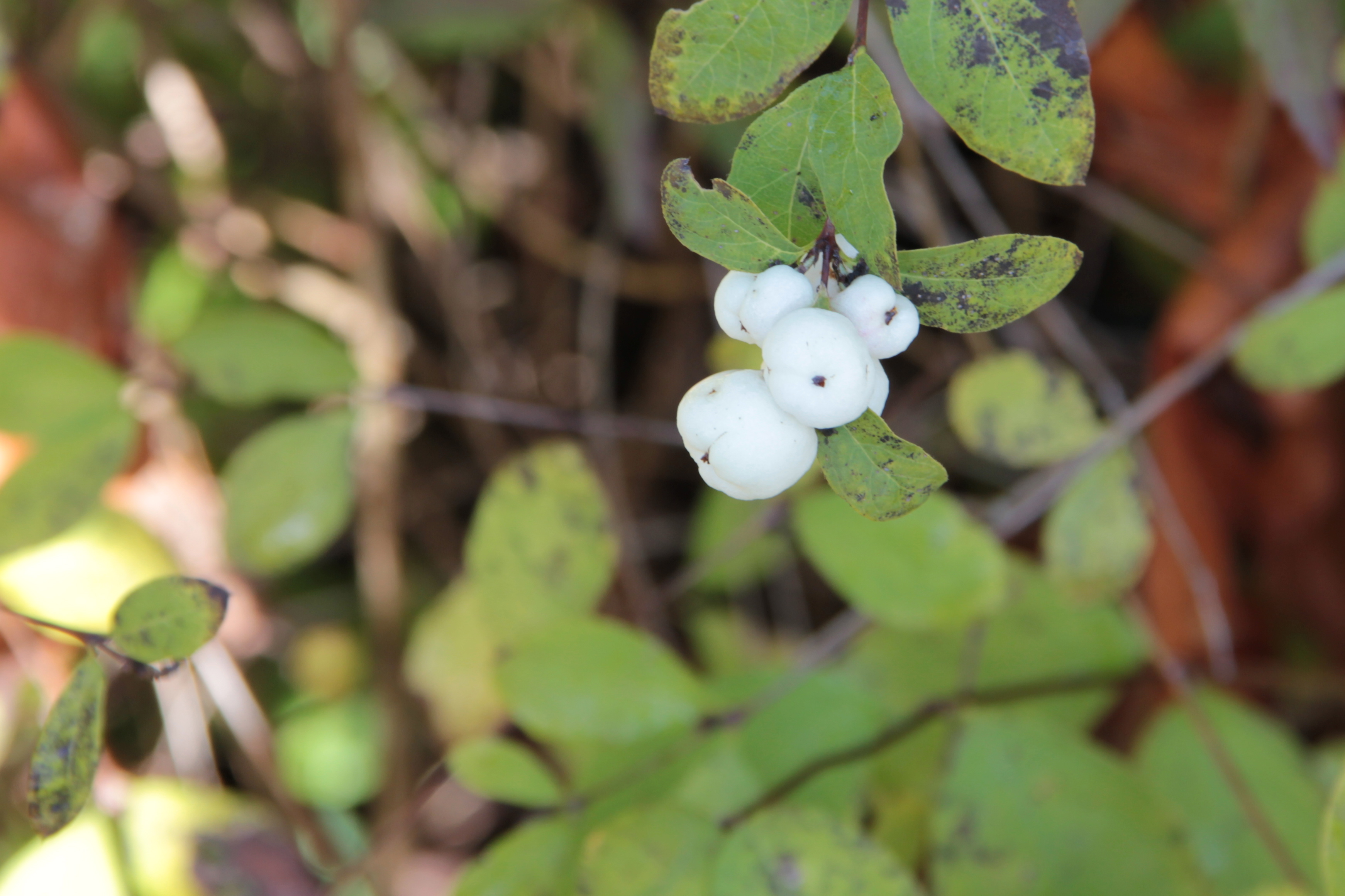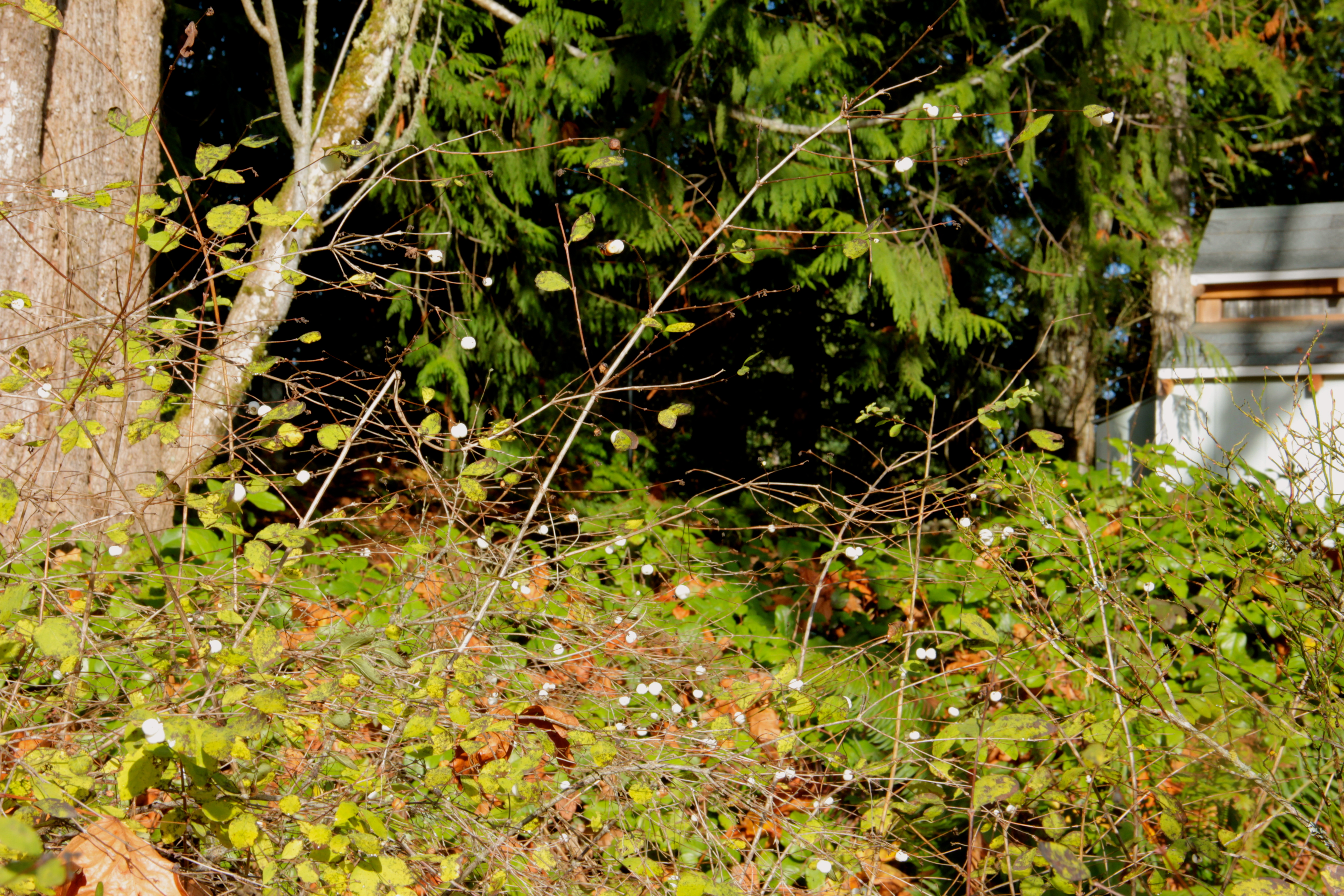 Nearby, white snowberry shrubs grace the hill below the Chicken Mansion, massed together with other native shrubs. These bushes belong to the honeysuckle family, but the berries are poisonous to humans.