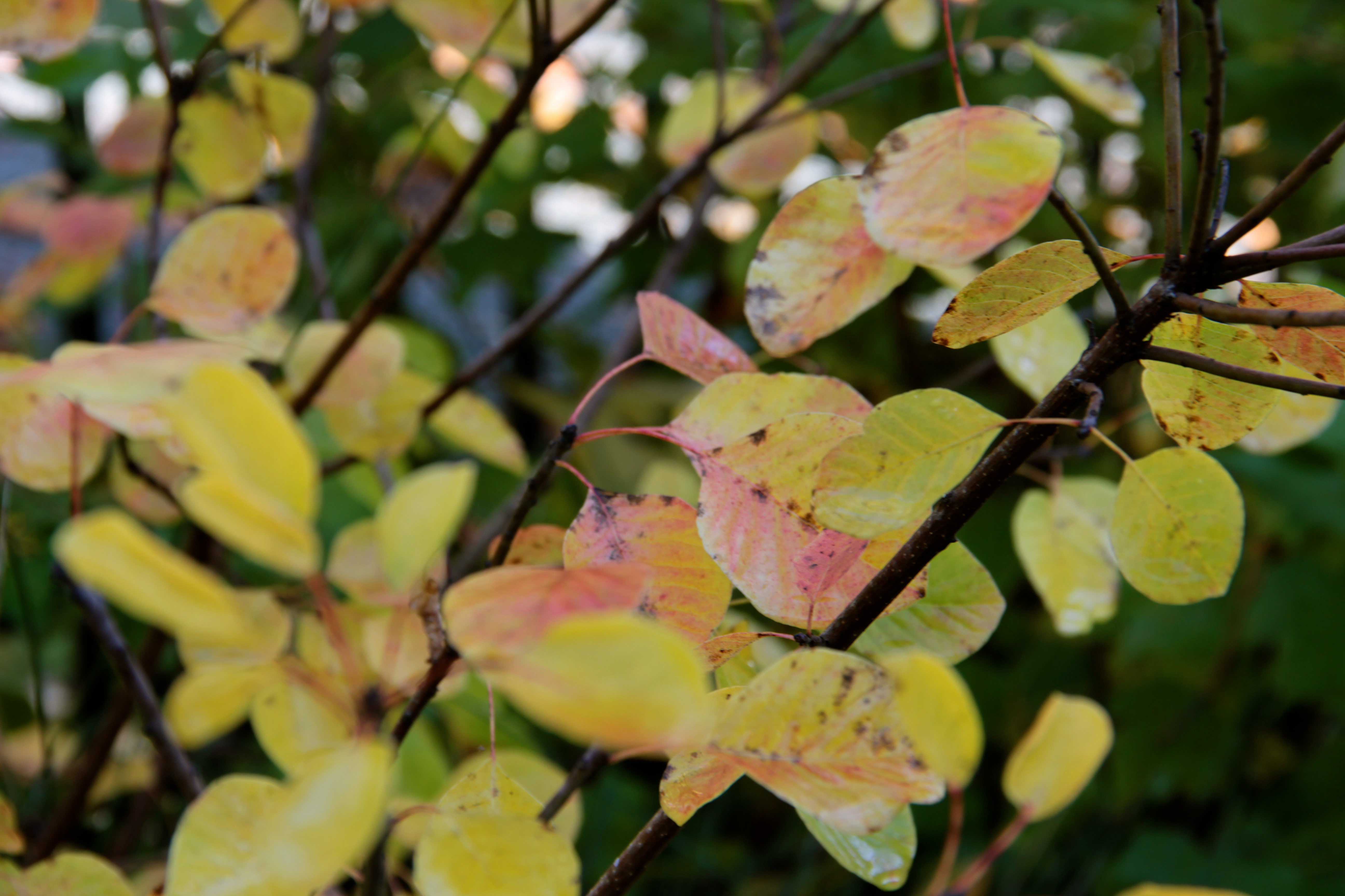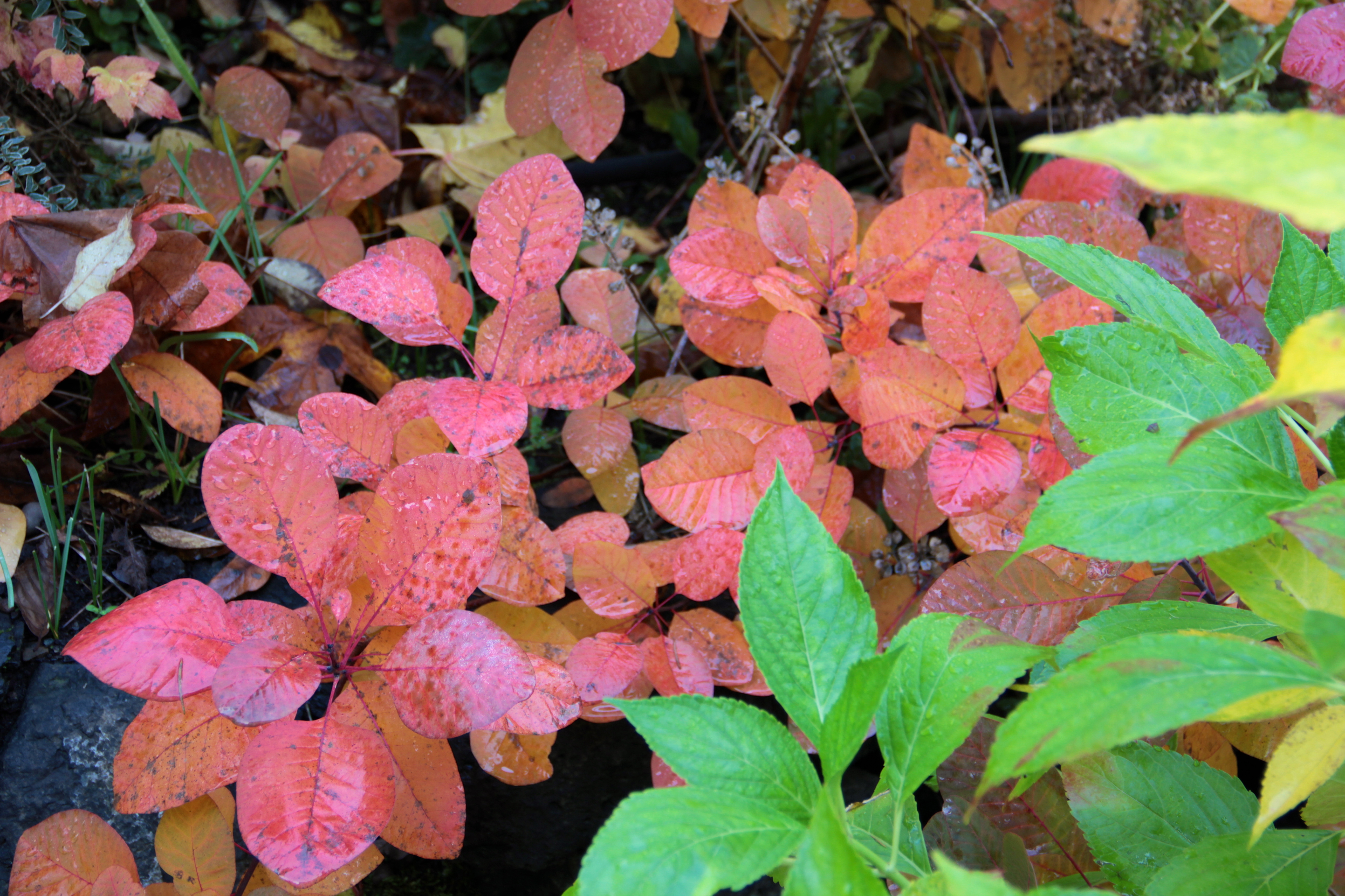 Our two varieties of Cotinus or smoke trees are bedecked in fall colors, with the purple one changing to reddish-orange tones. It glows more vibrantly than the golden spirit variety, which changed this week to reveal subtle peachy hues throughout.