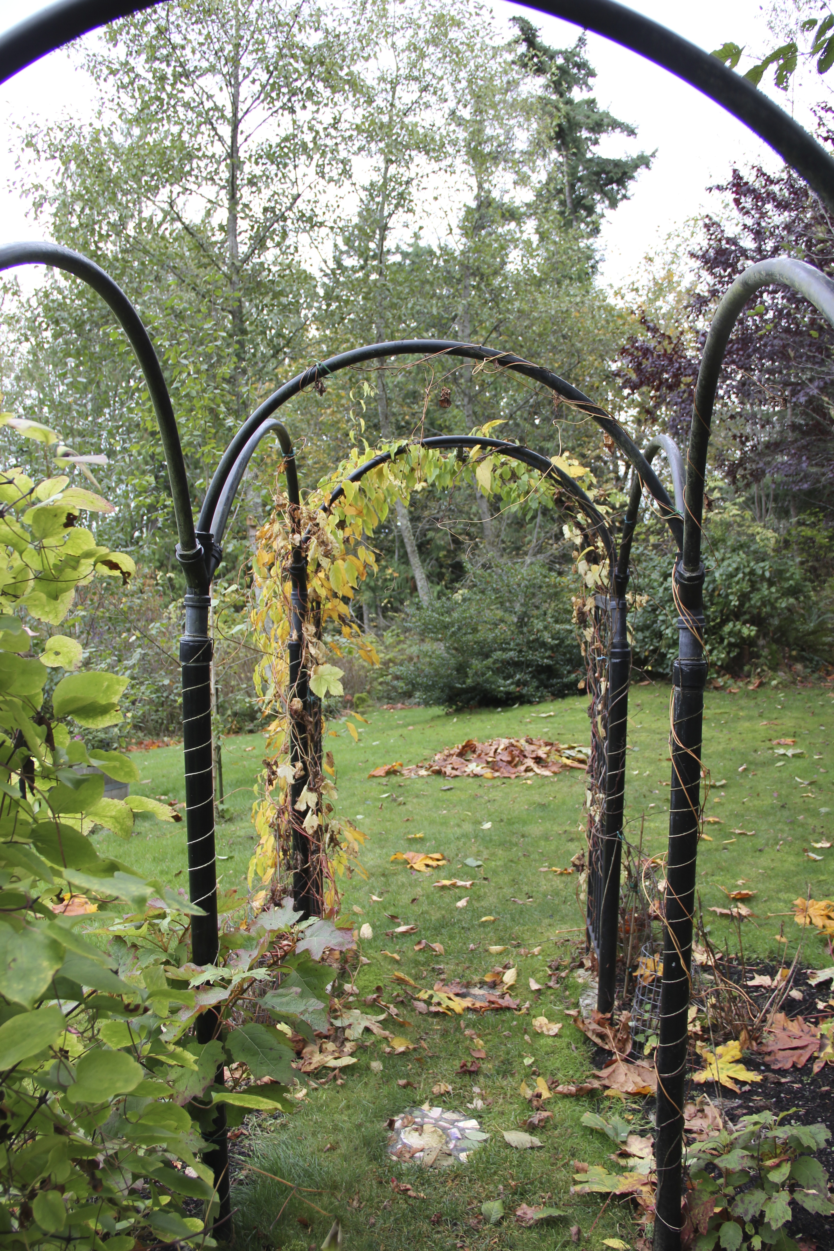 The vines on the black arches– hops, hardy kiwi, virginia creeper, akebia and clematis –have almost entered the barren stage. Twinkling lights would add interest on these arches during the winter, so I’ll get on that!