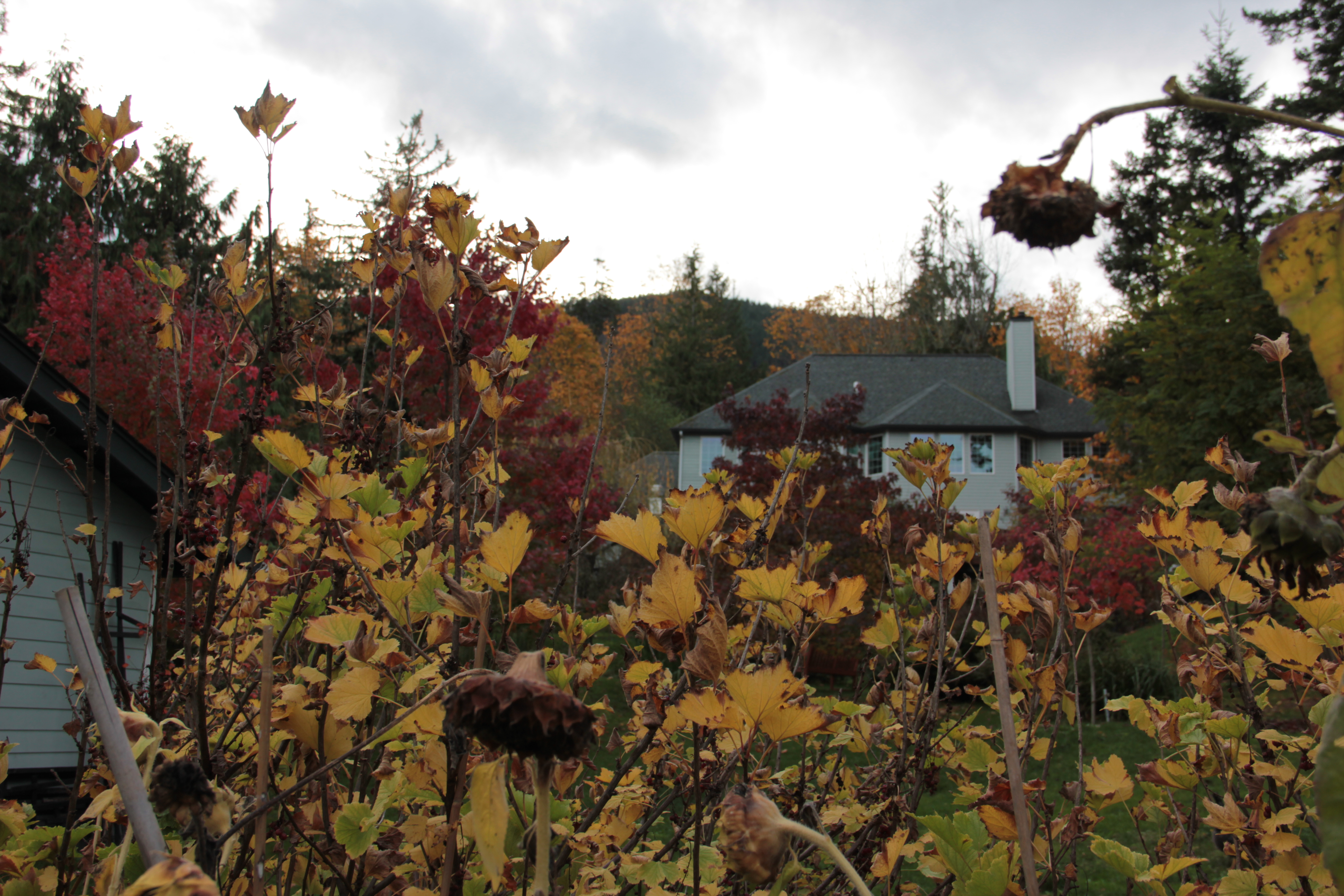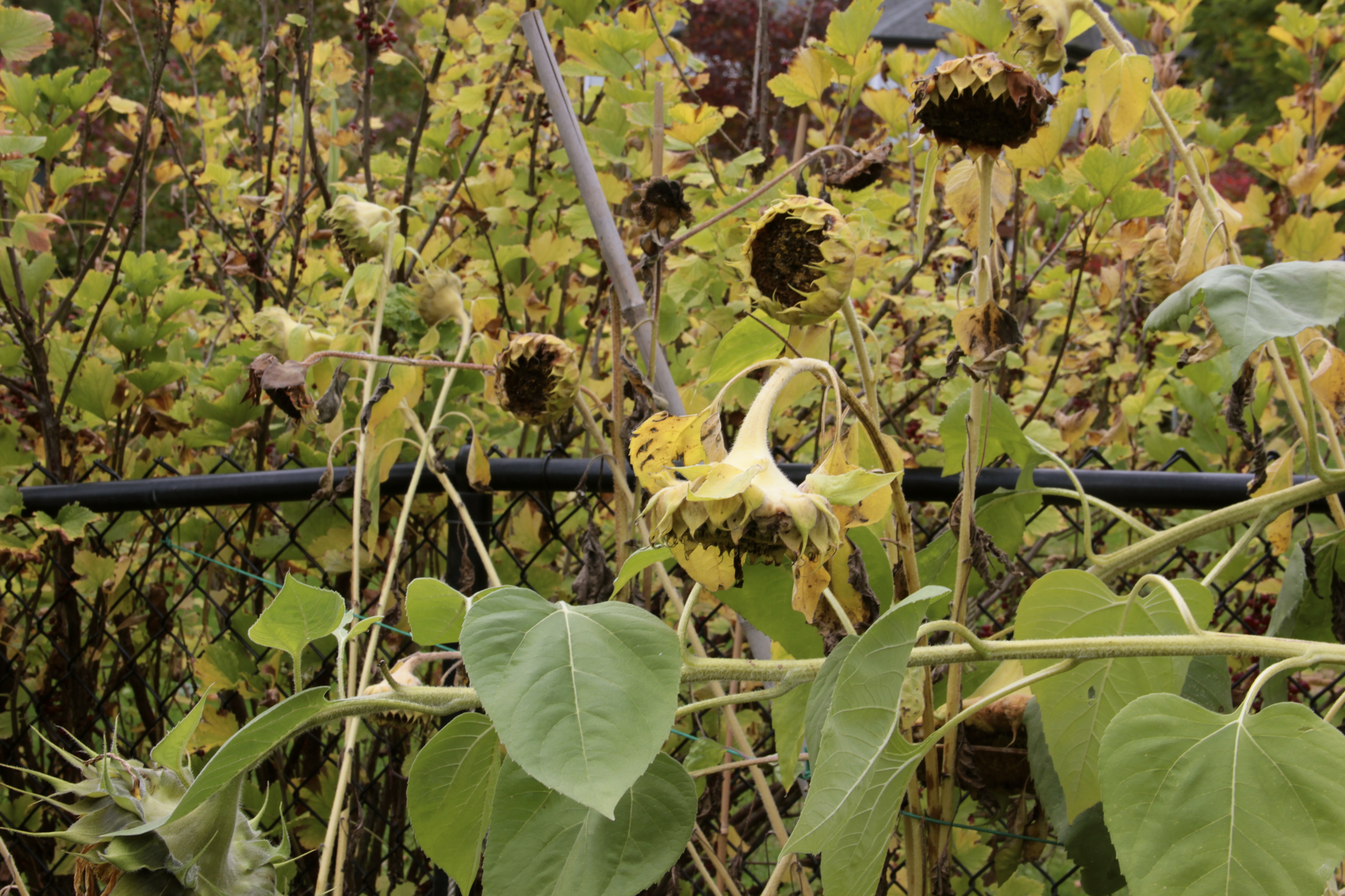 September’s sunflowers have now fed the birds. I’ll cut them down soon, but have enjoyed their weathered appeal mixed with the golden foliage from the currant bushes.