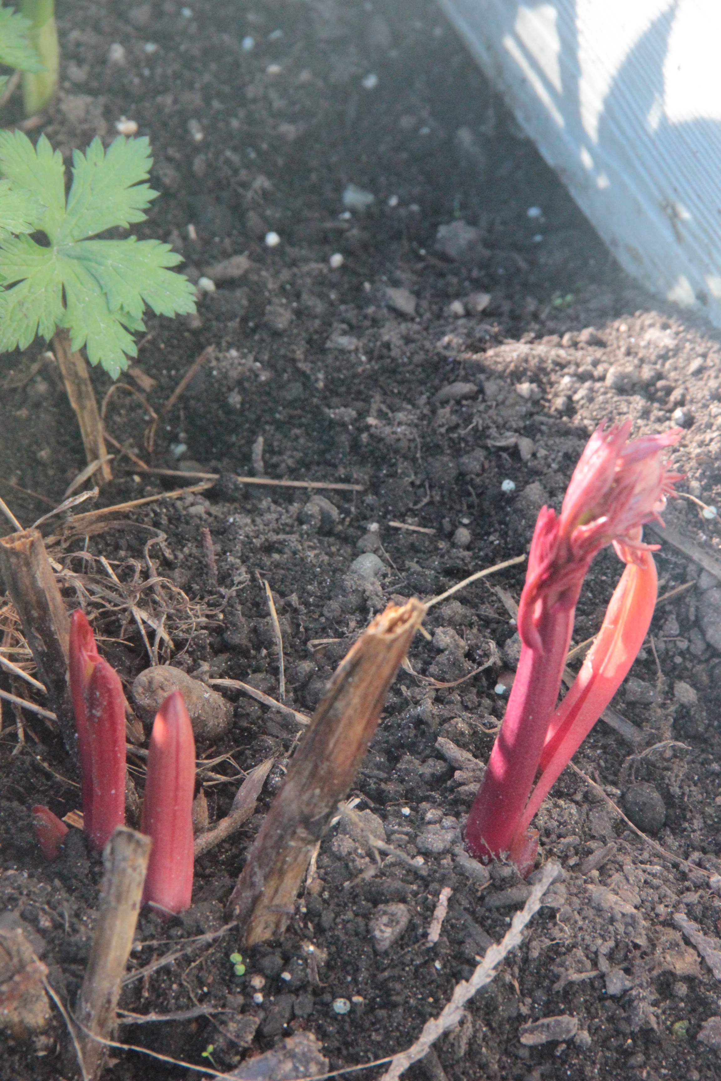 The other, older peonies along the garage are springing to life this week. I wrote about their glorious blooms here.