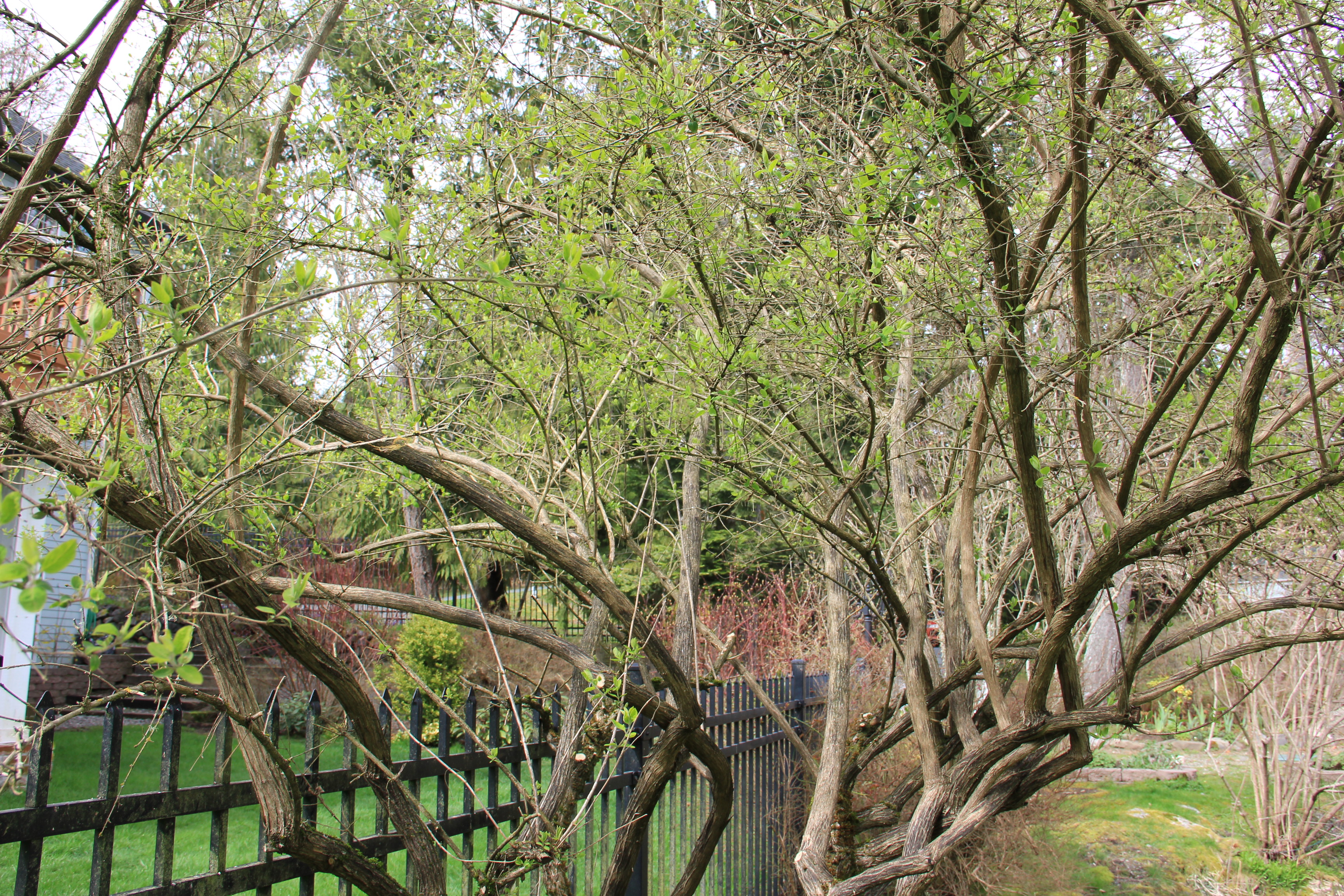 Our pink honeysuckle trees are packed with birds and new leaves, and the weeping cherry is in bloom.