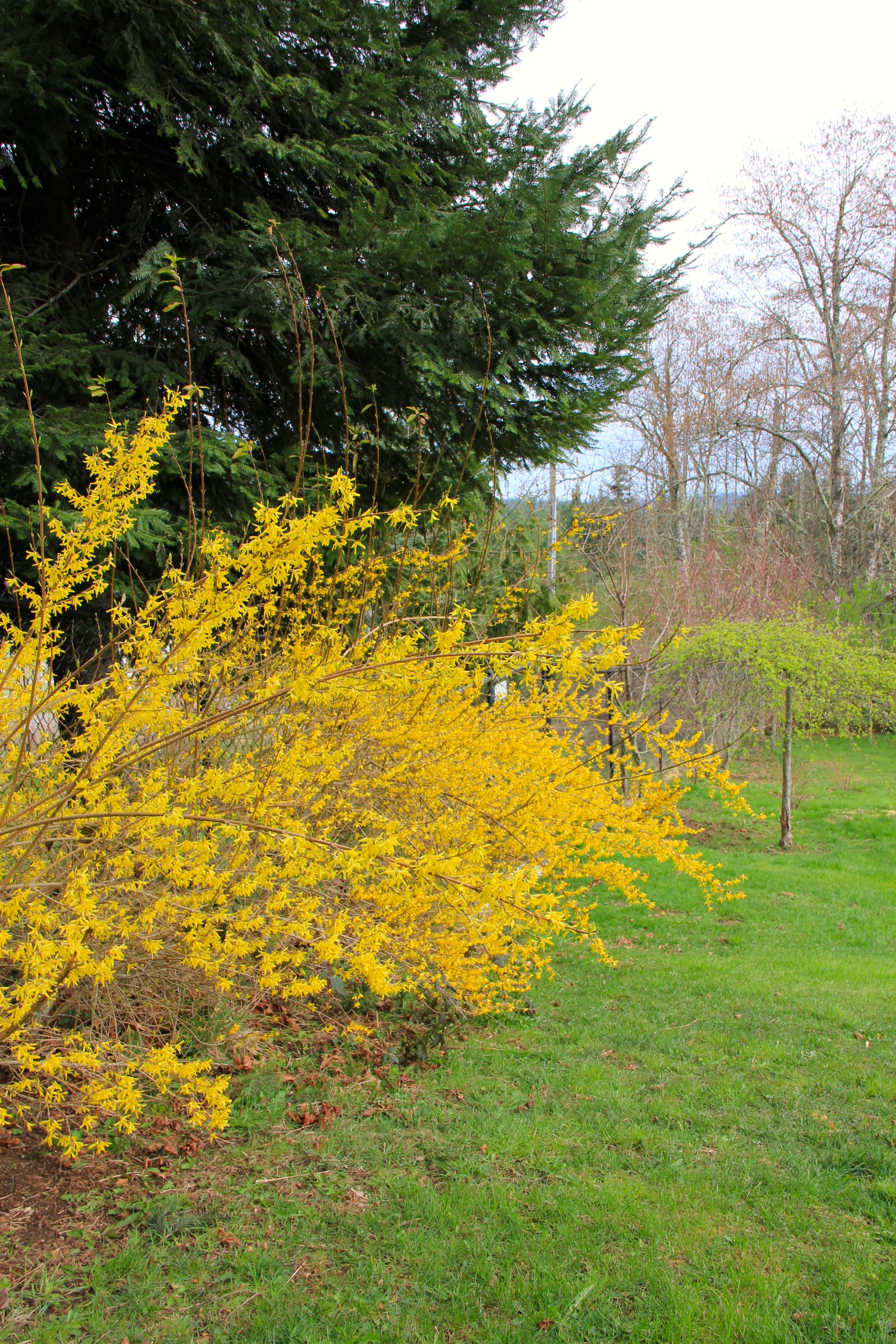 More yellow shines from a long row of the faithful harbinger, forsythia.
