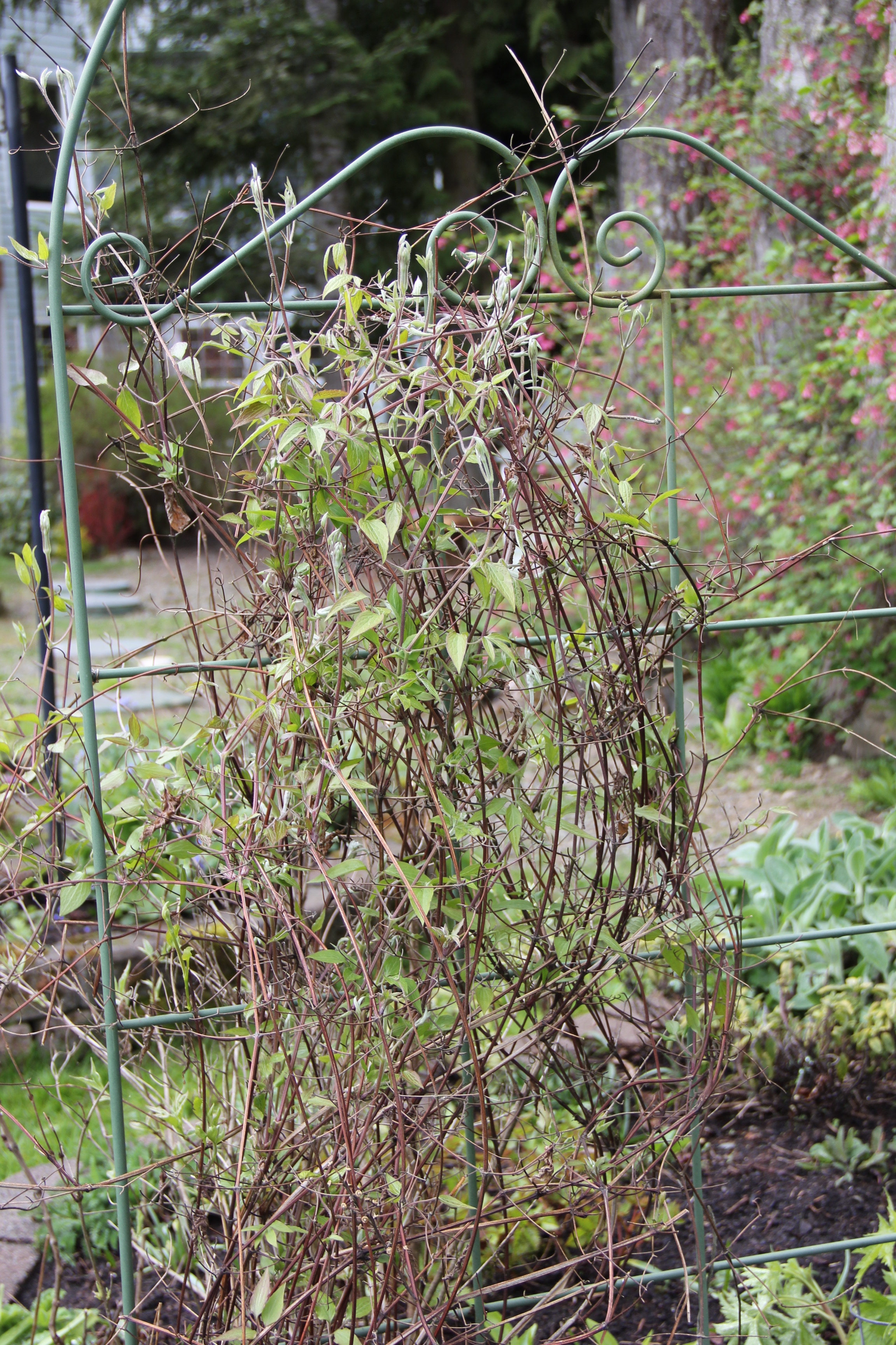 The wide variety of clematis vines all over Coppertop, from the front stoop to down along the garden shed, have begun their creeping growth, each day displaying more leaves and buds.