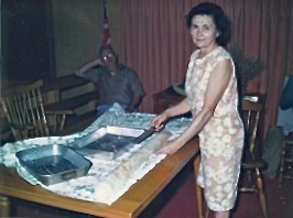 The forthcoming plums will make for wonderful fresh plum dumplings, or knedle (knedliky plural). Since I’ve become comfortable with making jams and jellies in the past year, I hope to eventually have a large enough harvest to make lekvár, a plum jam we always called prune jelly. I have a dear picture in my memory of Dushinka in her babushka or kerchief stirring the lekvár atop the stove for hours each time she’d visit us in California. Almost black when fully simmered, tangy-sweet lekvár is tasty spread on almost any bread. It’s also used as a filling for palacinky (crepes) and kolache (sweet, rolled bread), Another yummy treat I remember is štrúdľa, strudel made from dough pulled tissue-thin on our kitchen table and rolled up with different fillings. It’s been said that the dough for strudel is pulled thin enough if you can read a love letter through it! Here’s Dushinka doing what she did best, circa 1960s. In the second photo she’s being watched by her loving husband, Libor.
