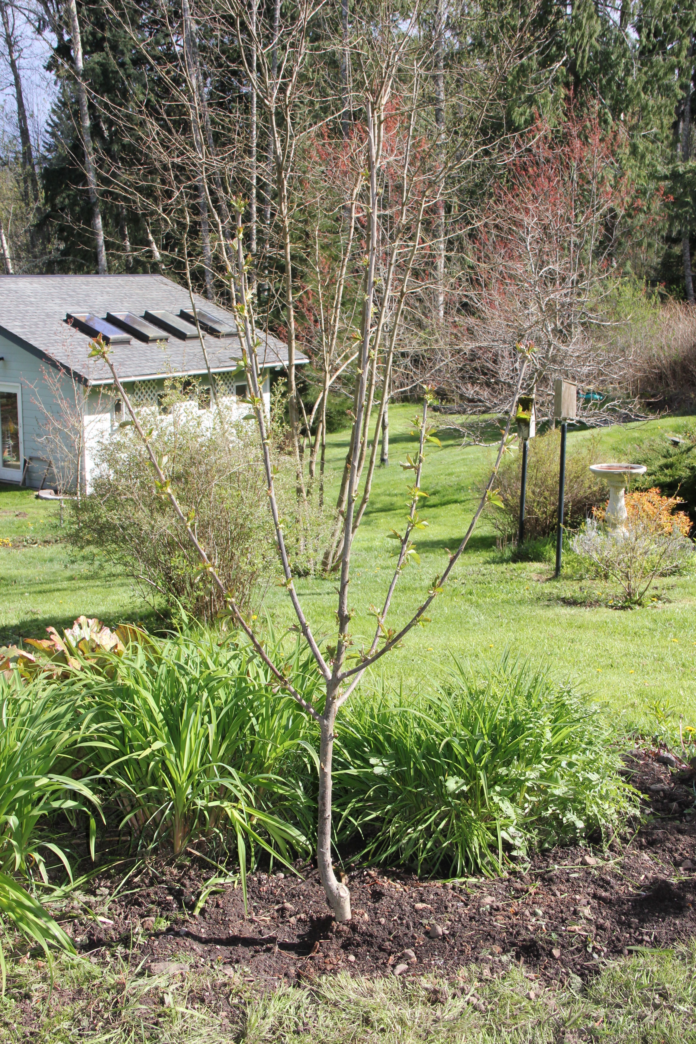 - Planted young, semi-dwarf Lapins Cherry tree at the top of lupine hill. Tag reads: “The fruit is quite large with a deep red color and lighter red flesh. This variety is self-fertile (also pollinates Rainier!). Ripens early to mid-season. Average size 15 ft. tall and 10 ft. wide.” early April