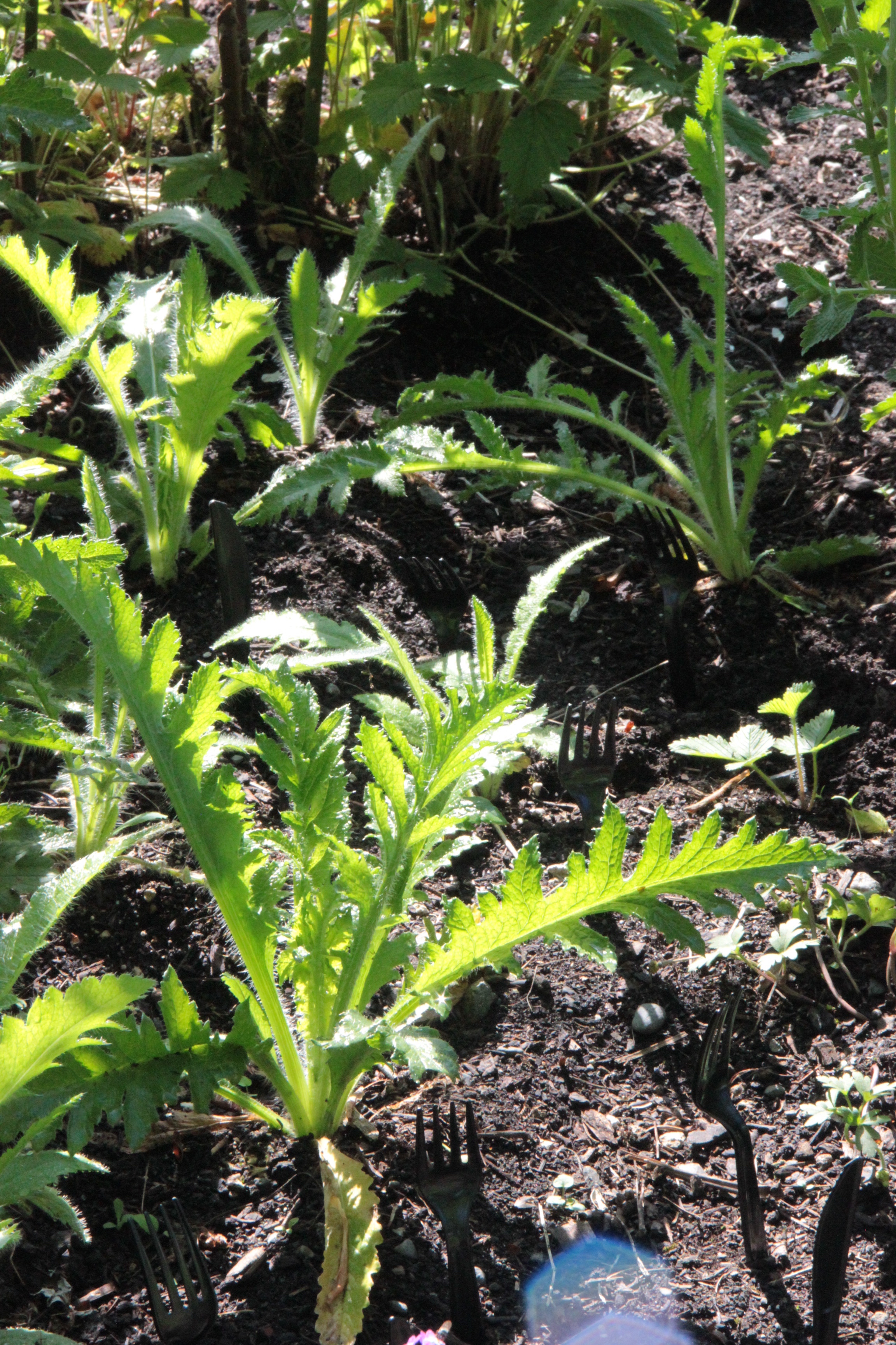 I’d read online that others have tried inserting plastic forks into the bare dirt to discourage hens, so yesterday I found and purchased over 200 pieces of black plastic utensils at a dollar store. I promptly placed my $5 investment in the ground. I chose black so they would blend in from afar.