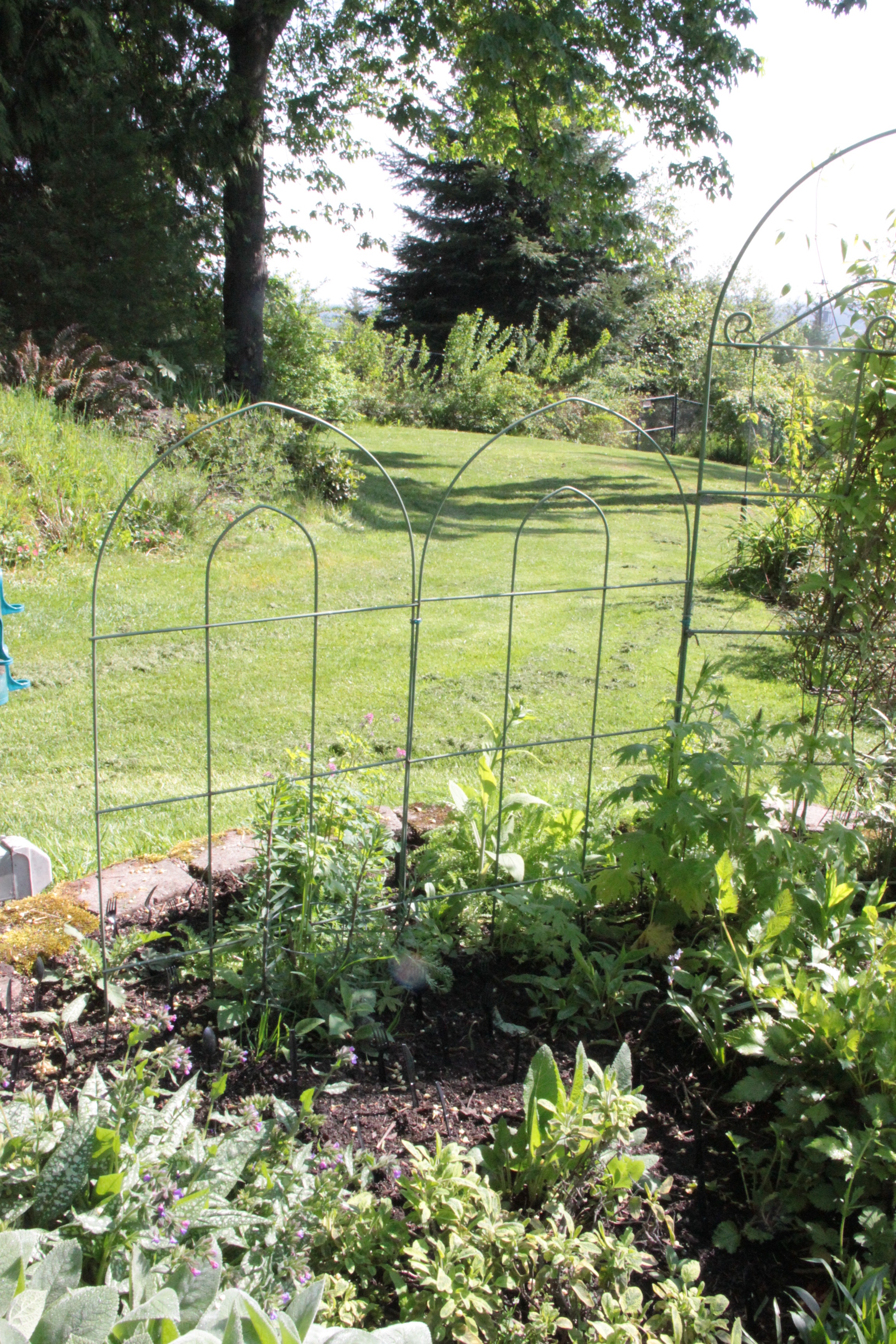 As plants such as catmint, heuchera, polemonium, geum, and poppies grow to fill gaps, I’ve been looking for a way to keep the hens out of the bare spots where they love to make a mess scratching and pecking. The stake and string barriers were too easy for them to pass through, and low fences were practically an invitation for them to stretch their wings and hop over.