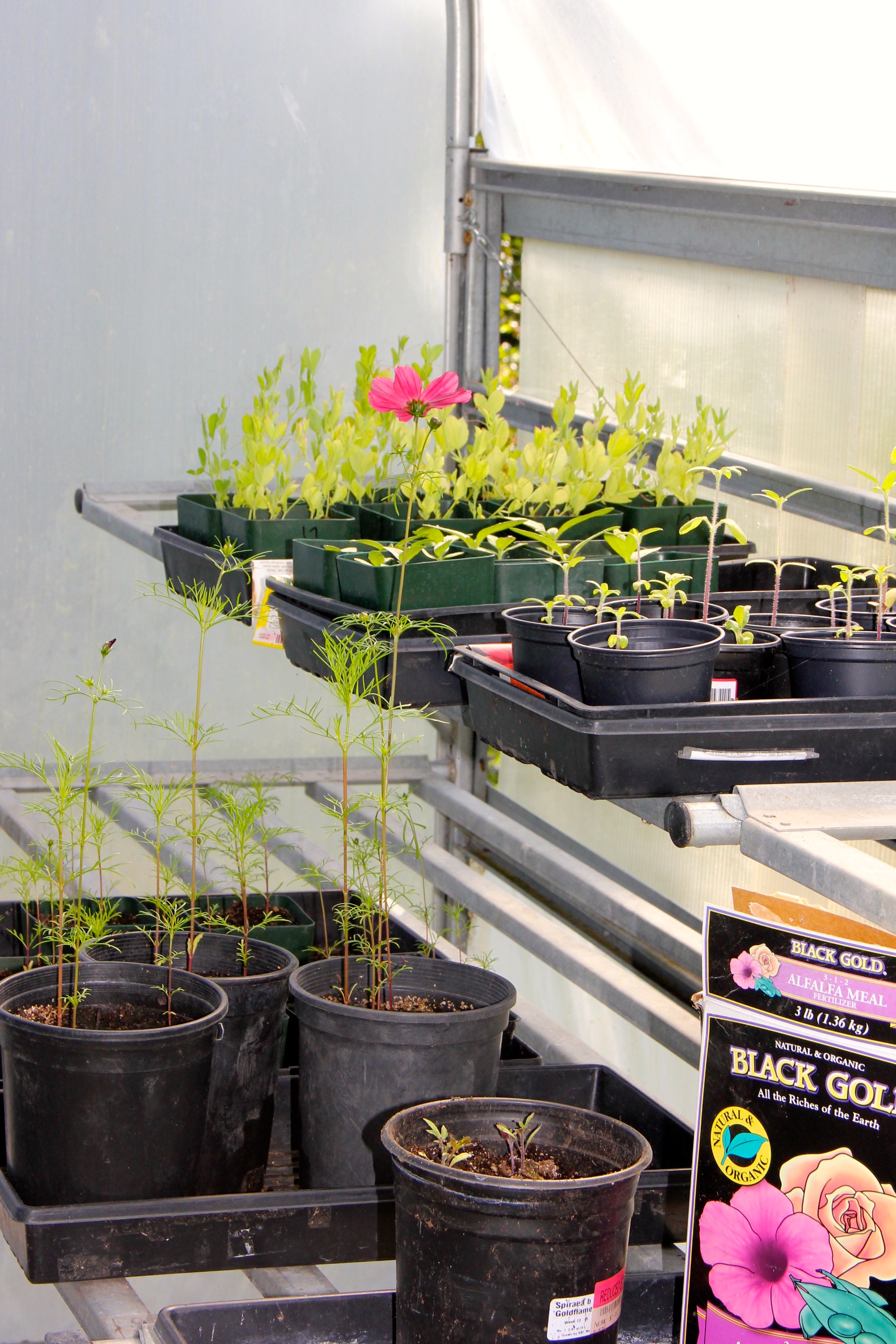 Besides being a huge veggie month, May has been my month for moving the seedlings and the over-wintering perennials outdoors. Cosmo seeds I received for Christmas and planted during winter months have flourished. Last week I was surprised and delighted to be greeted by the first blooms when I entered the greenhouse.