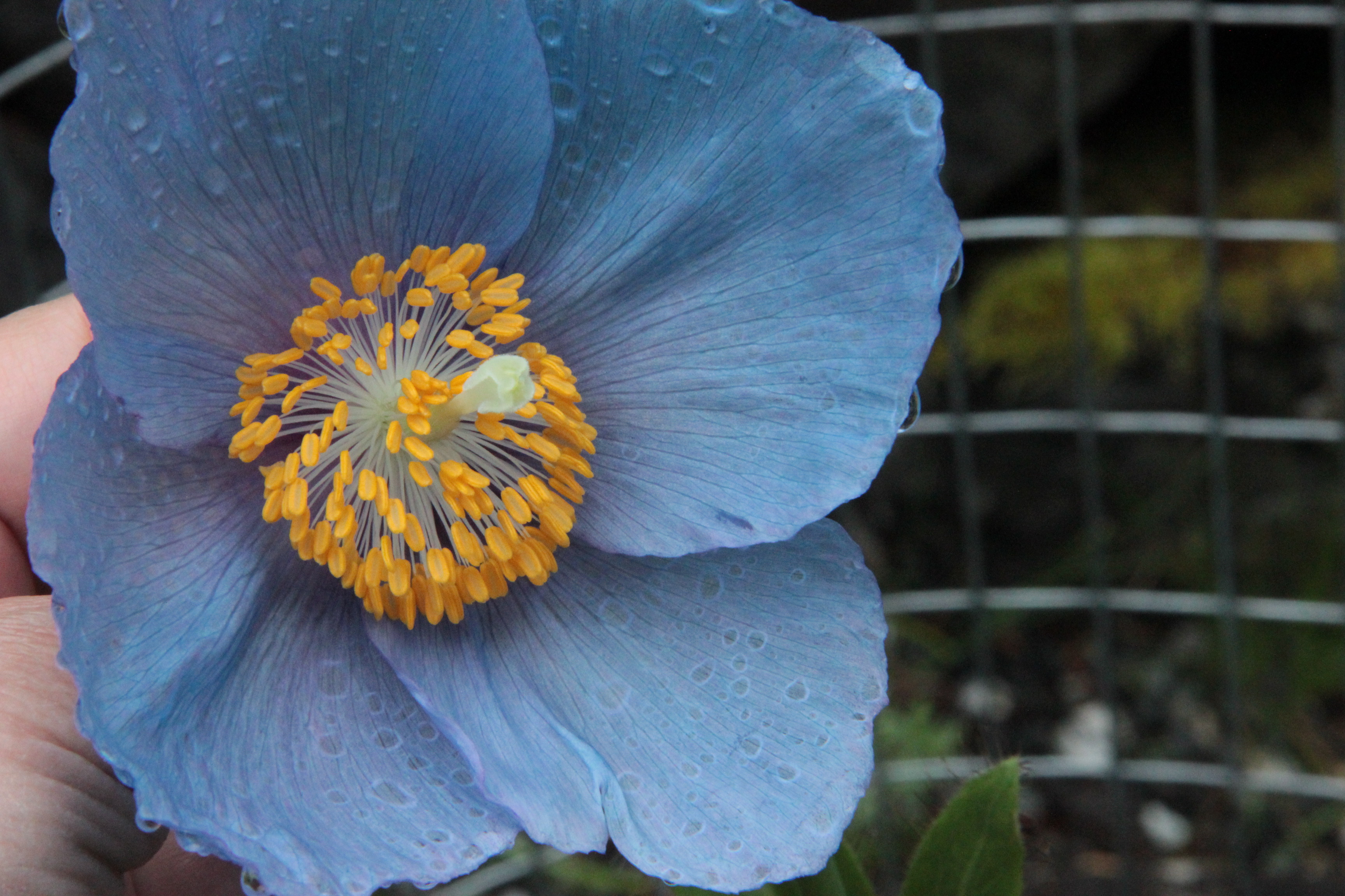 - Enjoying the blossoms of the gorgeous Himalayan blue poppy (and keeping the hens away). mid May