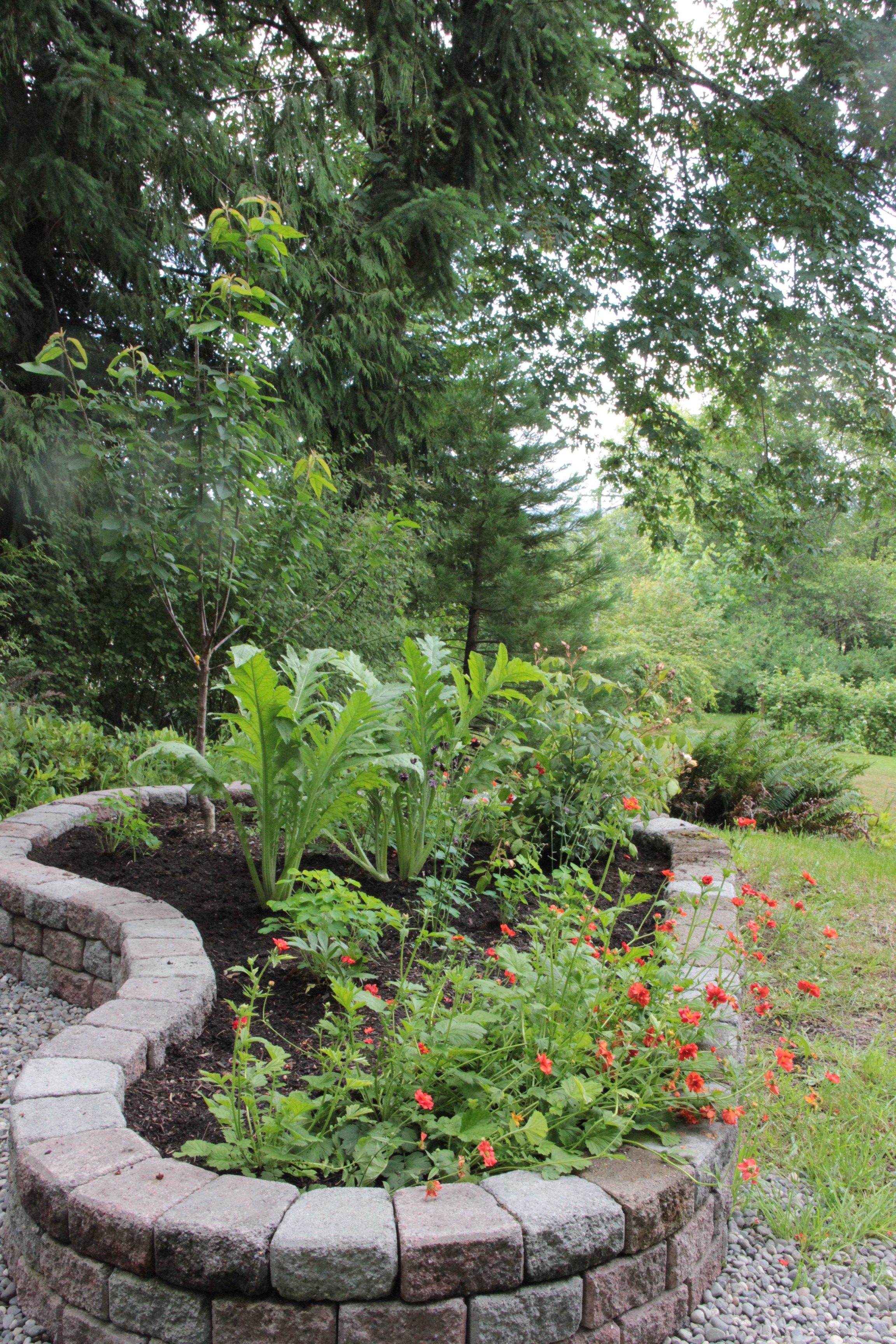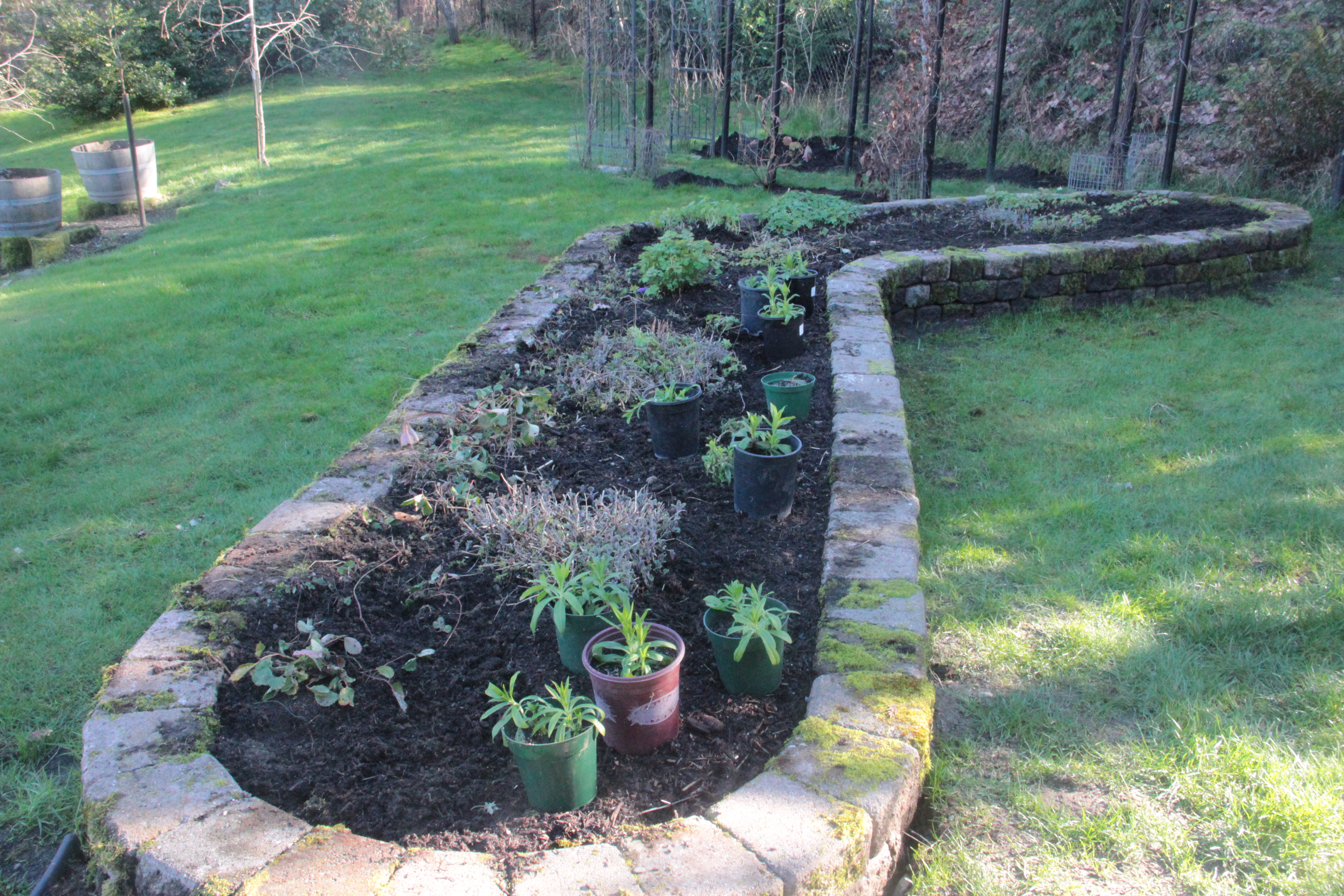 The perennial bed by the hot tub/former dog yard a few months ago (note the black arches and vines in background):