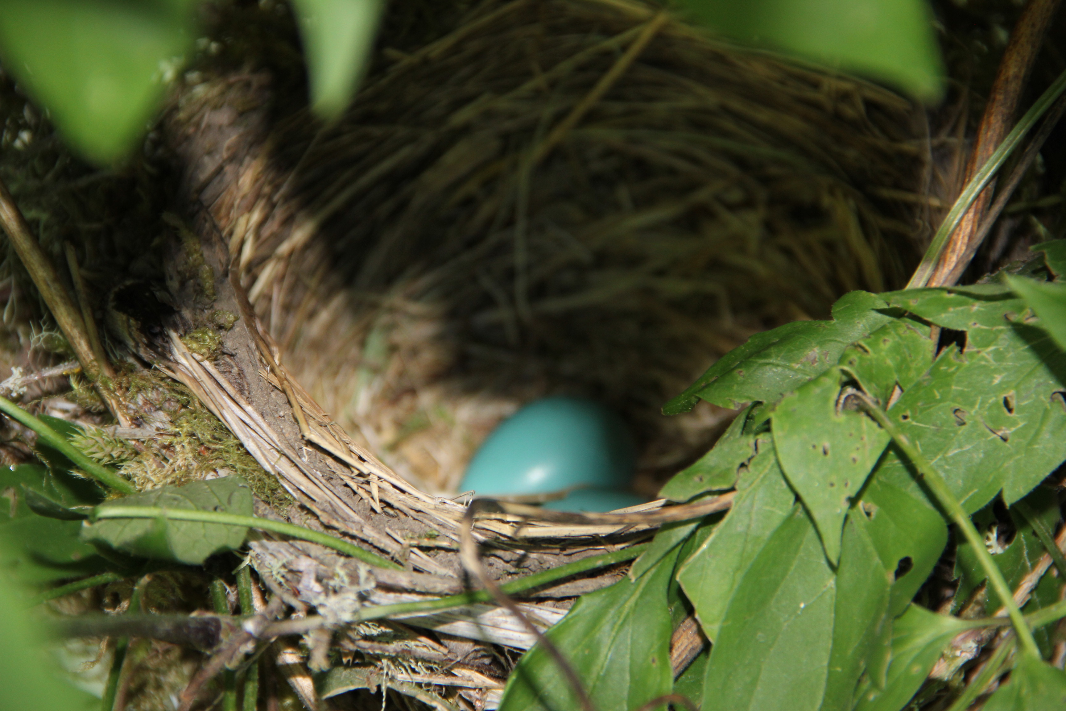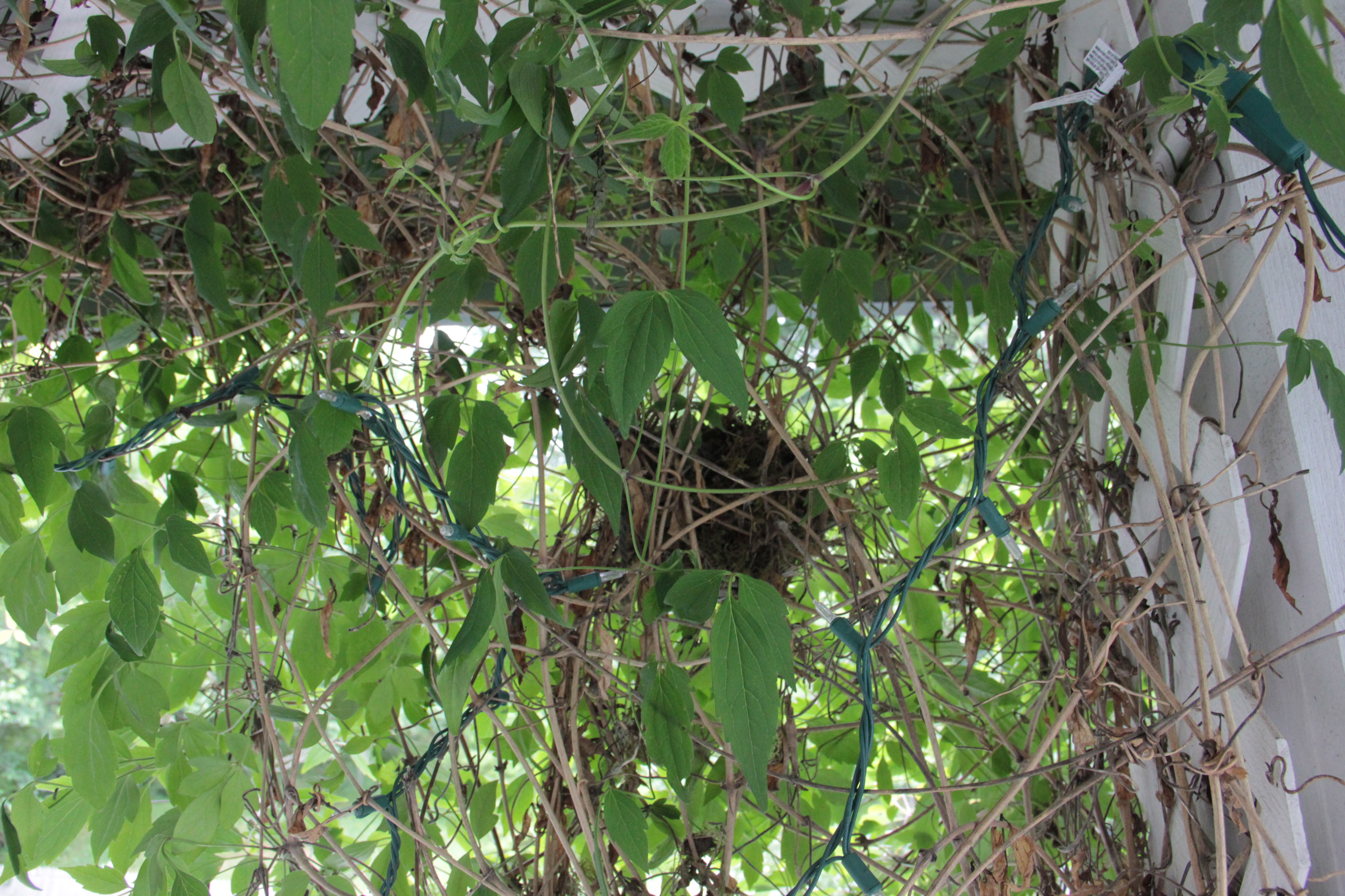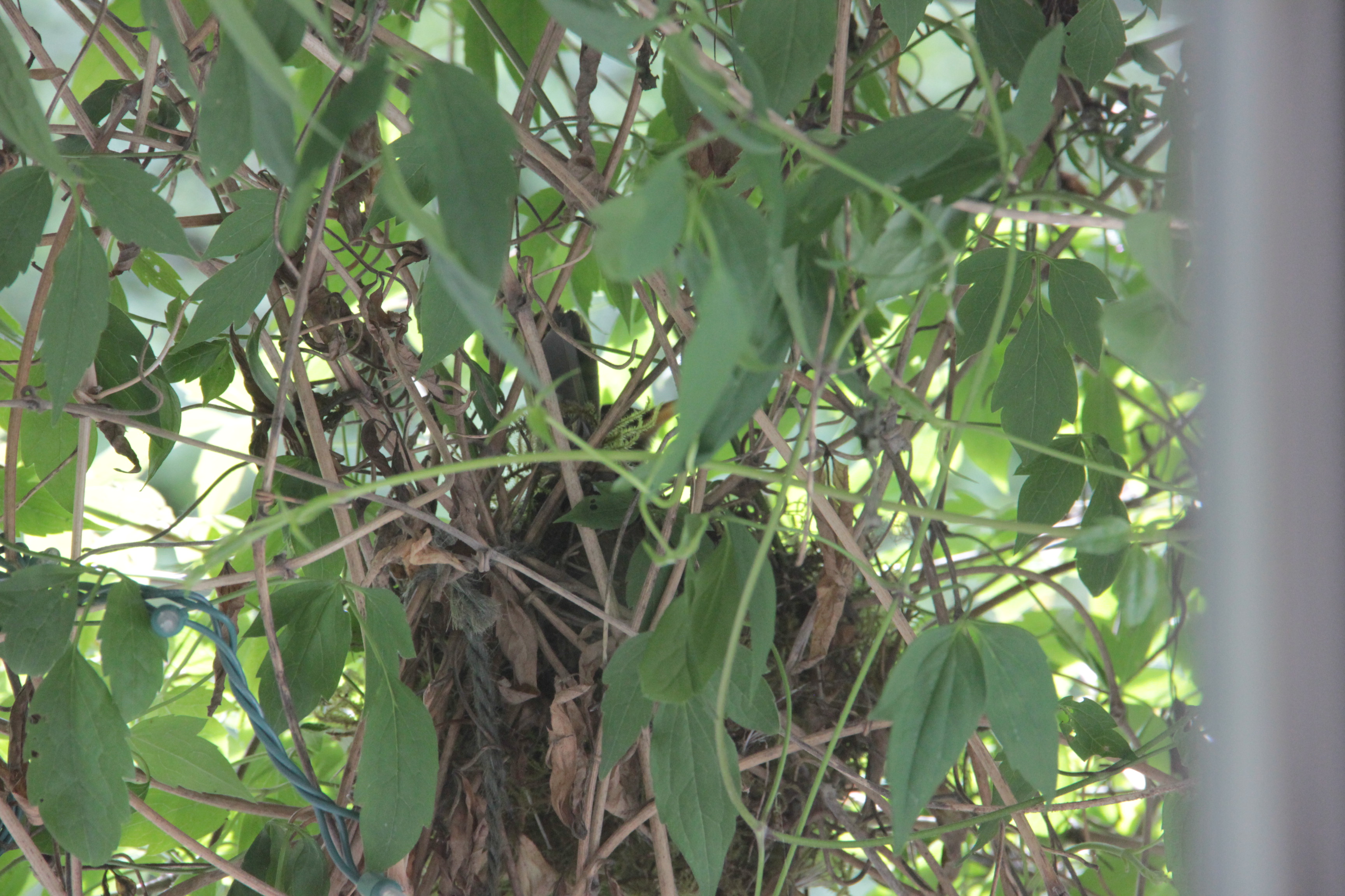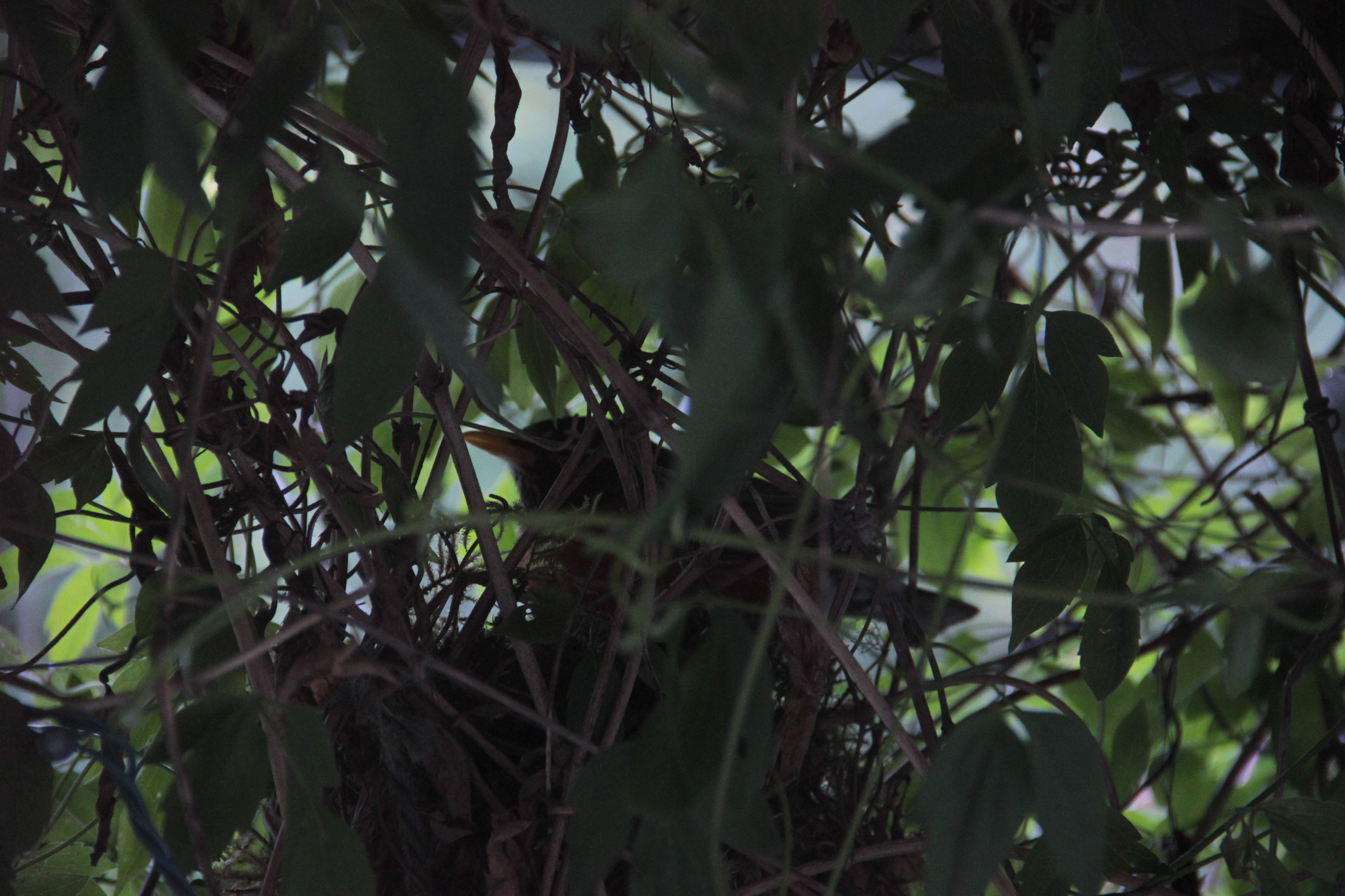 Our clematis vine at the front door is the home of a lovely new robin’s nest. From out front, the nest is invisible, but from inside our entry hall, I often have a view of the mother bird doing her thing at all hours.