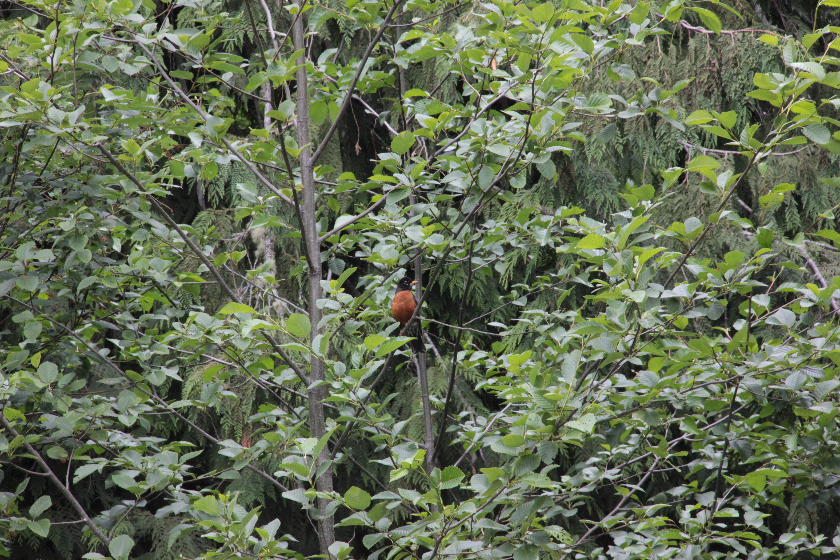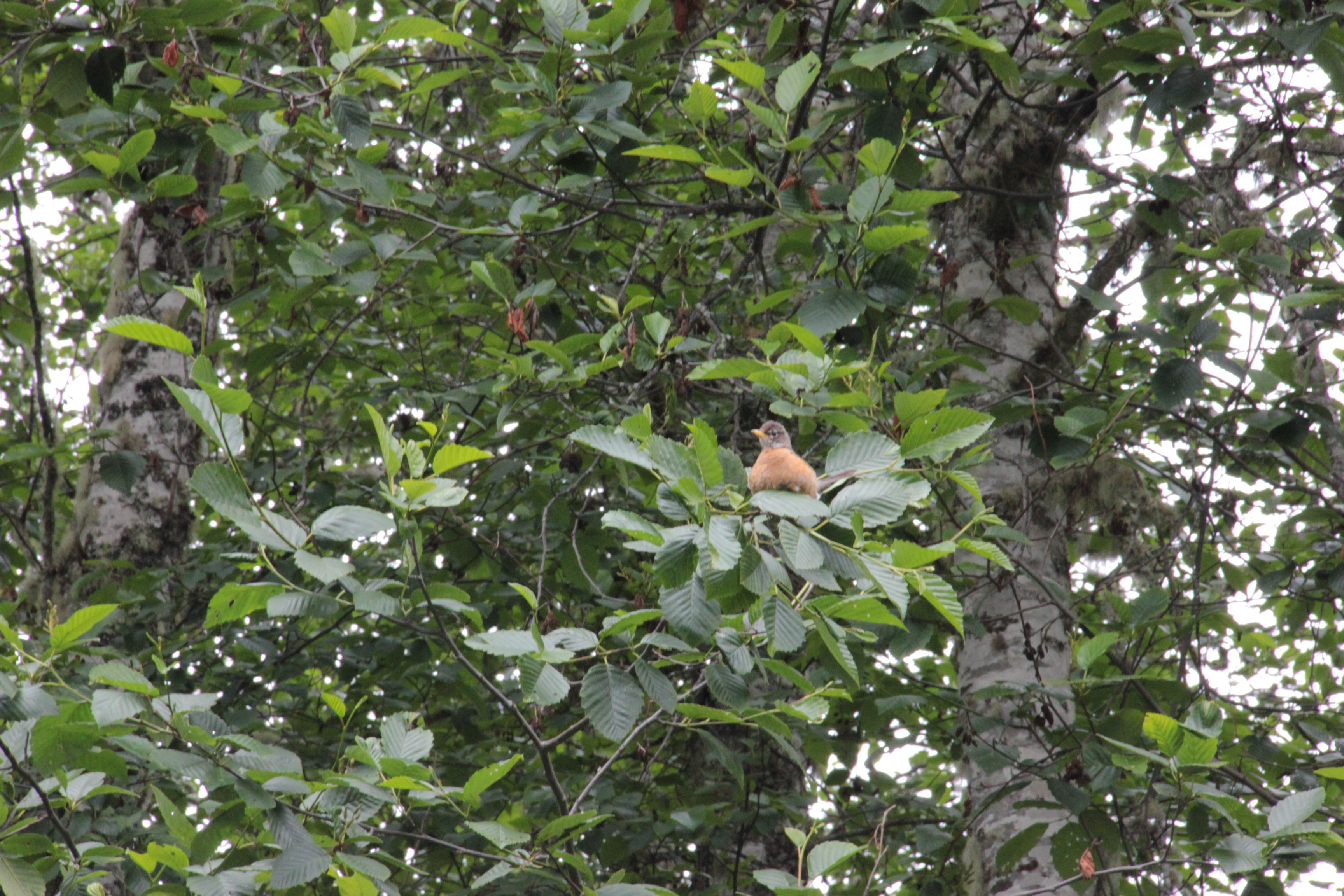 Usually we depart our home through the garage, but lately when I walk out the front door, the nest is quickly vacated, and both father and mother bird proceed to chirp loudly while circling me. They alight on branches of nearby alder trees and watch while I dare to water the plants near the front stoop. I make sure to fill the birdbath located six feet from the nest. Mothers like a good soak.