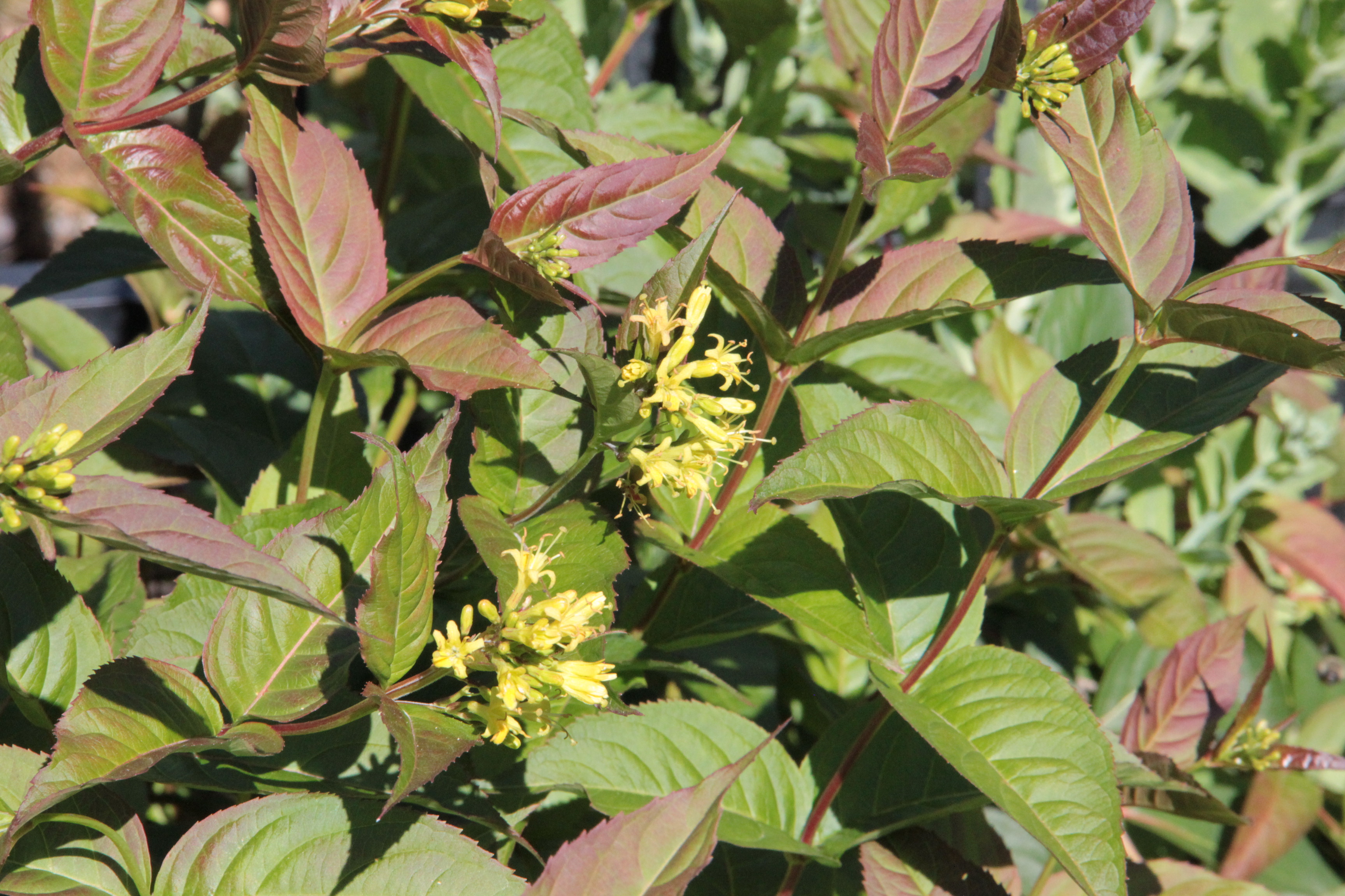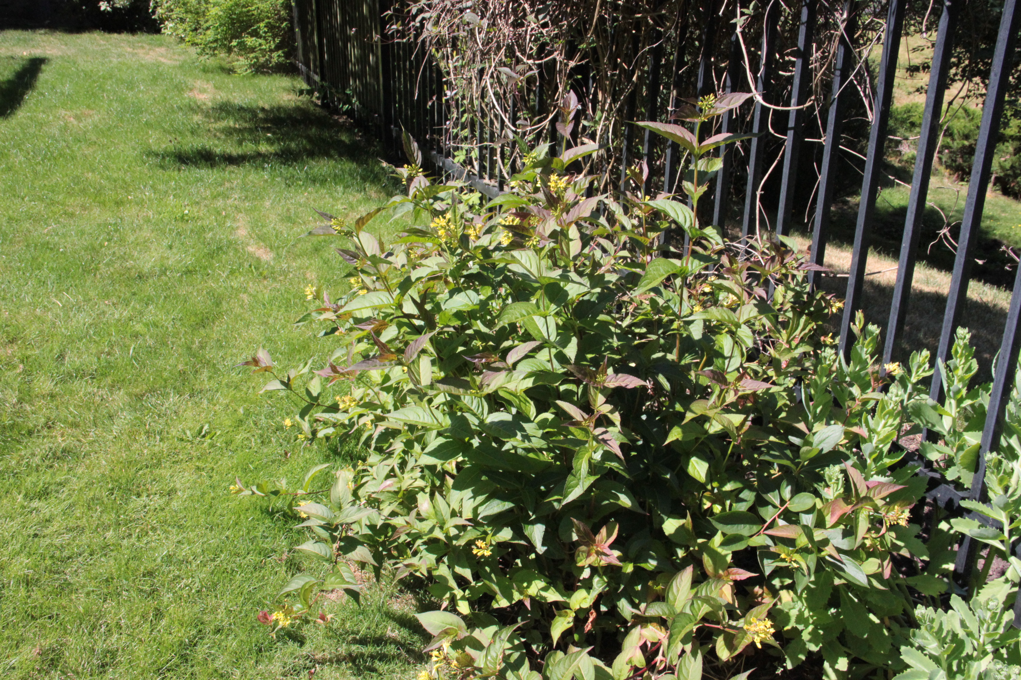 The shrub with yellow blooms remains a big question mark. The closest I’ve come to it in my research is a weigela variety called ‘Canary’, but I’ve yet to read about the red-tinged foliage. I’d appreciate any help readers might provide! UPDATE in Summer 2021: Well it only took me about SIX YEARS to finally identify the yellow blossom plant correctly as a Diervilla ‘Kodiak Red.’ It continues to thrive here.